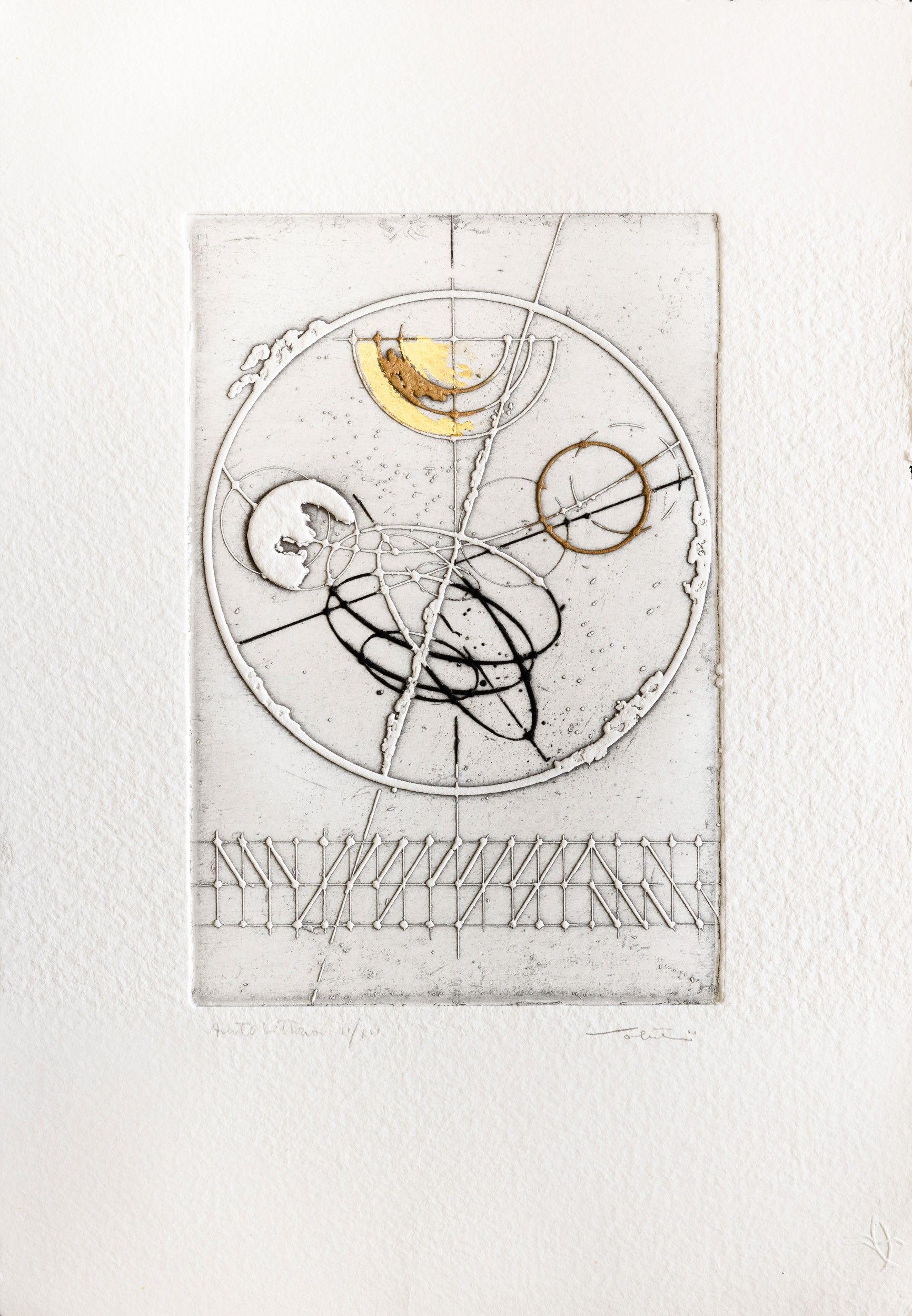 acquaforte con retouche con foglia d'oro, Largh. 34,5 - Alt. 50 Cm 1993 es. ante litteram II/III dimensioni lastra: cm 29,5x19,6 firmato in basso a destra, numerato in basso a sinistra carta Colombe tiratura 69 + X I+ 5 p.a. stampatore Sardella, Milano