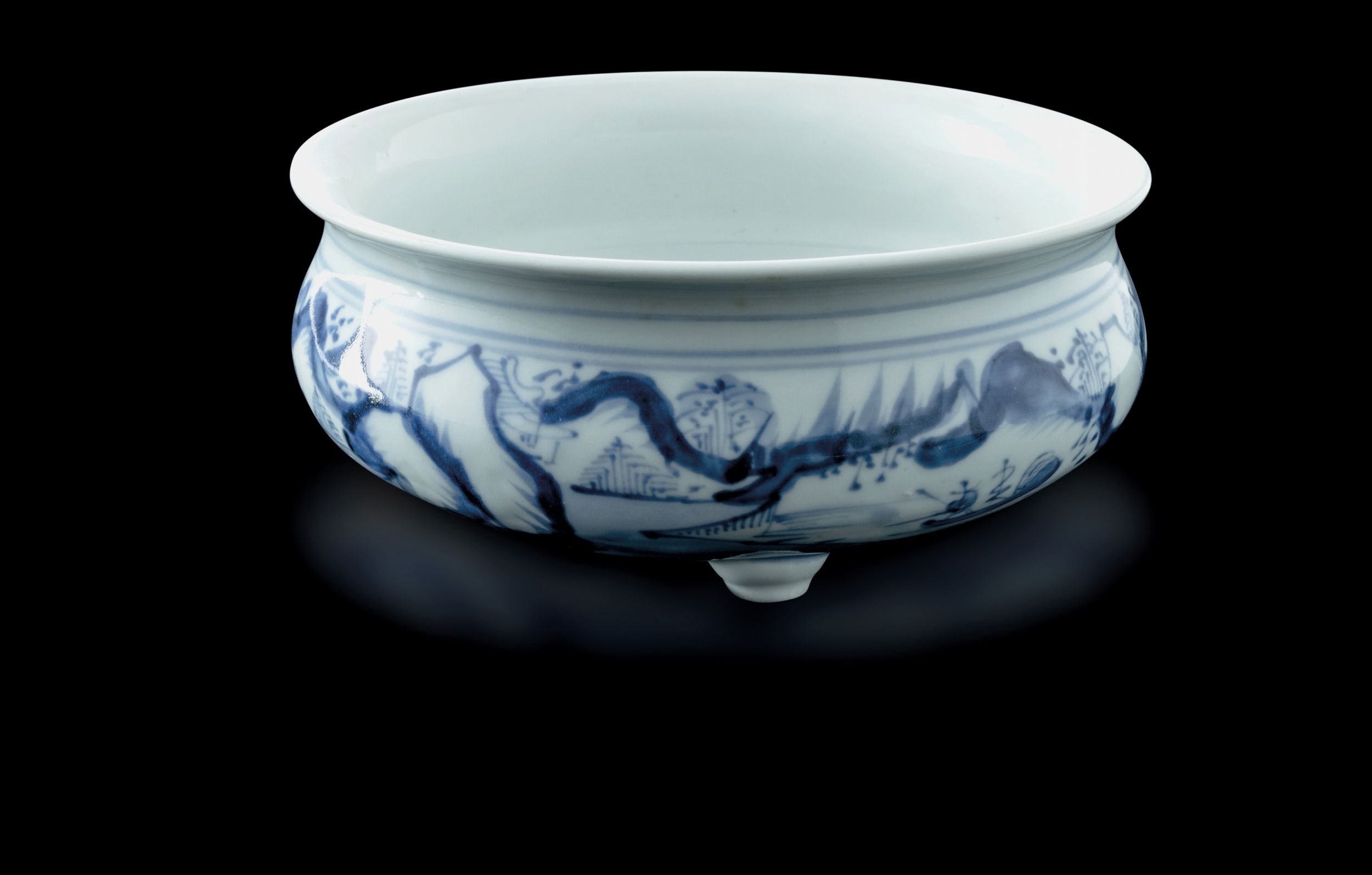 Censer tripode in porcellana bianca e blu a decoro paesaggistico, Cina, Dinastia [..]