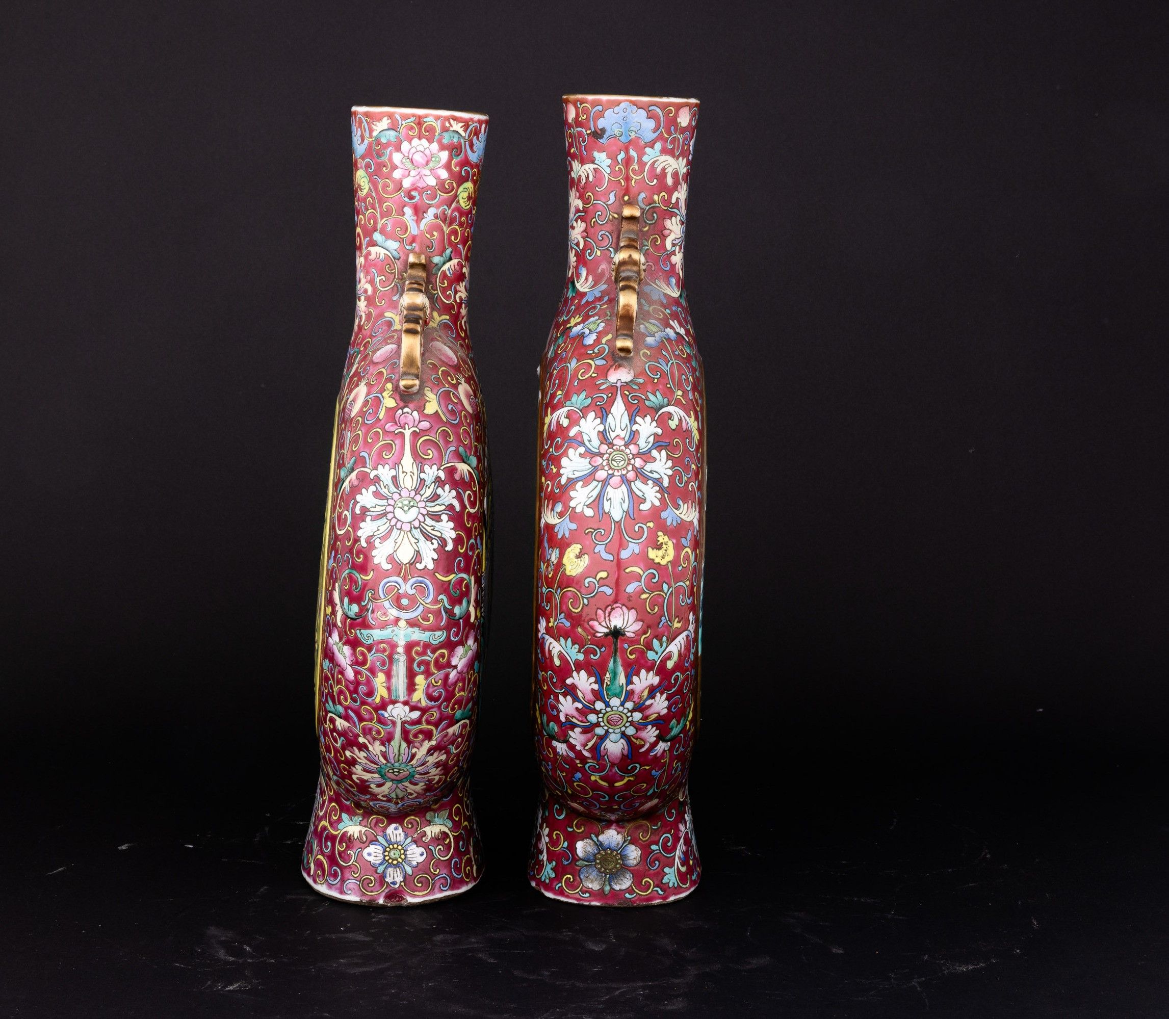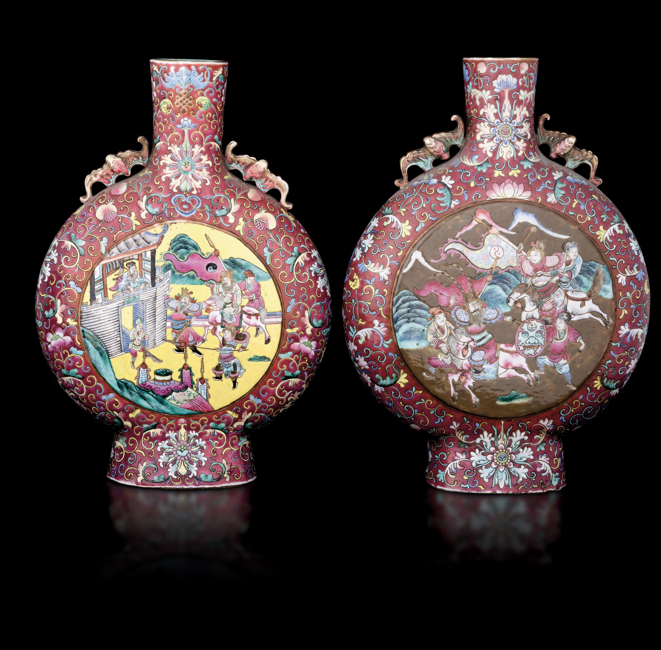 Coppia di Moon Flask in porcellana Famiglia Rosa con guerrieri e fiori, anse sagomate [..]