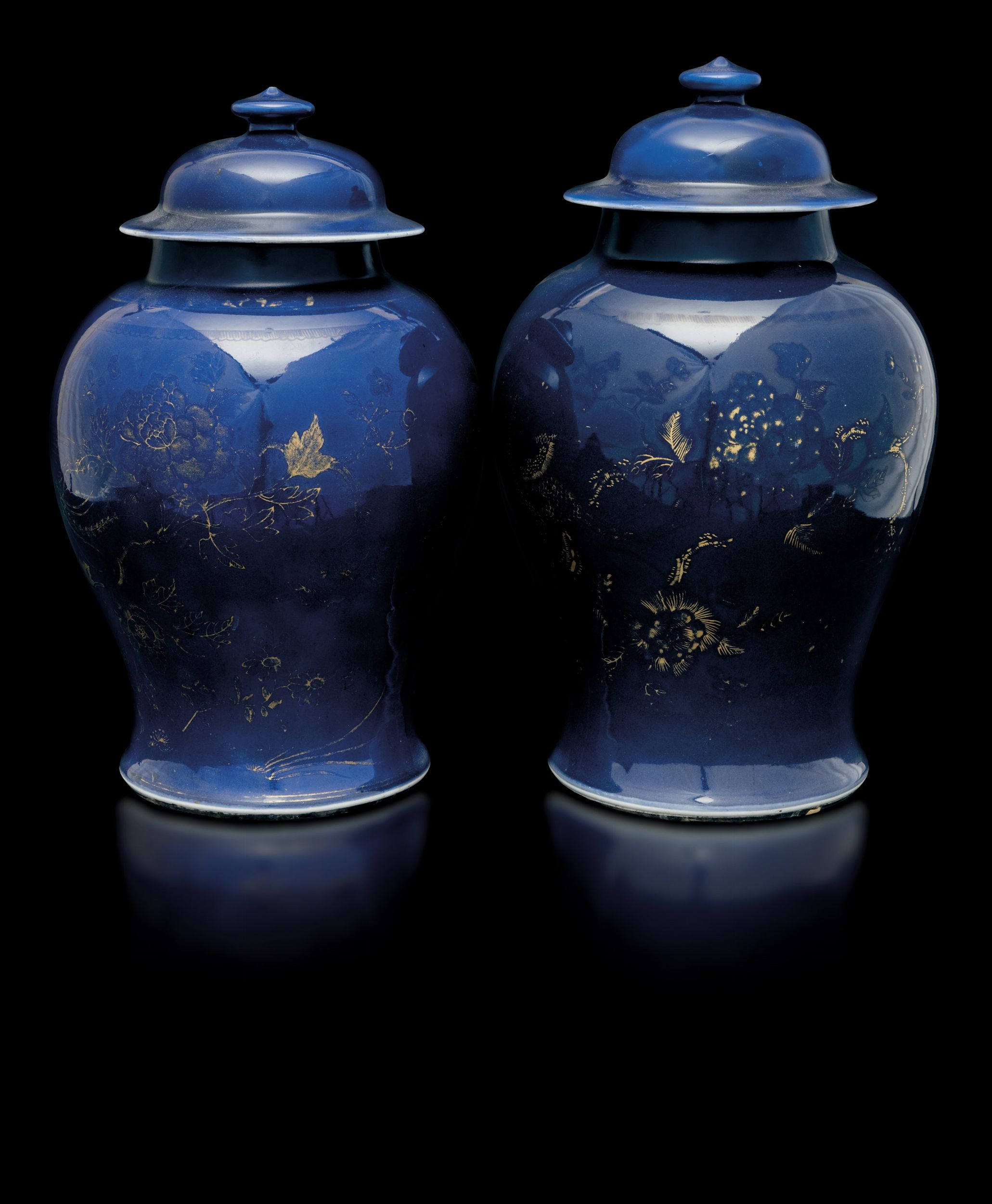 Coppia di potiche in porcellana monocroma blu poudrč a decoro naturalistico lumeggiato [..]