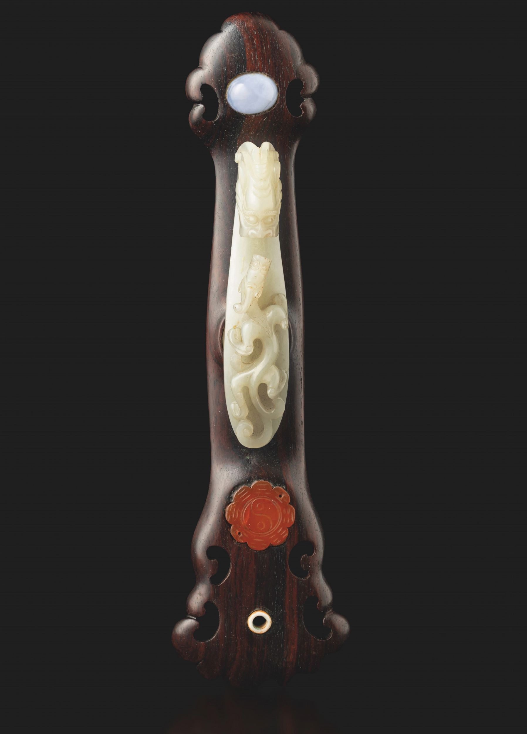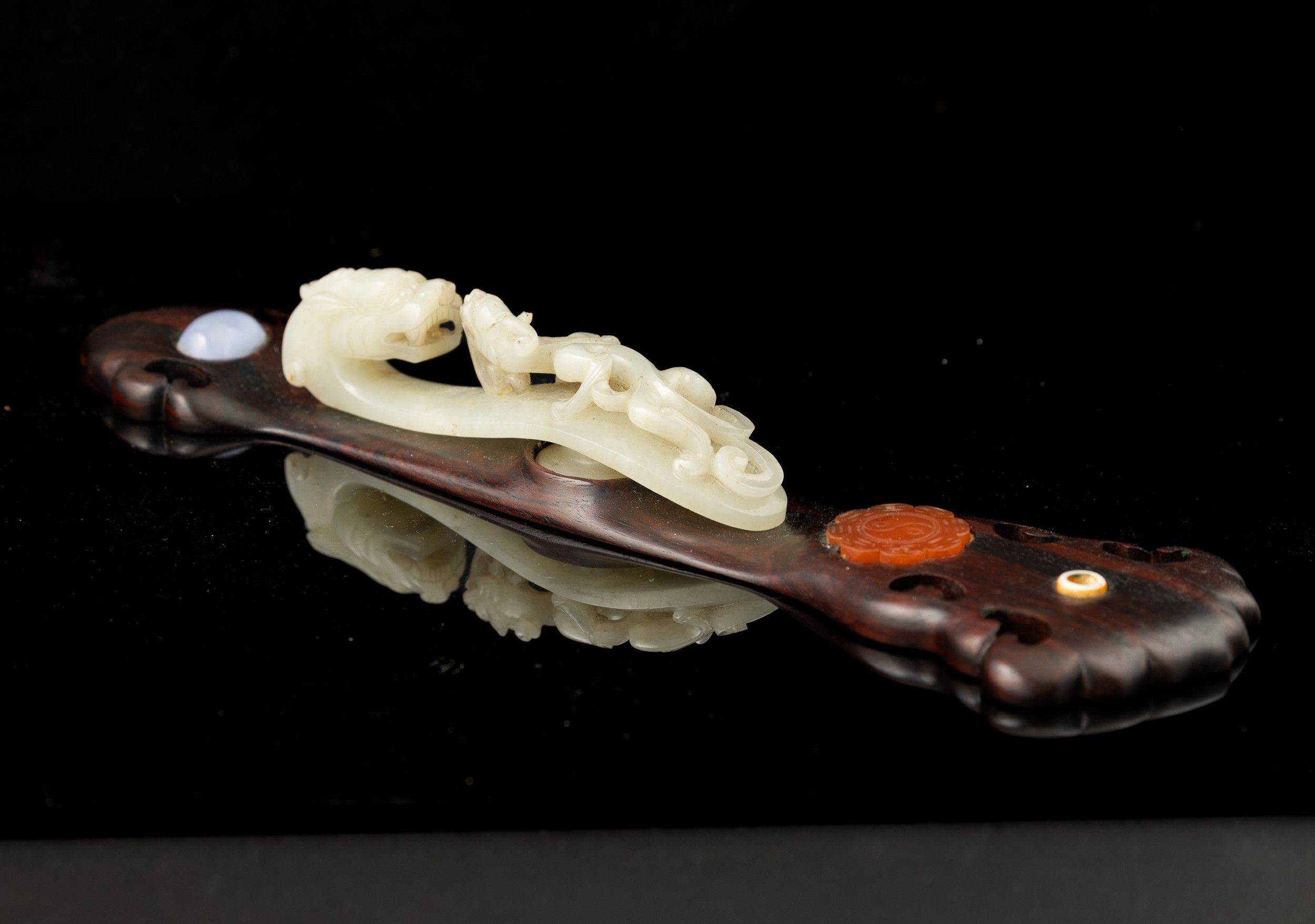 Fibbia in giada con decoro di drago su legno di Homu con inserti in pietre dure, [..]