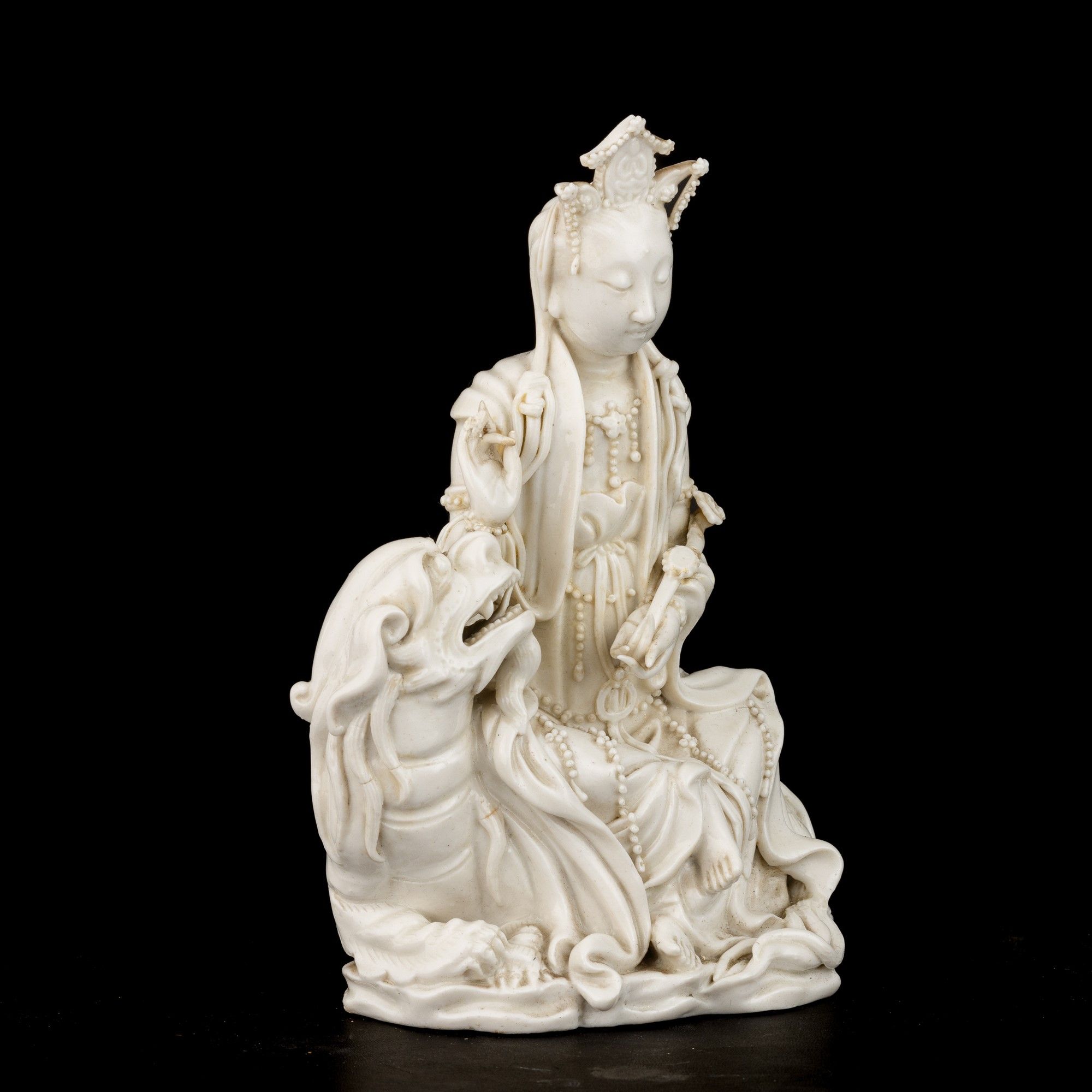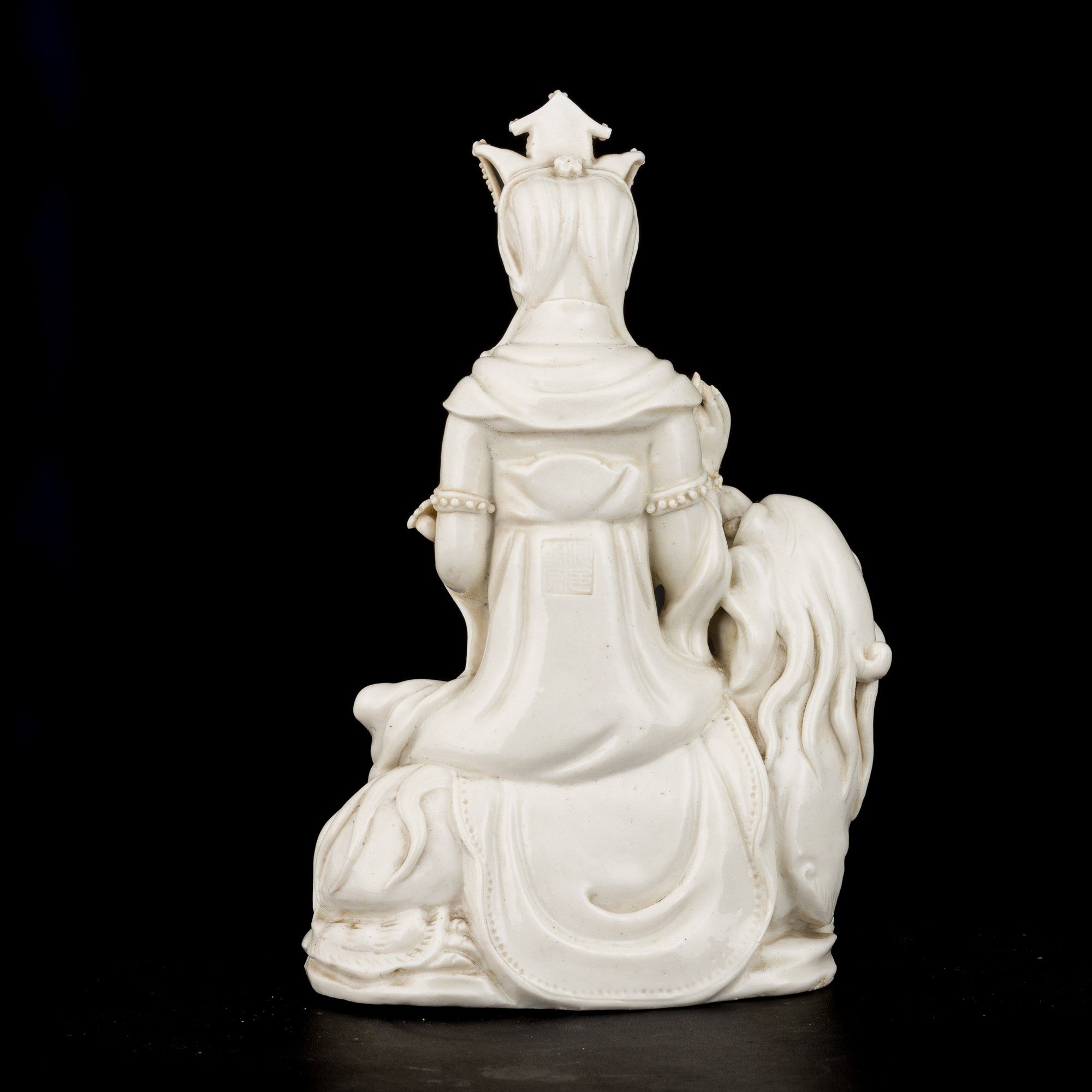 Figura Guanyin su leone in porcellana Dehua, Blanc de Chine, marca incussa Dehua [..]