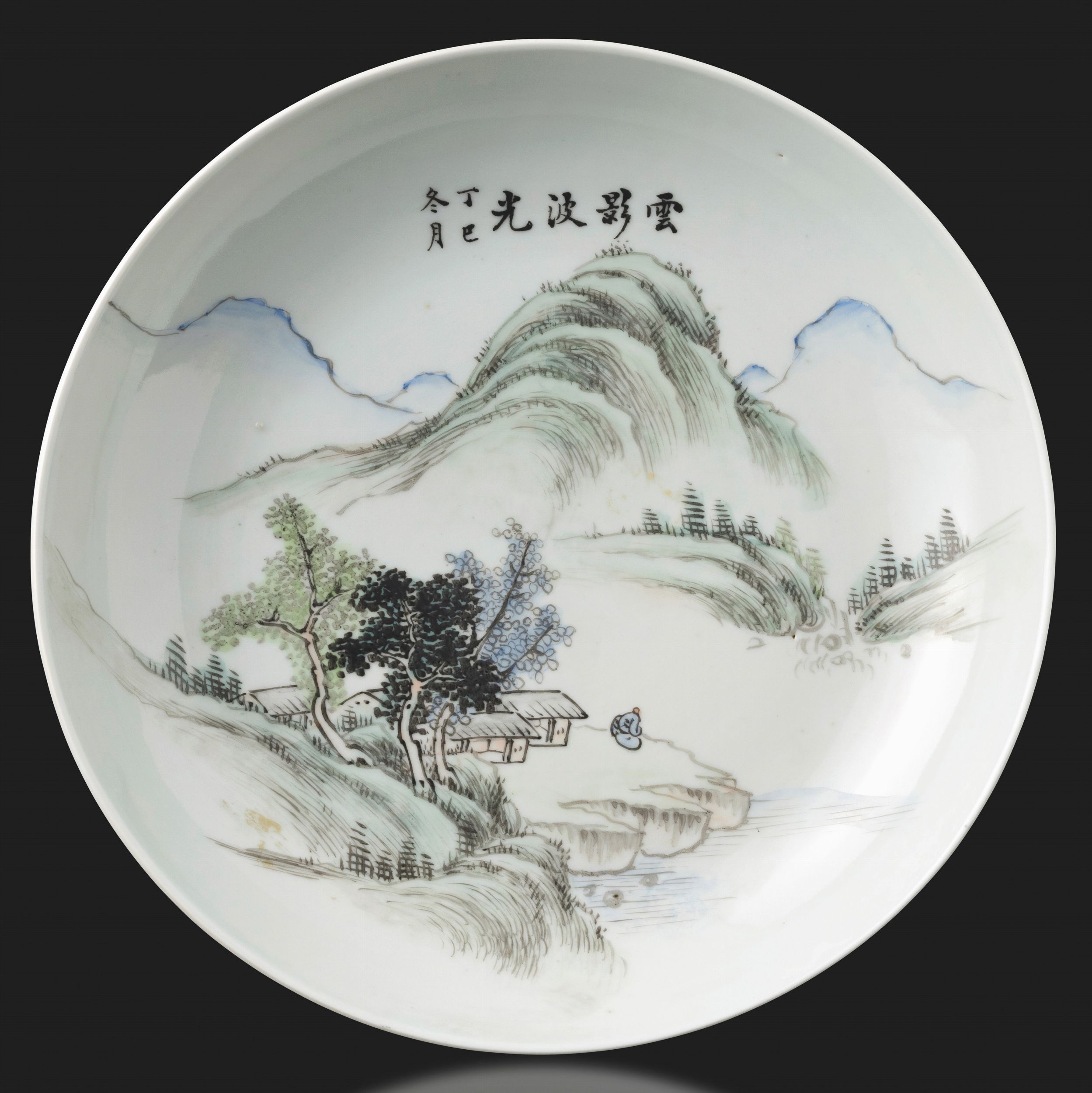 Piatto in porcellana raffigurante paesaggio montano e scritta “mese di inverno dell’anno [..]