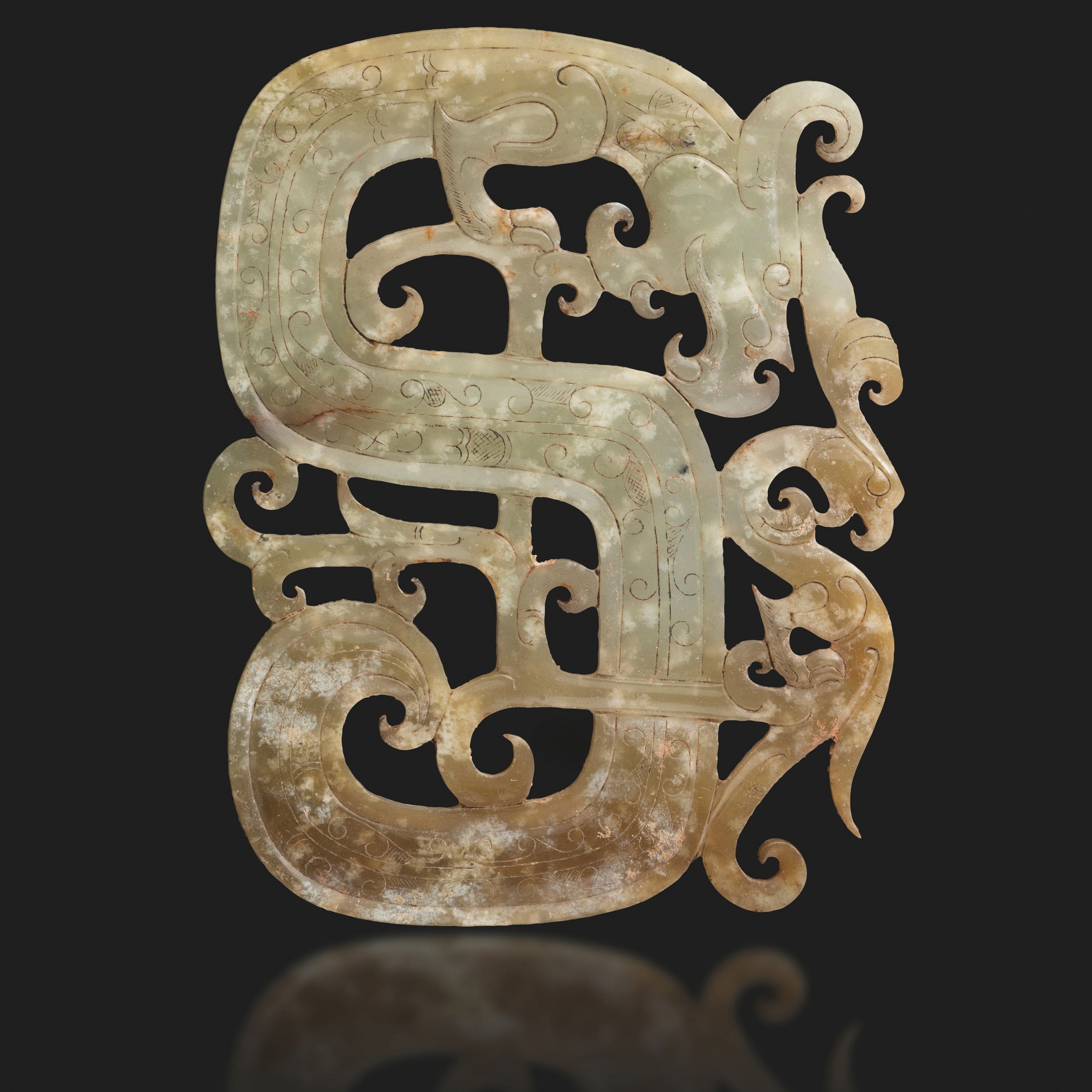 Placca in giada a foggia traforata con drago e fenice, giada in gusto arcaico, Cina, [..]