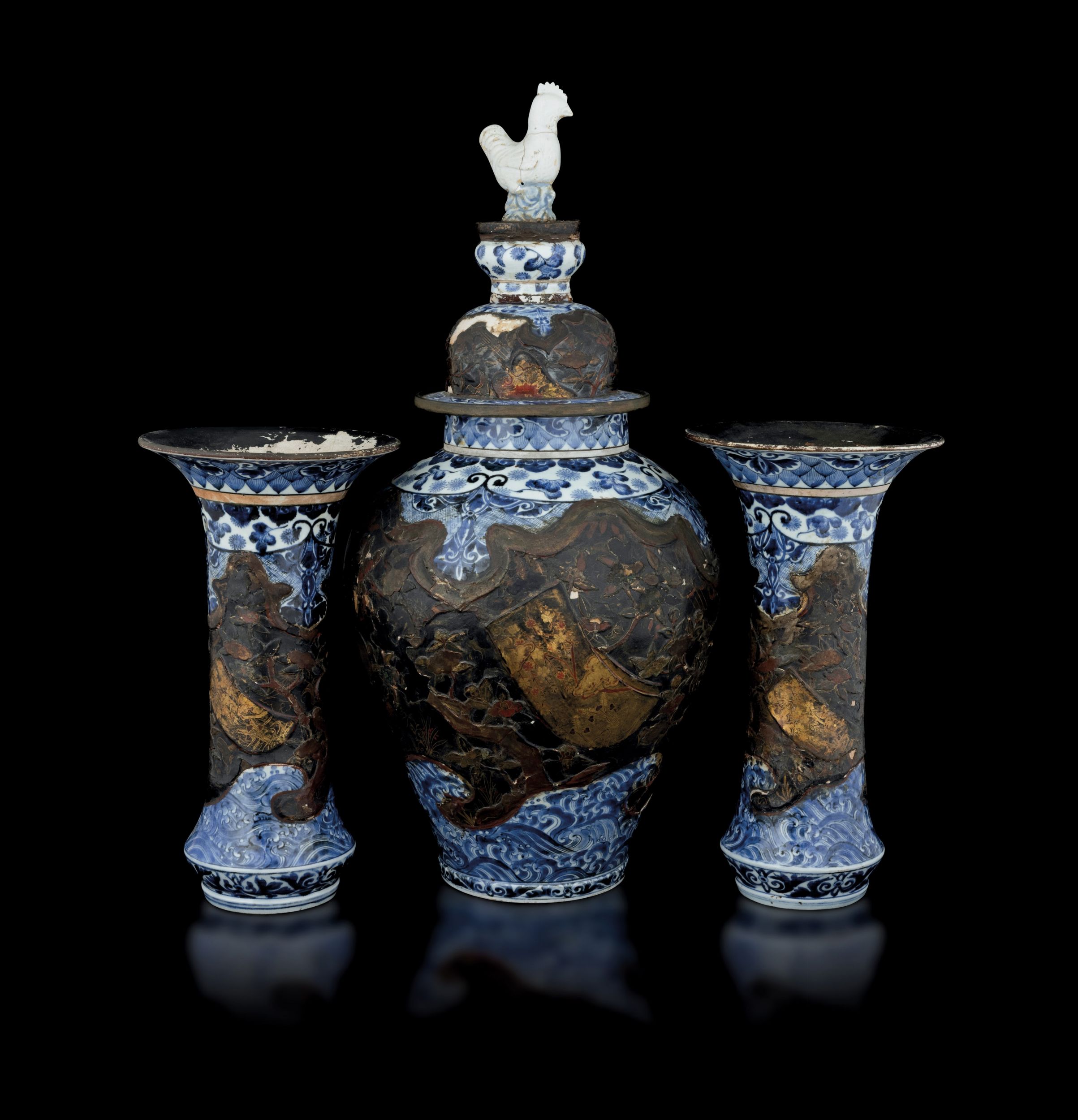 Trittico da camino composto da potiche e coppia di vasi a tromba in porcellana Arita [..]