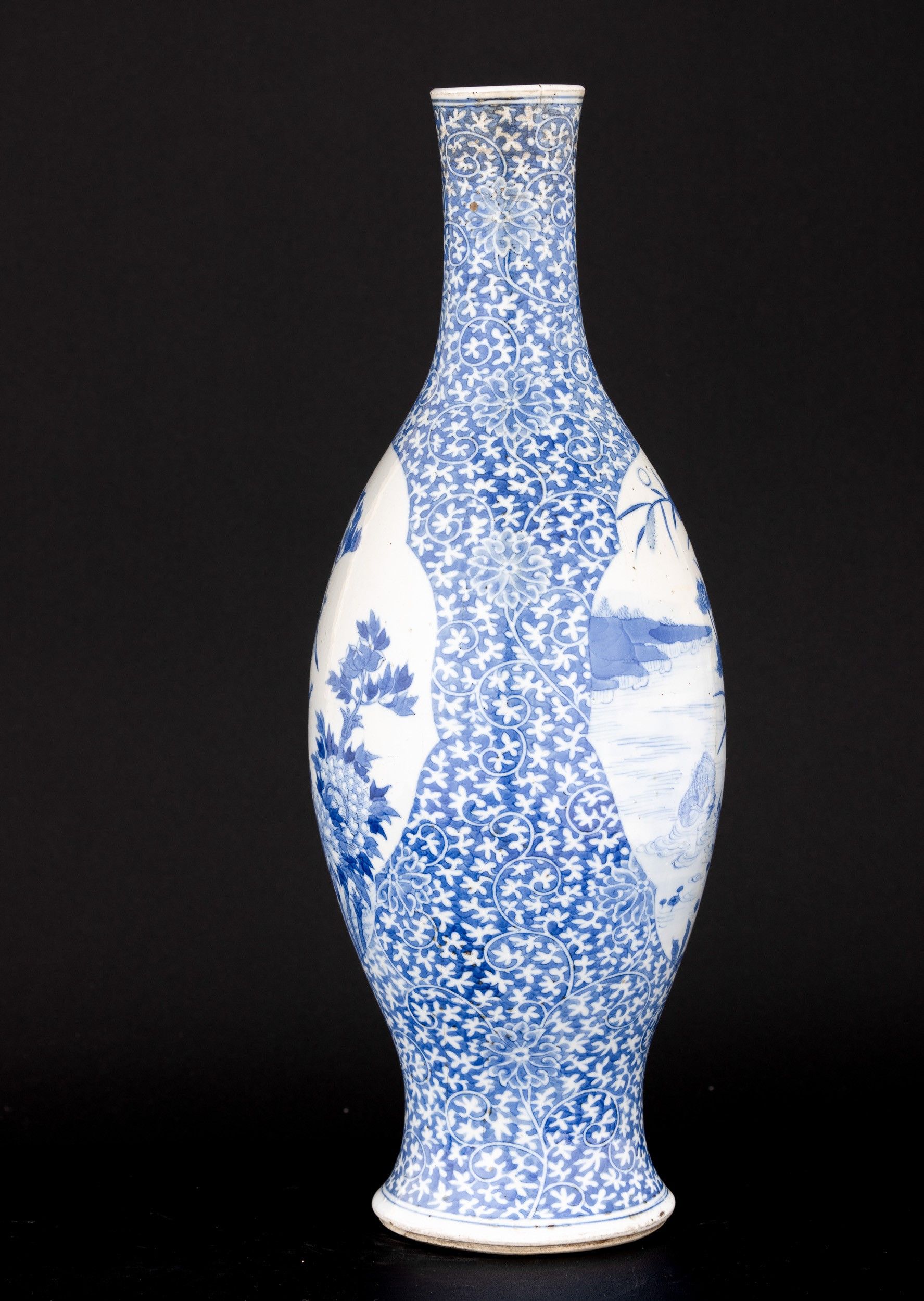Vaso ad anfora in porcellana bianca e blu con decoro a motivo naturalistico entro [..]