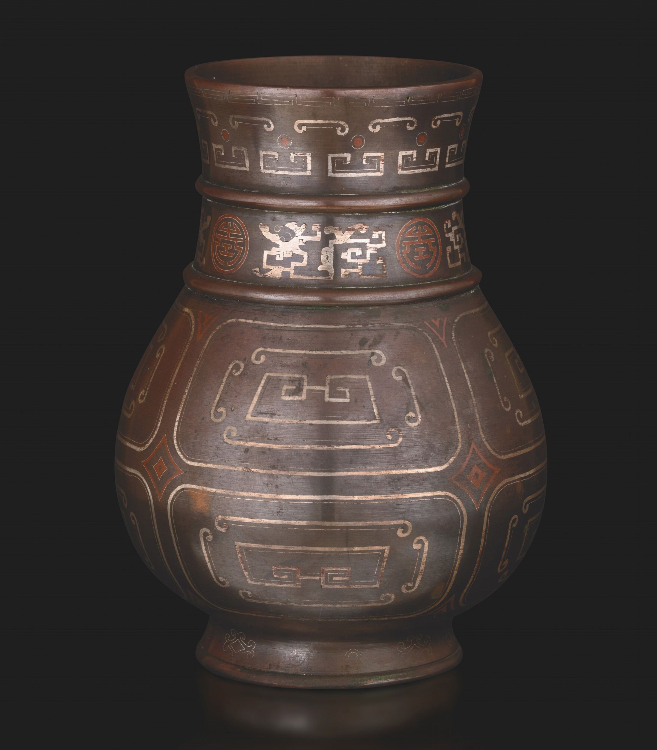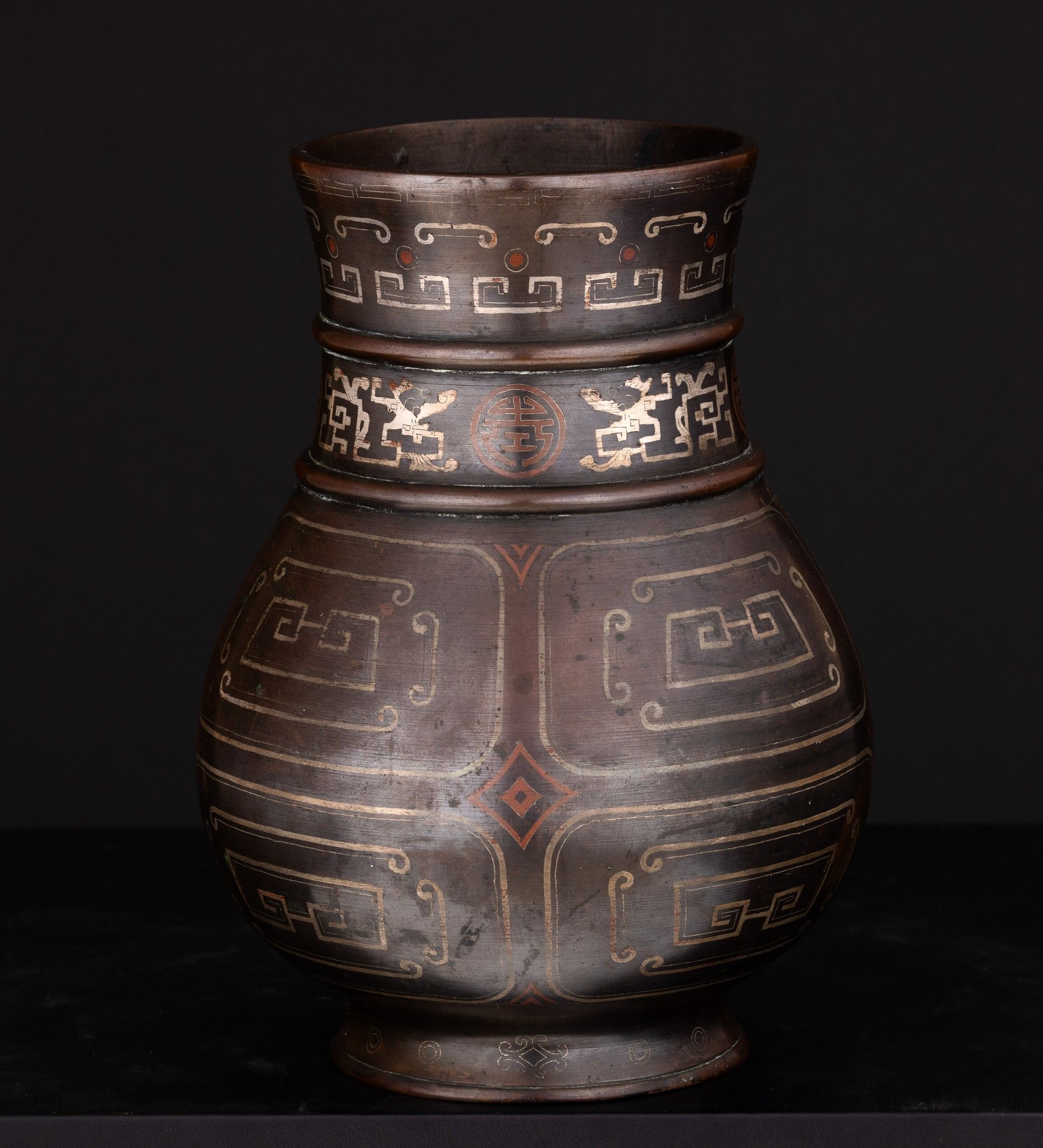 Vaso in bronzo a motivi geometrici con inserti in rame ed argento, Cina, Dinastia [..]