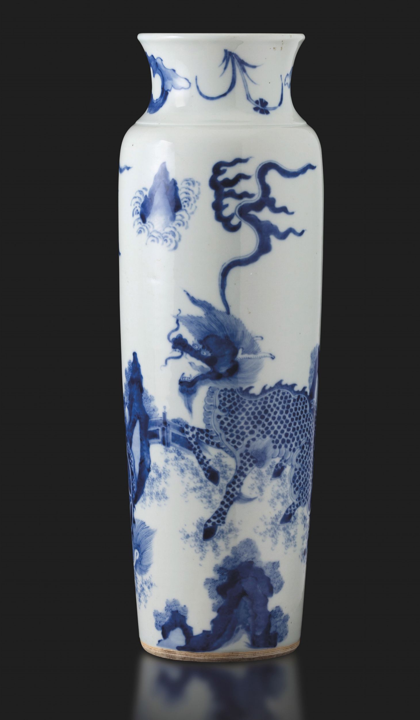 Vaso in porcellana bianca e blu con figure di draghi entro paesaggio, Cina, Dinastia [..]