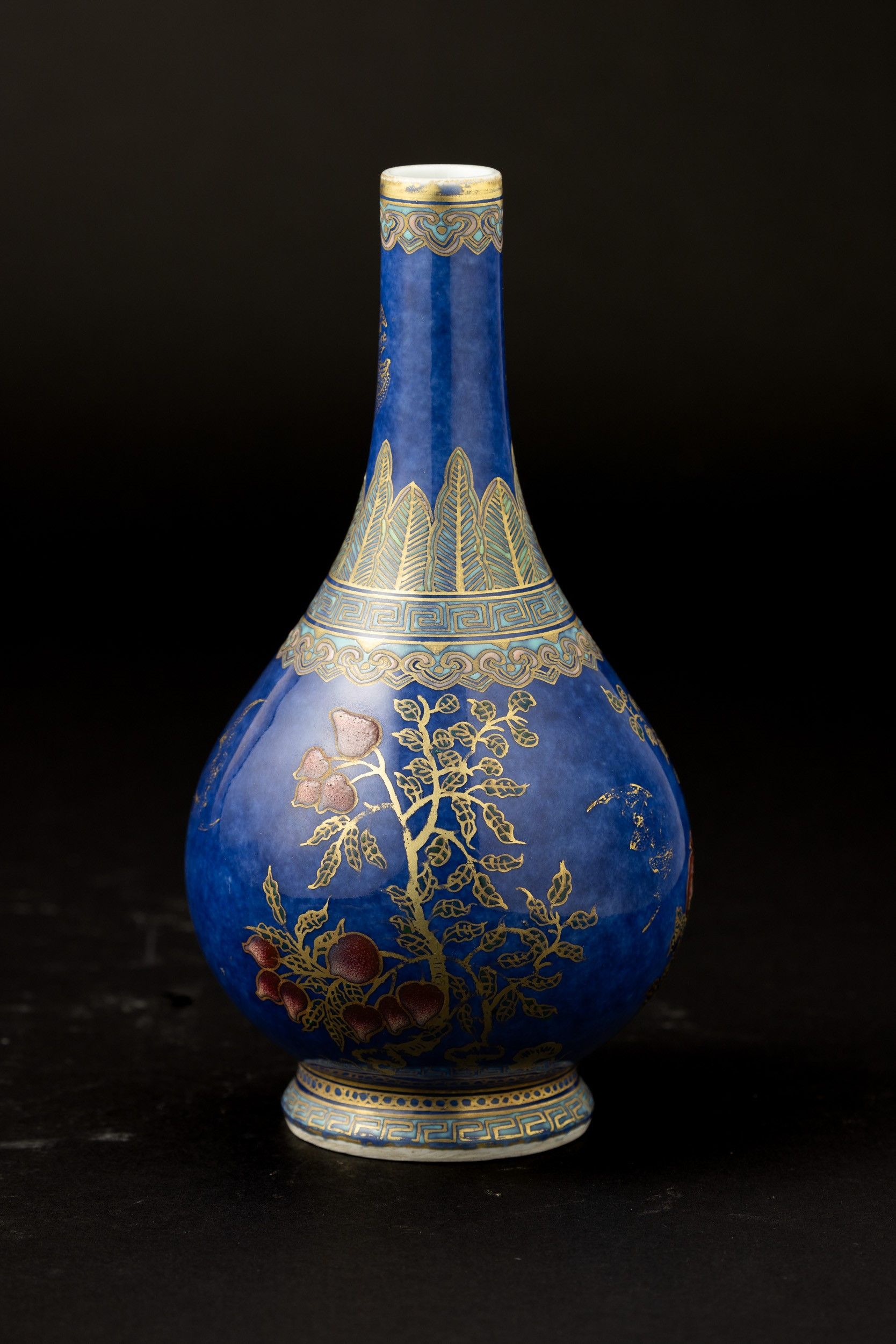Vaso in porcellana blu con motivi floreali e motivi dorati geometrici, Cina, Dinastia [..]