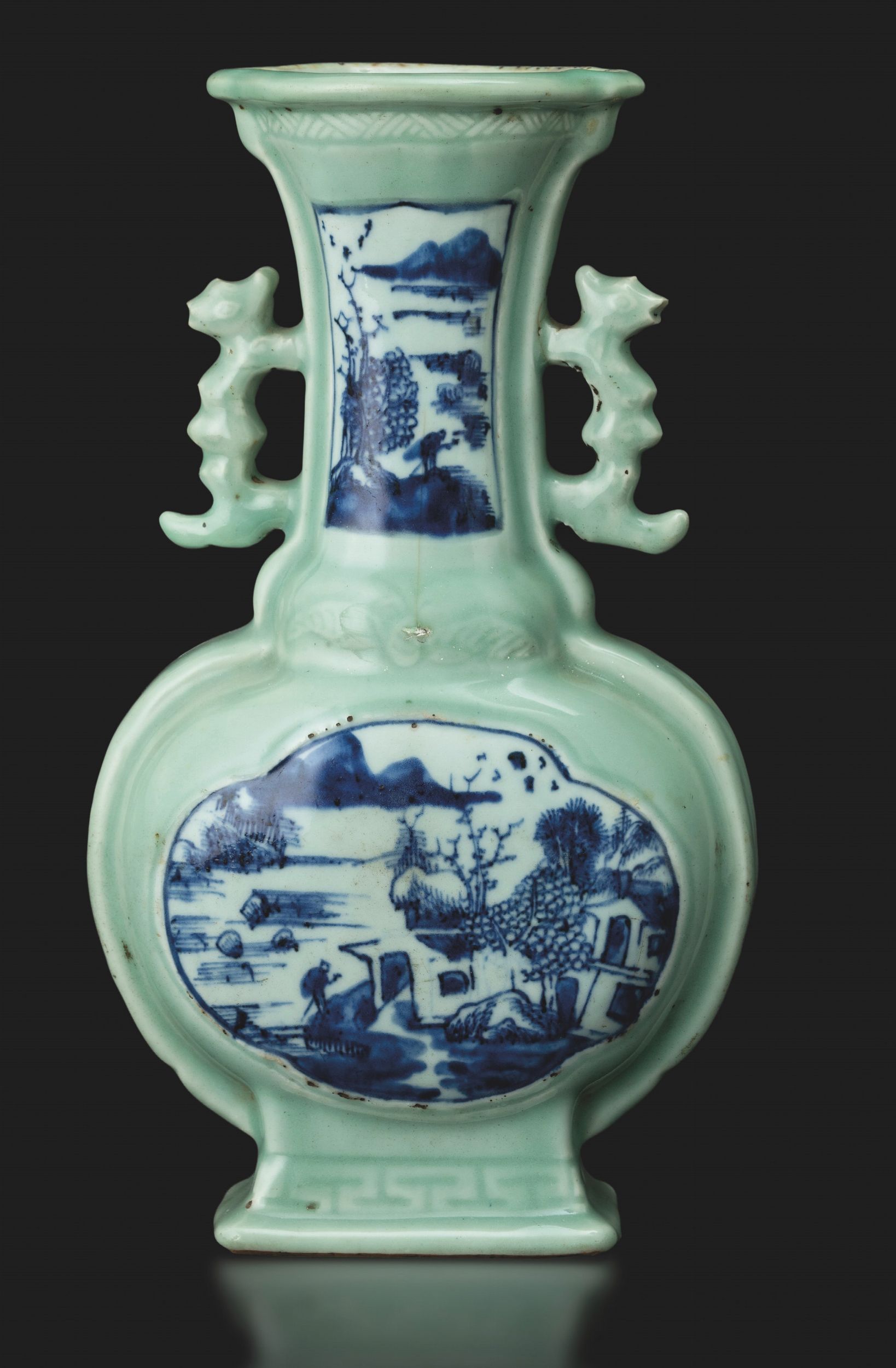 Vaso in porcellana Celadon con anse sagomate e raffigurazioni di paesaggio sui toni [..]