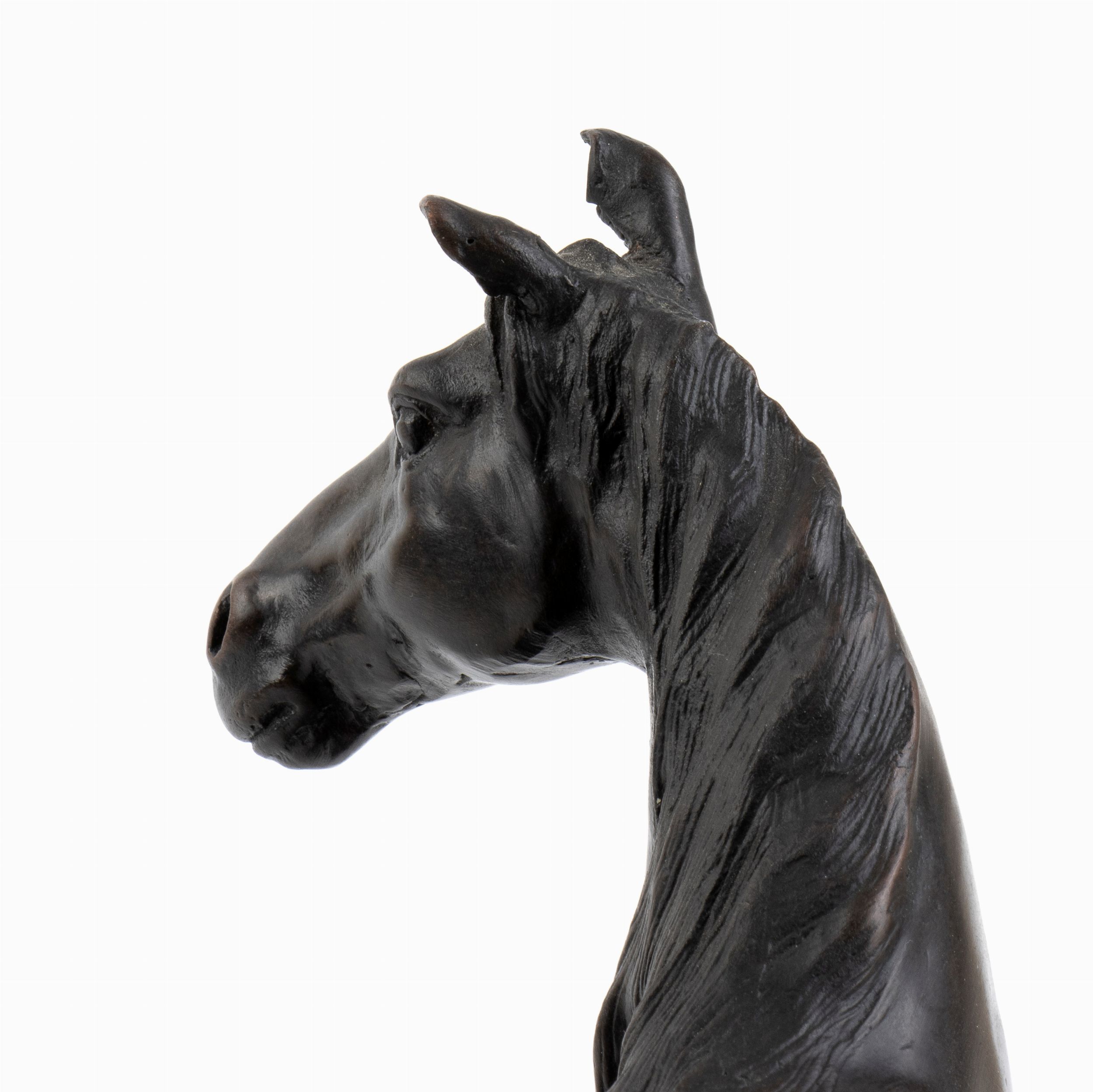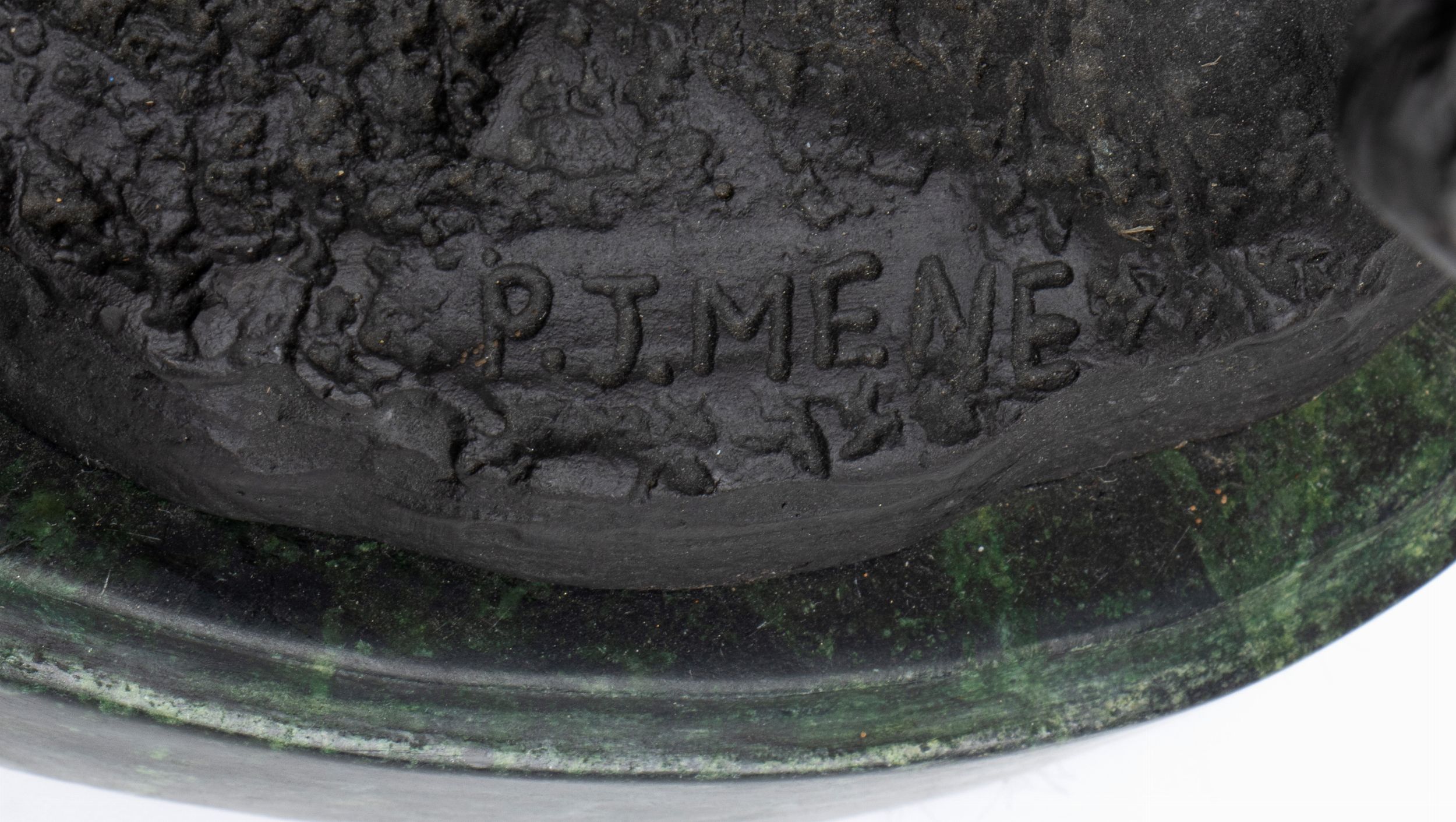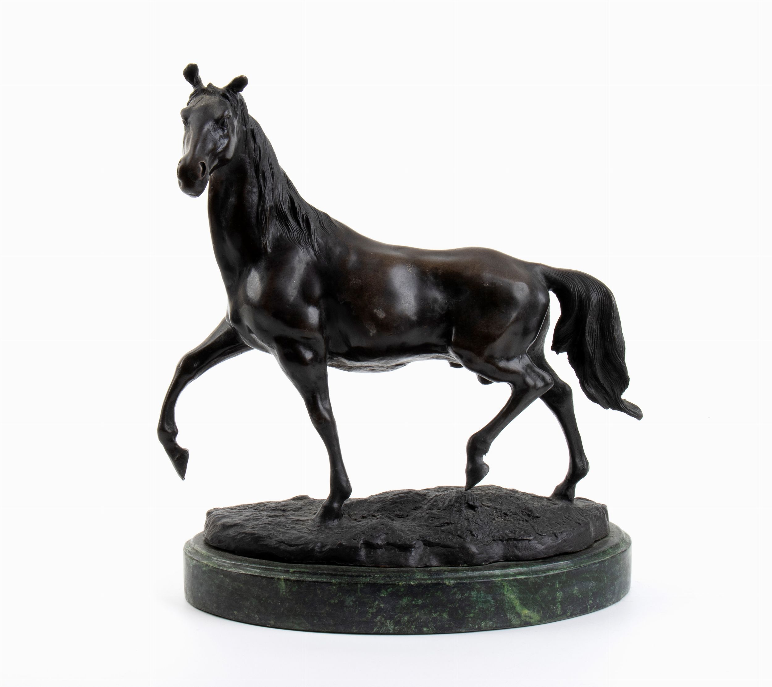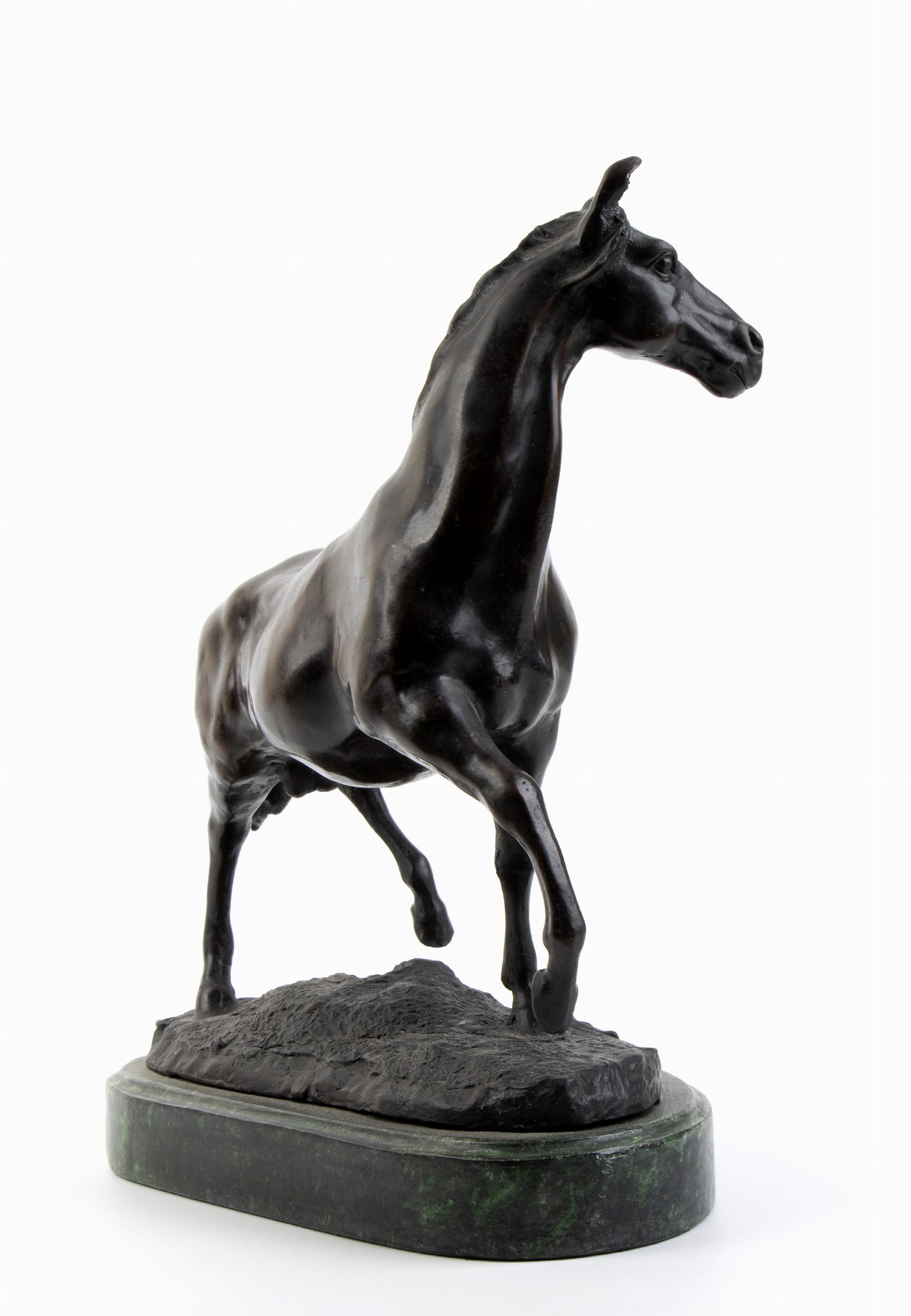 bronzo fuso, patinato nei toni del bronzo e del marrone; cavallo nitrito in piedi su una base ovale naturalistica; iscrizione P. J. Mêne sulla base. Stato di conservazione: **** buono.