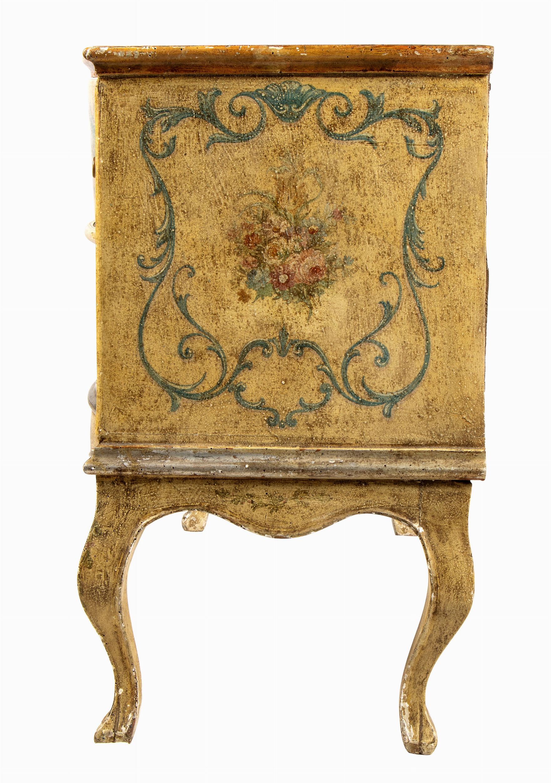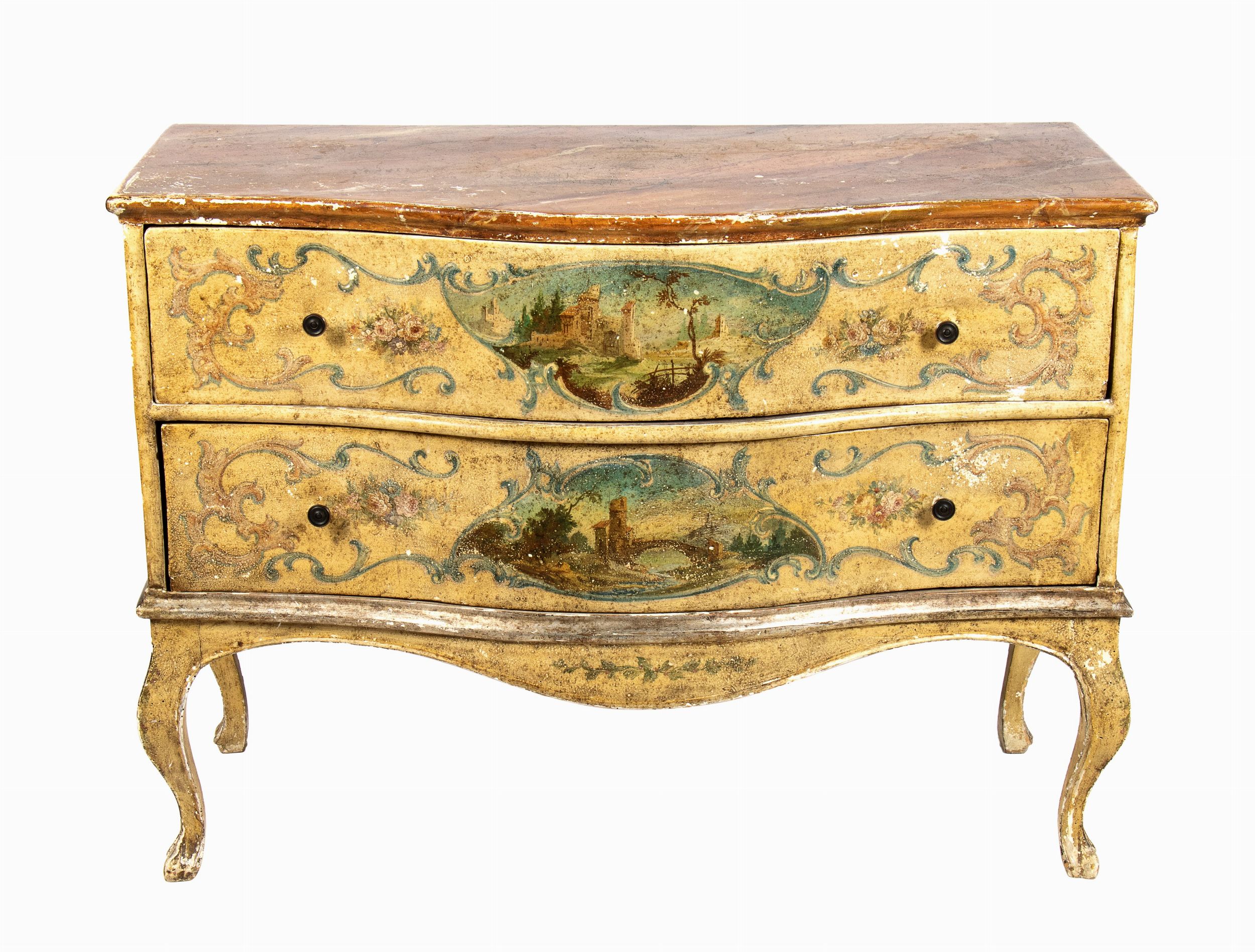 Altezza x larghezza x profondità 91 x 124 x 57 cm. XVIII secolo mobile in stile Luigi XV, gamba cabriolet, piano a finto marmo, completamente dipinto e su fronte con cassetti, scene di paesaggi marchigiani, sui laterali dipinti a motivi floreali. Stato di conservazione: **** buono.