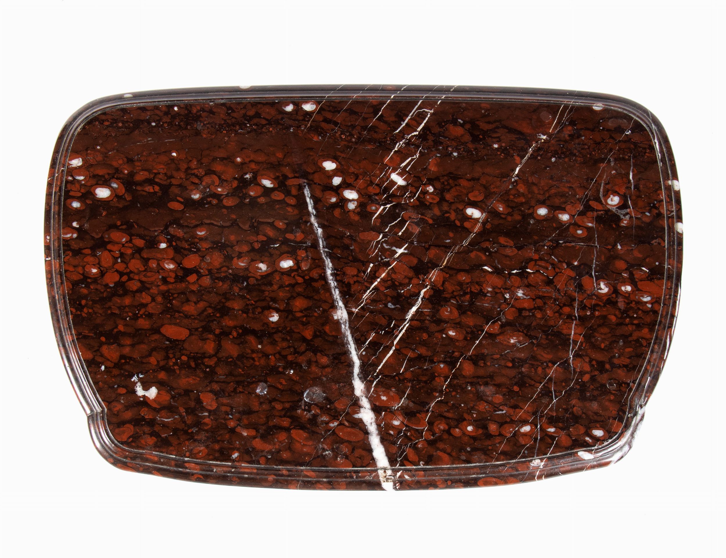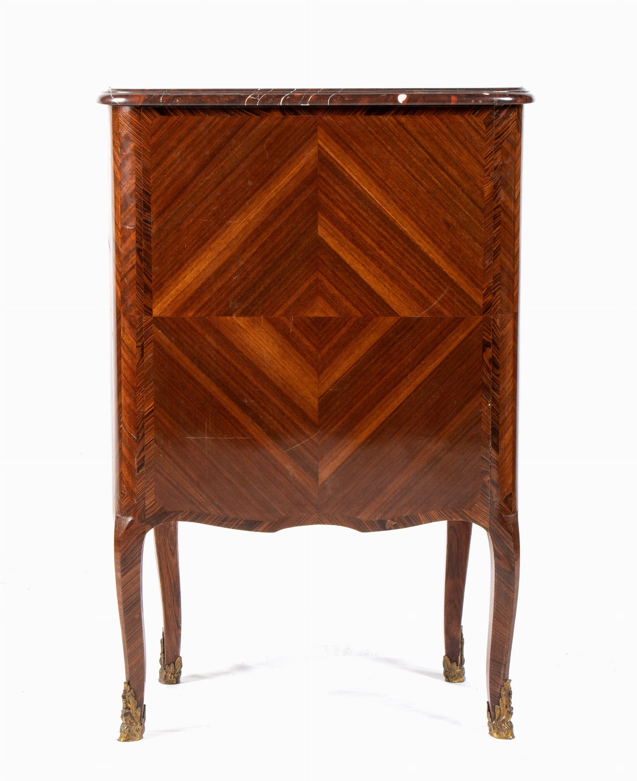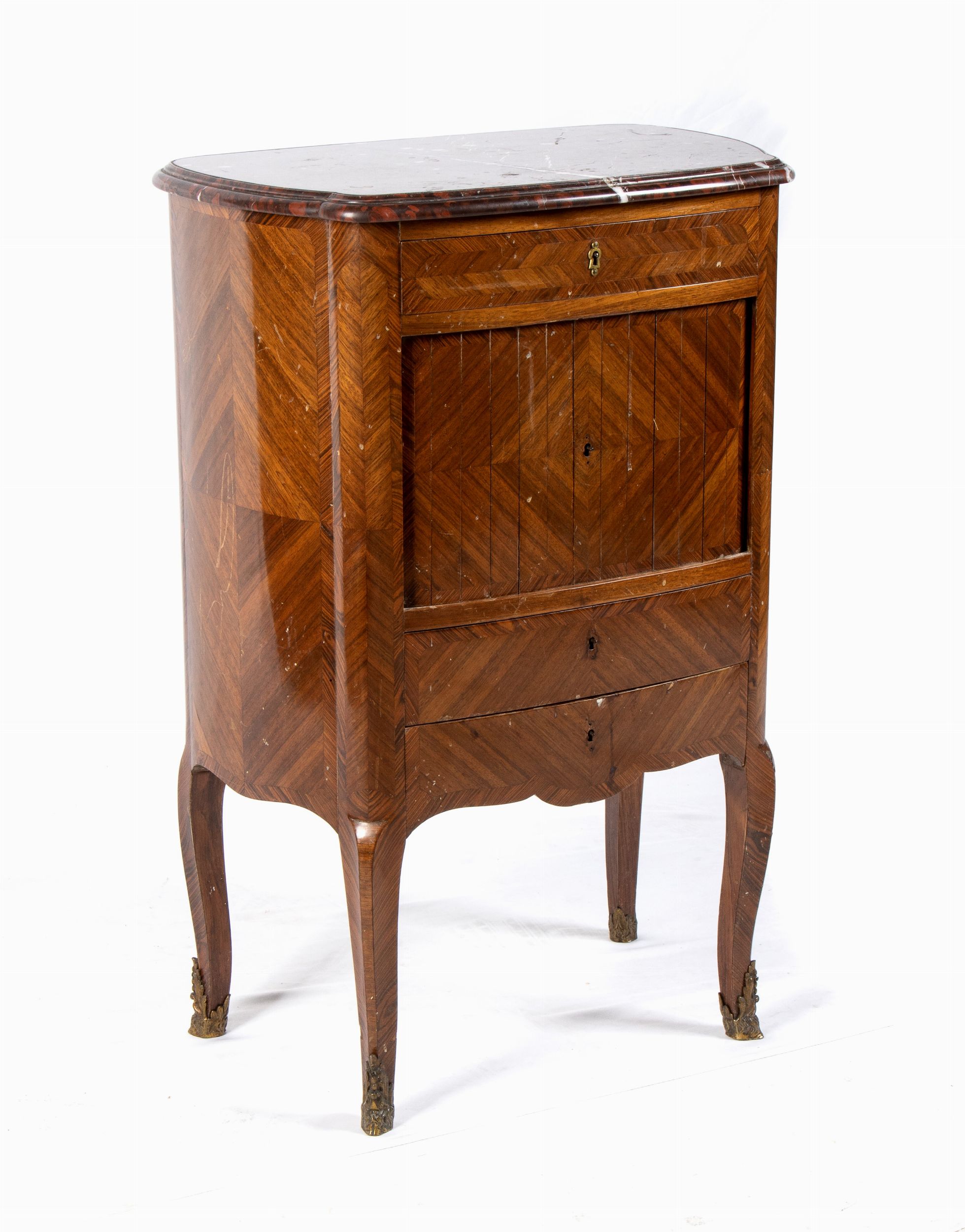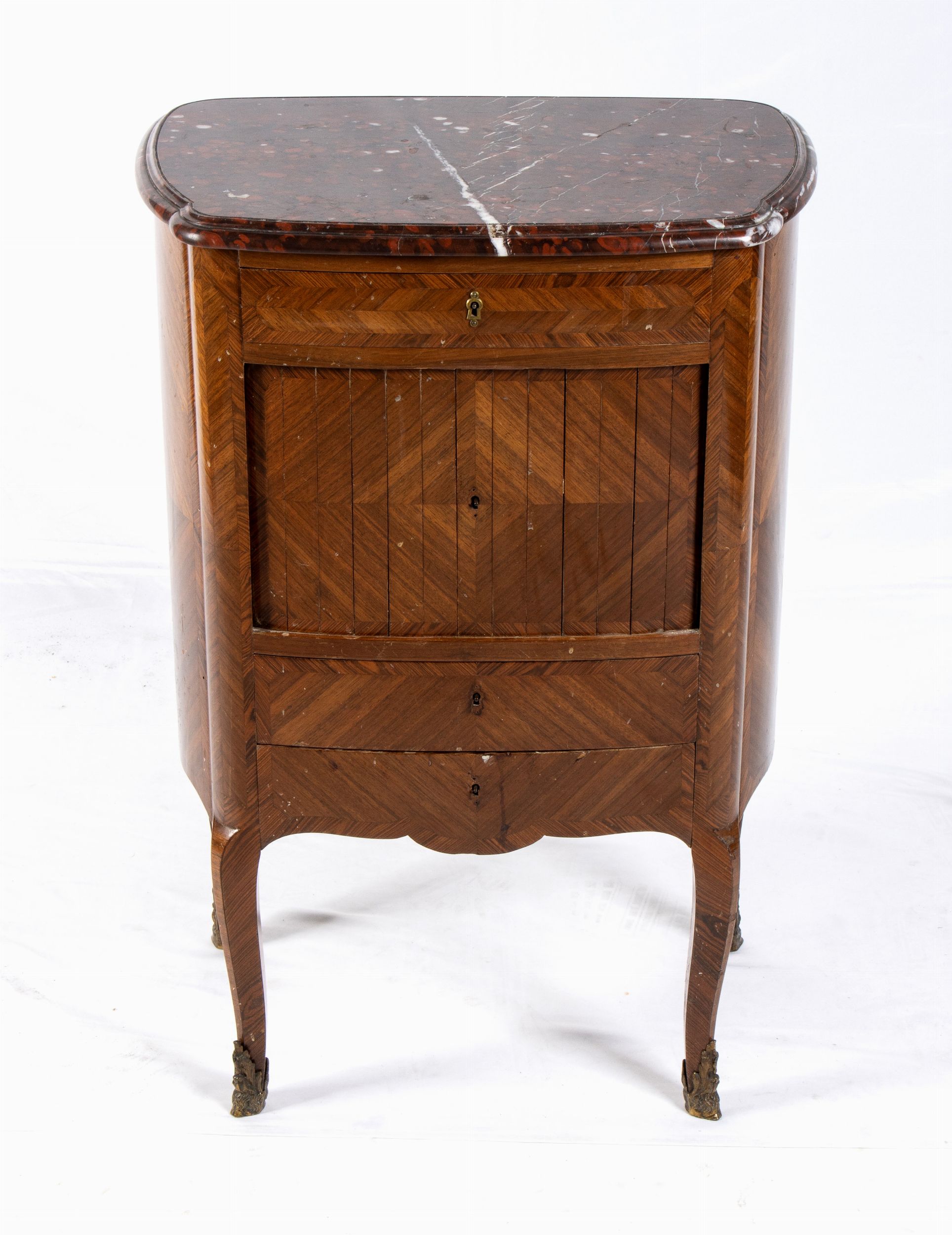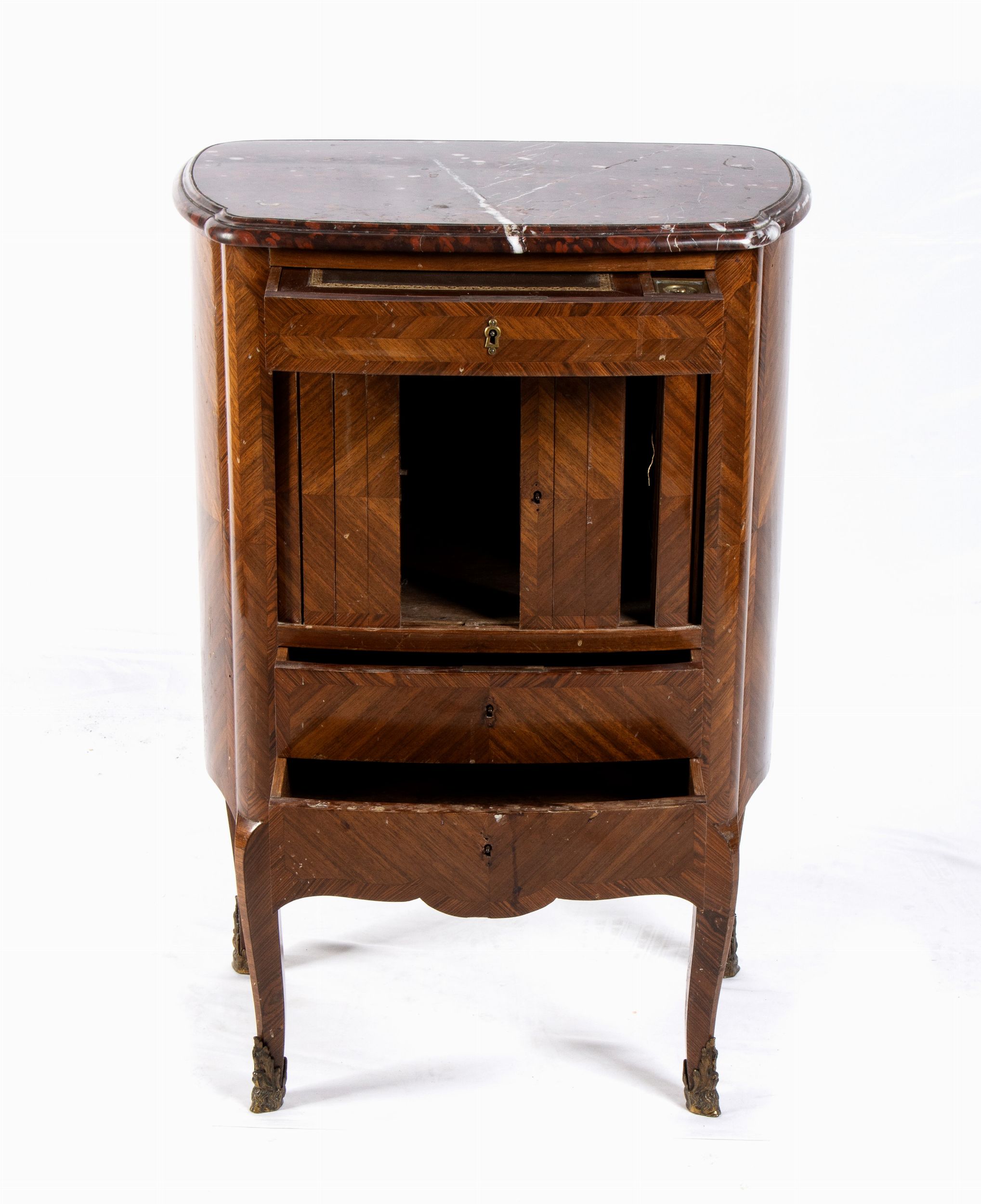 Altezza x larghezza x profondità : 77 x 52 x 34 cm. XVIII secolo In ebano viola e con applicazioni in bronzo dorato. Doppio piano collegato da elementi in bronzo dorato a motivi fogliacei. Cassetto celante un piccolo scrittoio. Stato di conservazione: *** discreto, piccole mancanze, serrandina da rivedere.