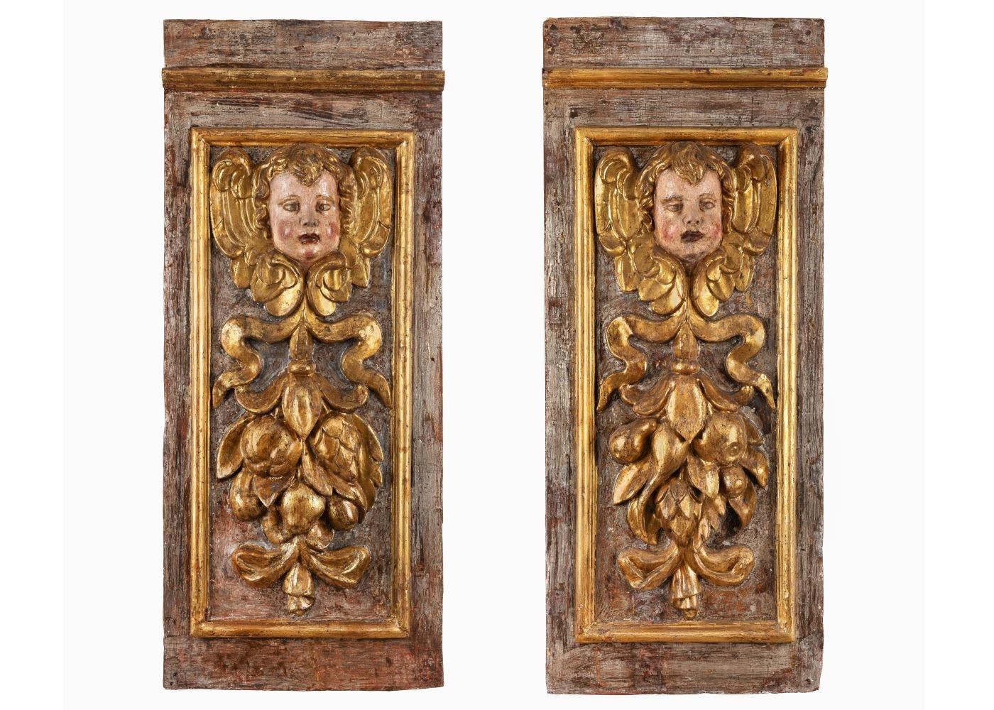 XVIII secolo laccati e dorati , Italia del sud epoca XVIII secolo , lavorati e intagliati , raffigurazioni di visi di putti e fiori Stato di conservazione: **** buono.