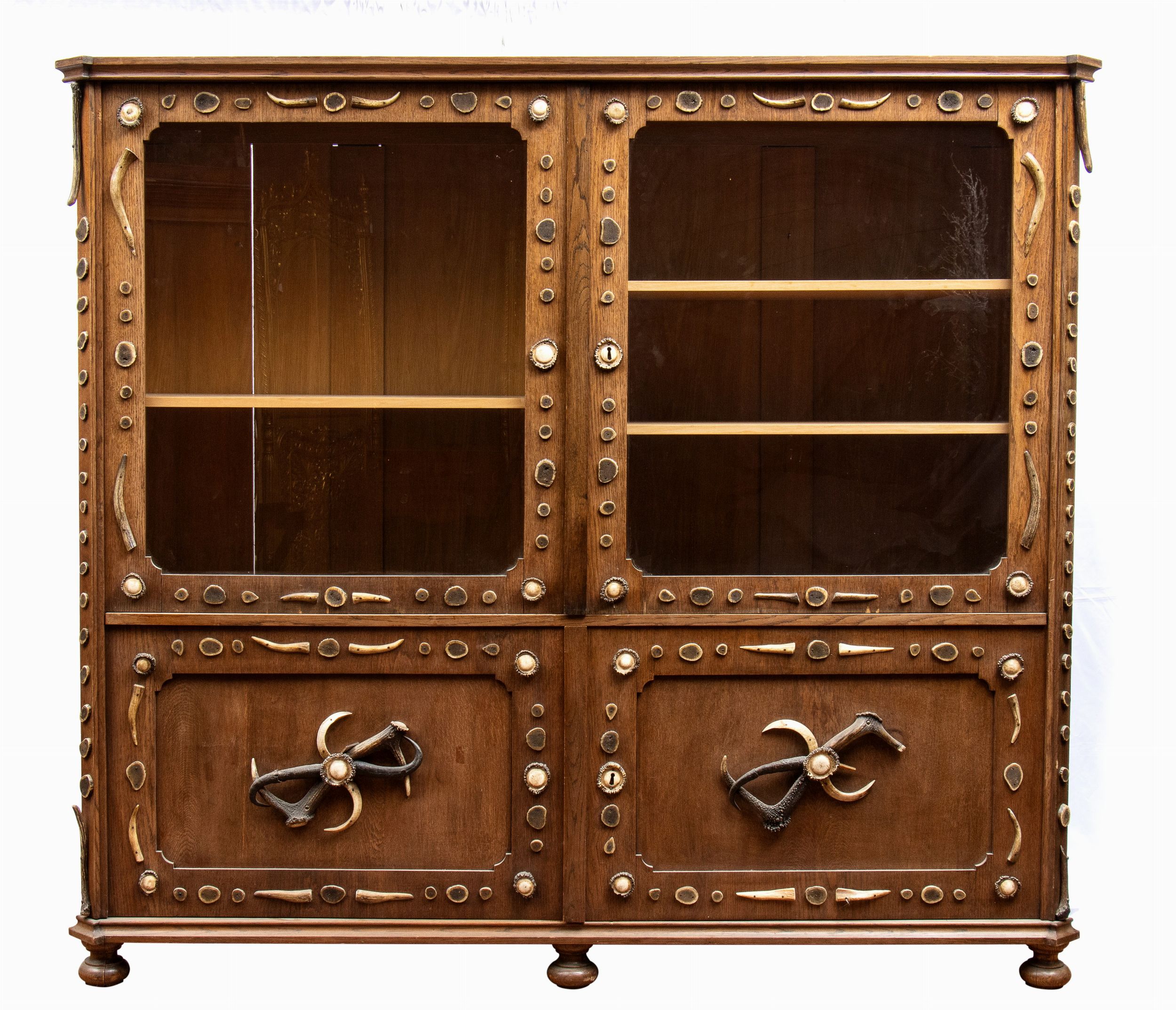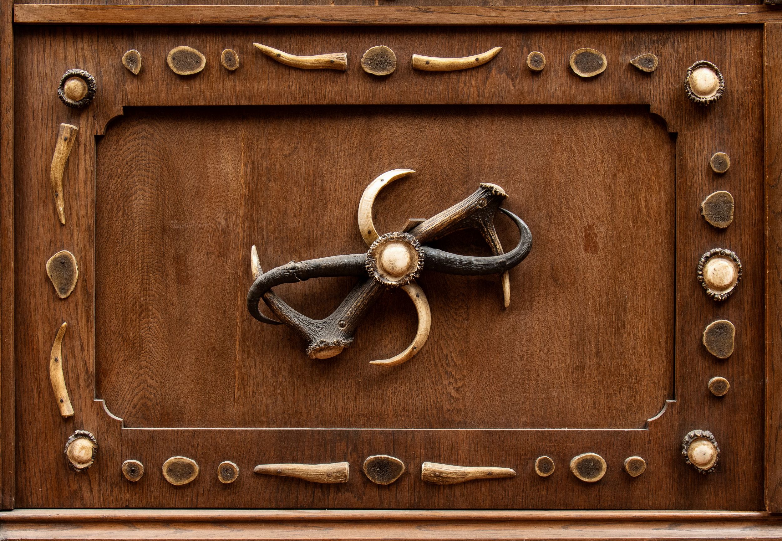 XX secolo grande credenza foresta nera in rovere con applicate corna e sezioni di corna di cervo, capriolo, stambecco e difese di cinghiale. Germania inizio 900 Stato conservativo : **** buono