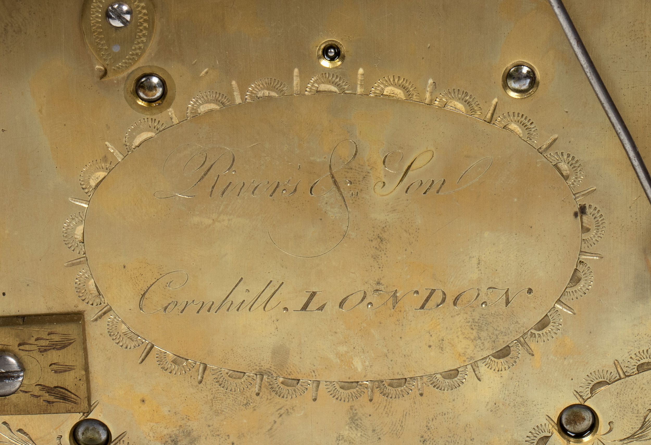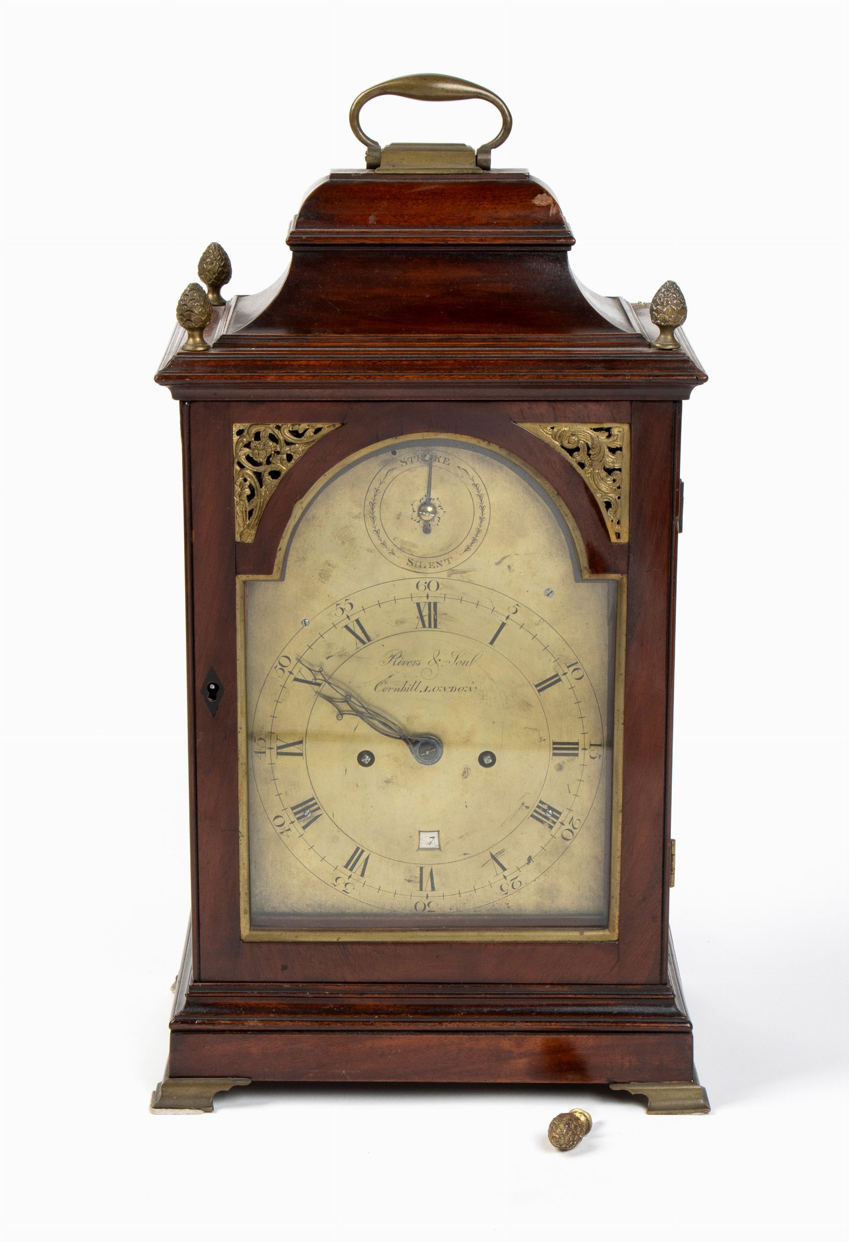 Altezza x larghezza x profondità : 52 x 29 x 19 cm. XVIII secolo cassa in mogano ad arco spezzato con maniglia di trasporto, porta anteriore con cornice e applicazioni in ottone. Quadrante dorato a due fori di carica con numeri Romani e sfere neri firmato Rivers & Son - Cornhill - London, apertura del calendario e arco superiore con un quadrante suoneria/silenzio. Movimento con regolatore a pendolo e suoneria delle ore e delle mezze su campana firmato Rivers & Son - Cornhill - London; la piastra posteriore con bordo a foglie stilizzate. Rivers & Son lavorarono a Cornhill, Londra, tra il 1782 e il 1815 e furono i successori di Daniel De St. Leu. Stato di conservazione: **** buono, mancanze.