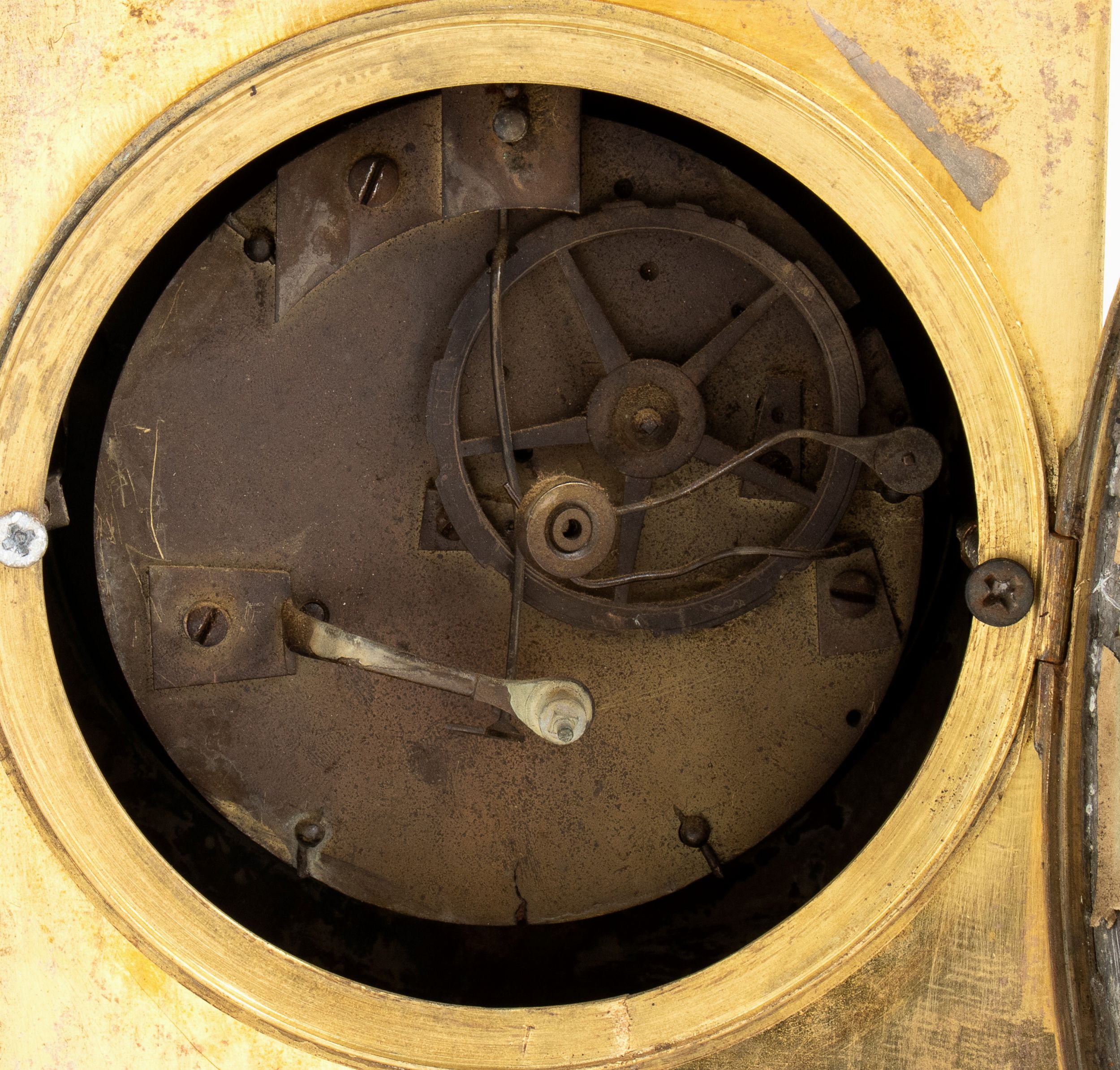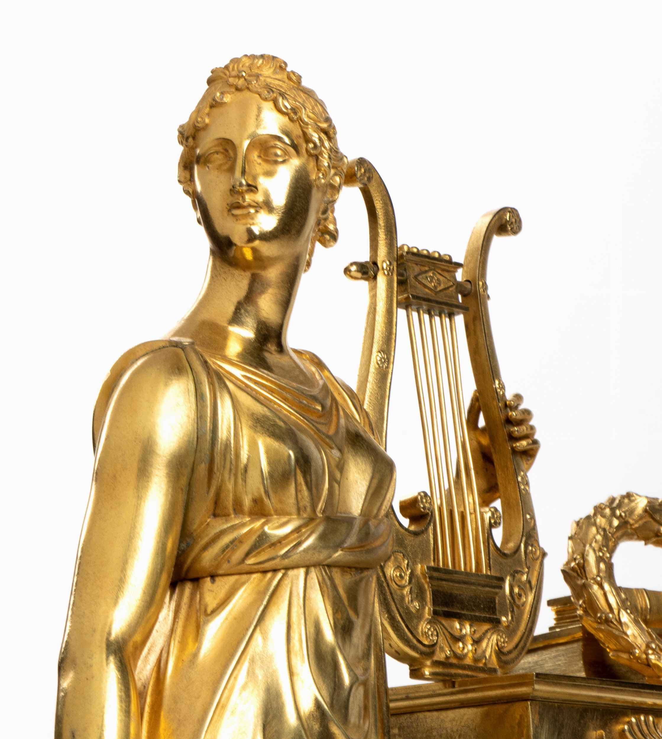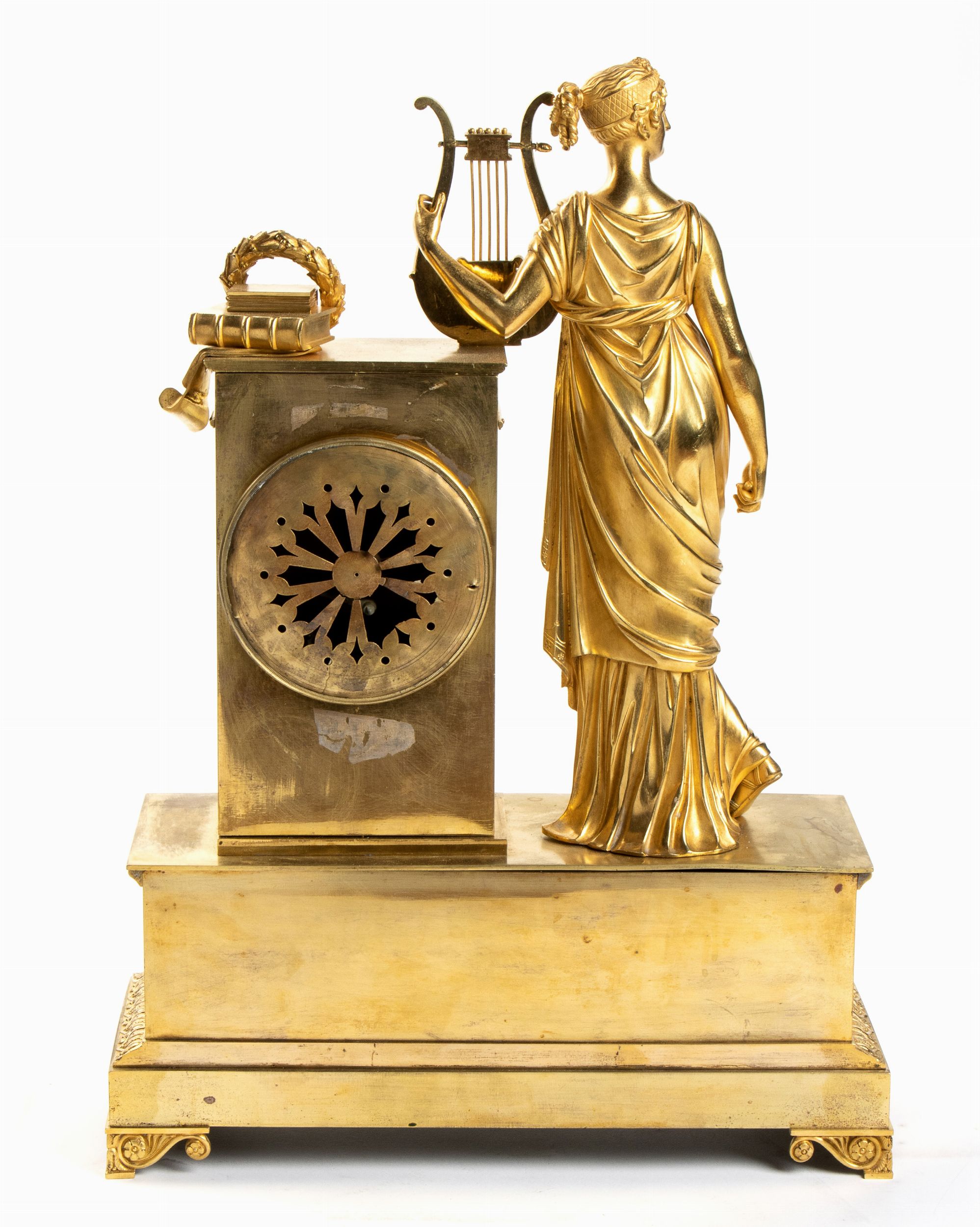 XIX secolo cassa in bronzo dorata al mercurio poggiante suquattro piedini fogliati, riccamente decorata nella parte superiore da una figura femminile con arpa. Orologio con quadrante circolare in smalto bianco con due fori di carica e numeri arabi firmato 'Hedouin à Paris' e 'Feuchere Fab. de Bronze'. Pierre-François Feuchère operava già sotto il regno di Luigi XVI, diventando il principale rivale dei bronzisti Pierre-Philippe Thomire, Claude Galle e André-Antoine Ravrio nel periodo compreso tra il 1800 e il 1820. Il figlio di Pierre-François, Lucien-François (attivo dal 1780 al 1828), lavorò presso la bottega del padre contribuendo allo sviluppo della stessa, creando opere prestigiose commissionate e acquistate da una clientela tra le più importanti di Francia ed estero, tra cui aristocratici tedeschi e austriaci. Stato di conservazione: **** buono, pendolo mancante , meccanismo non testato.
