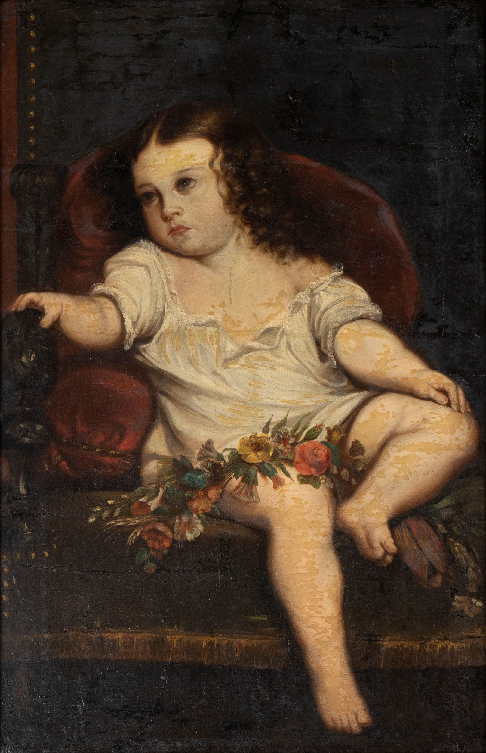 Francia, XIX secolo olio su tela raffigurante fanciulla seduta con ghirlanda di fiori. Stato di conservazione: **** buono.