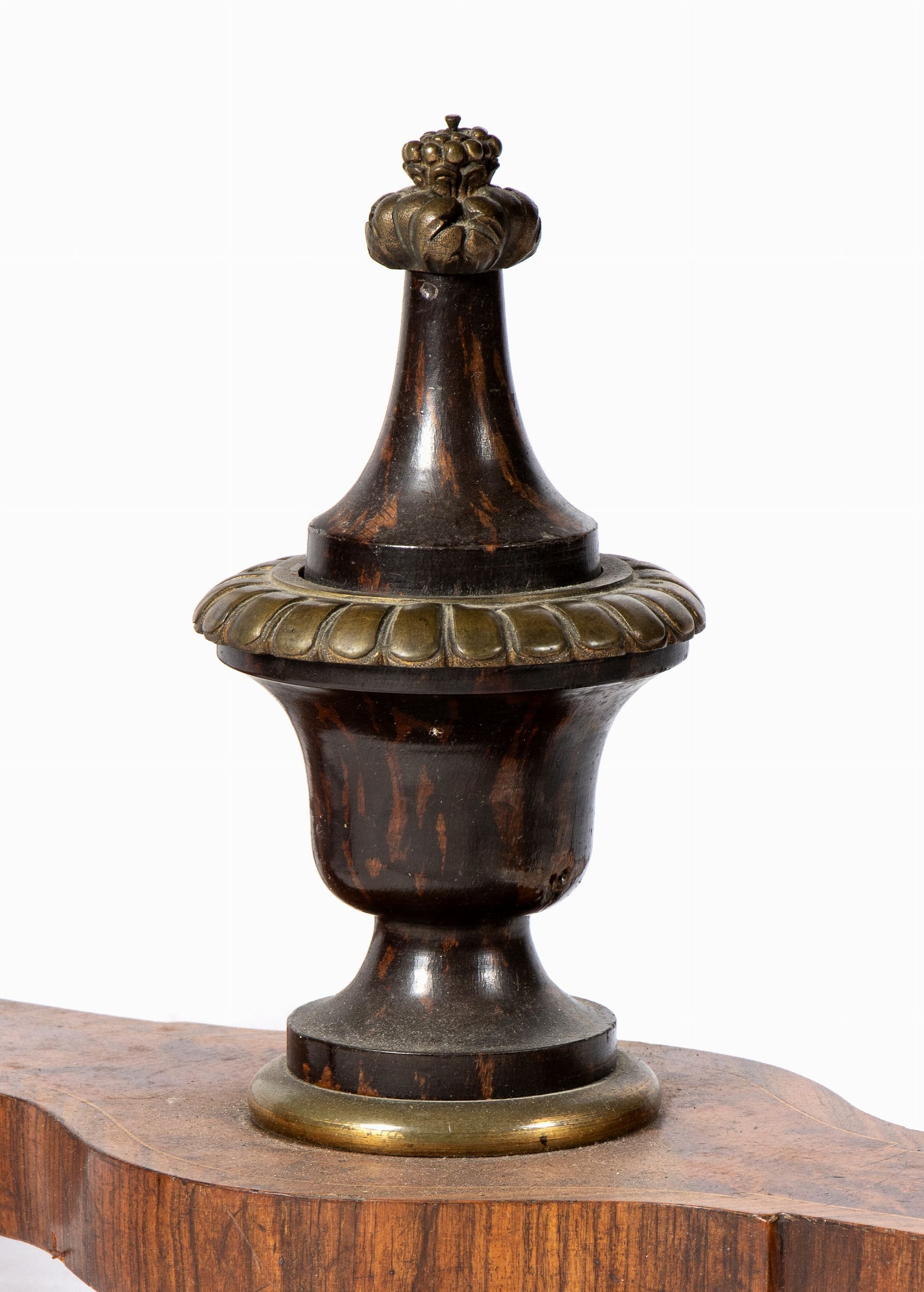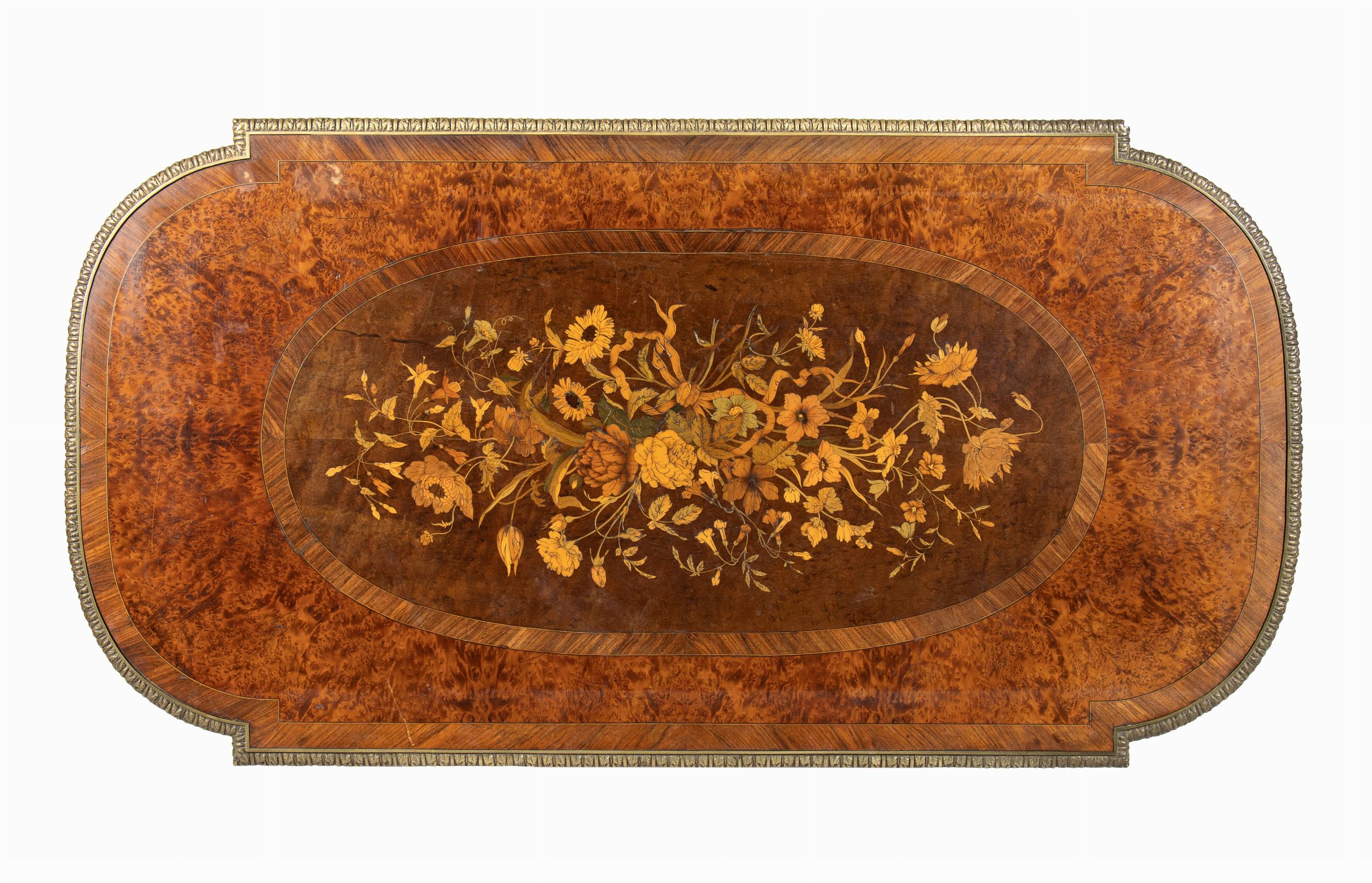 Altezza x larghezza x profondità : 75 x 144 x 75 cm XIX secolo epoca di Napoleone III° (1840-1870) con piano intarsiato in legni di frutto a motivi floreali, sagomato e decorato con montature in bronzo dorato; gambe a colonna collegate da crociera in legno sormontata da pigna in legno. Unico cassetto sotto piano. Stato di conservazione: * *** buono.