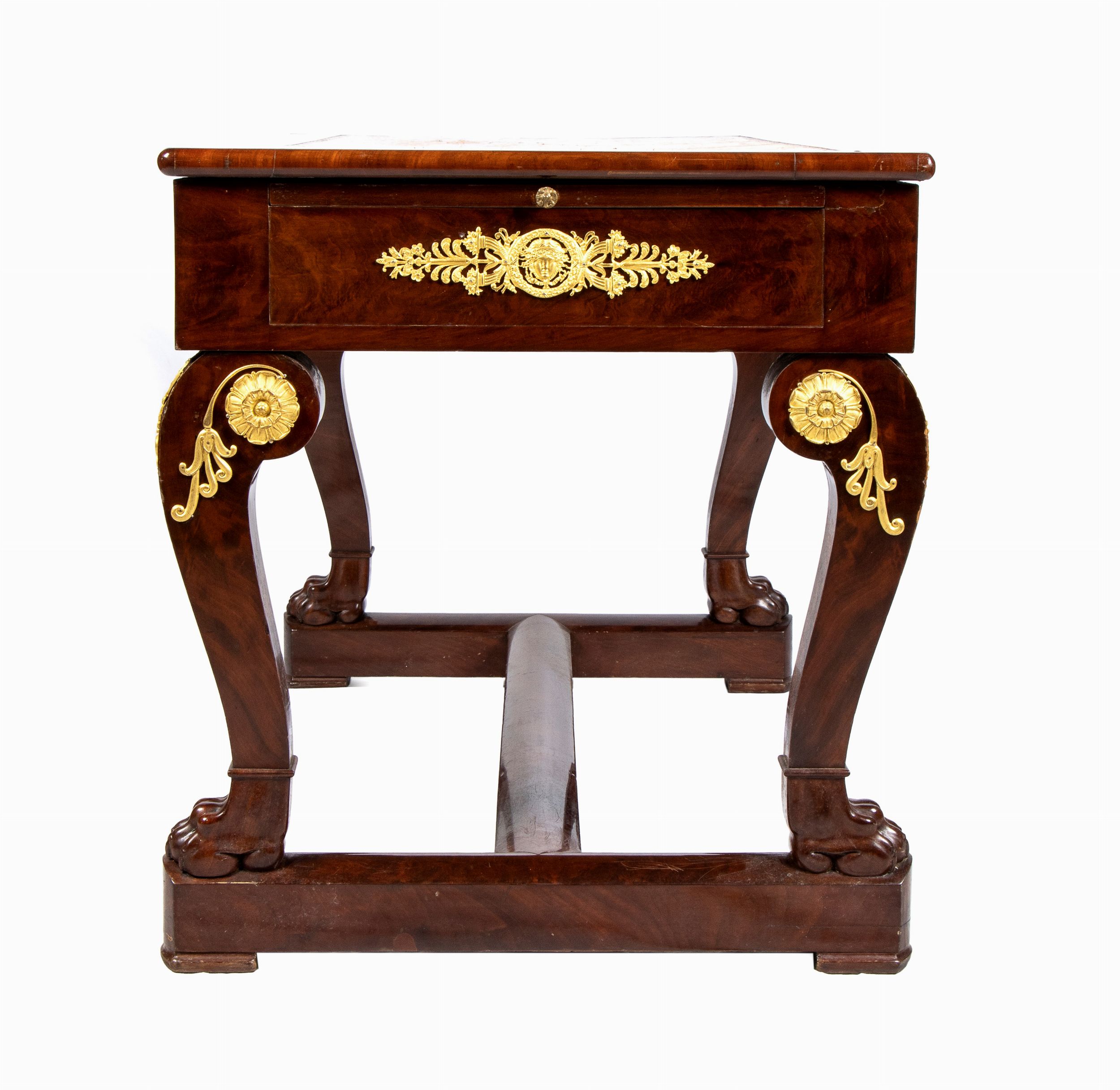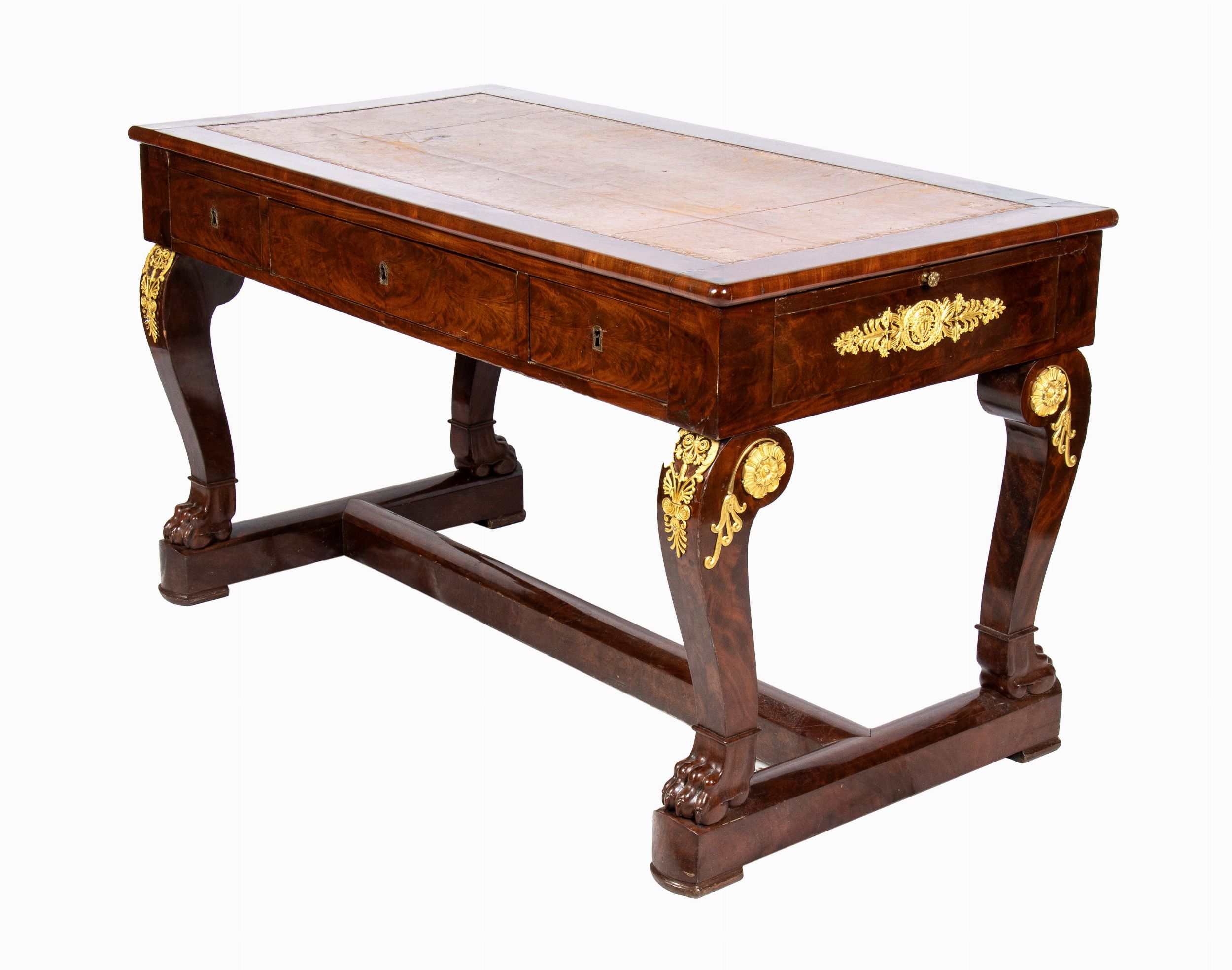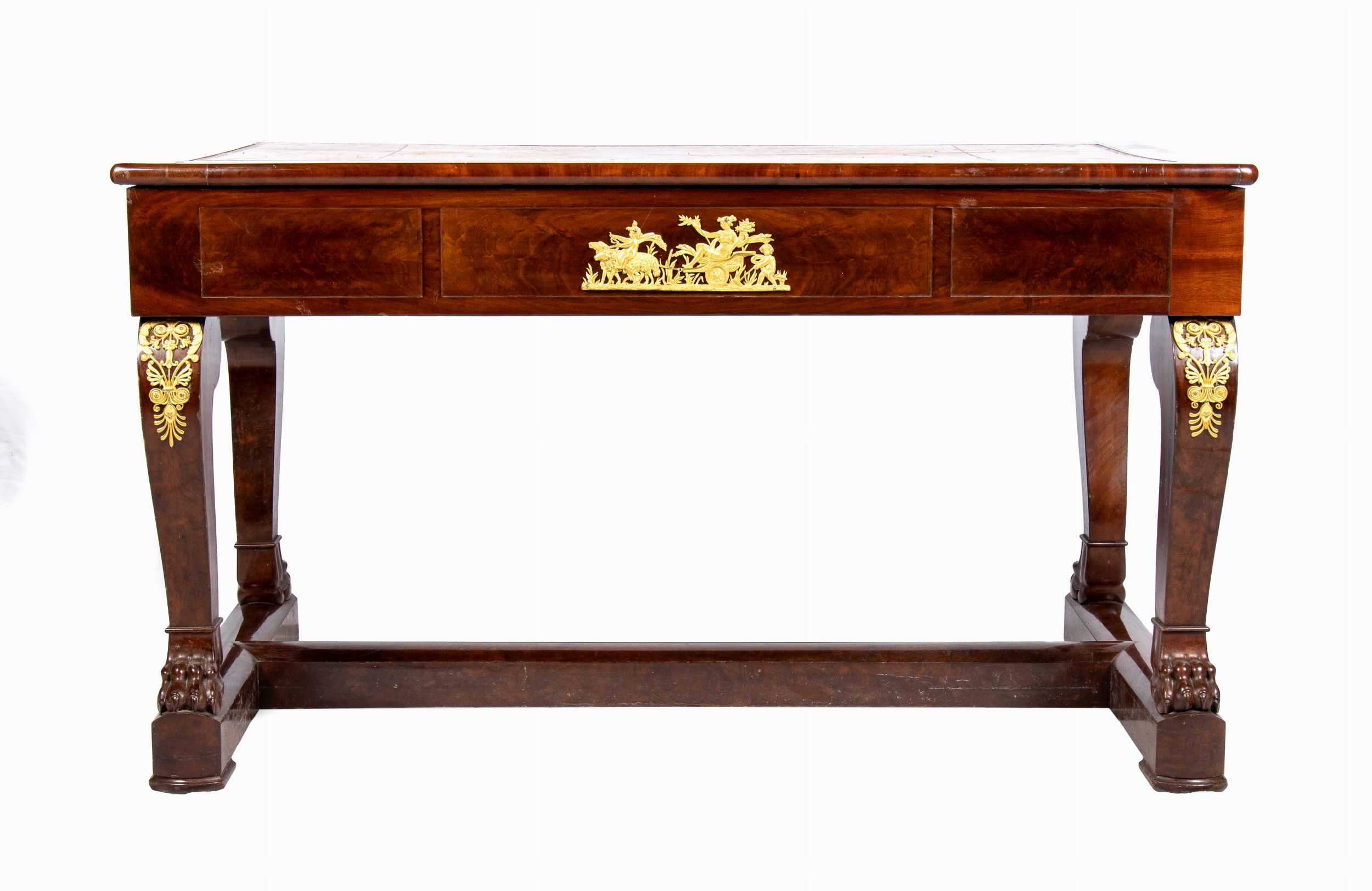 XIX secolo fronte con tre cassetti, con applicazioni in bronzo dorato. Piano in pelle. Stato di conservazione: **** buono.