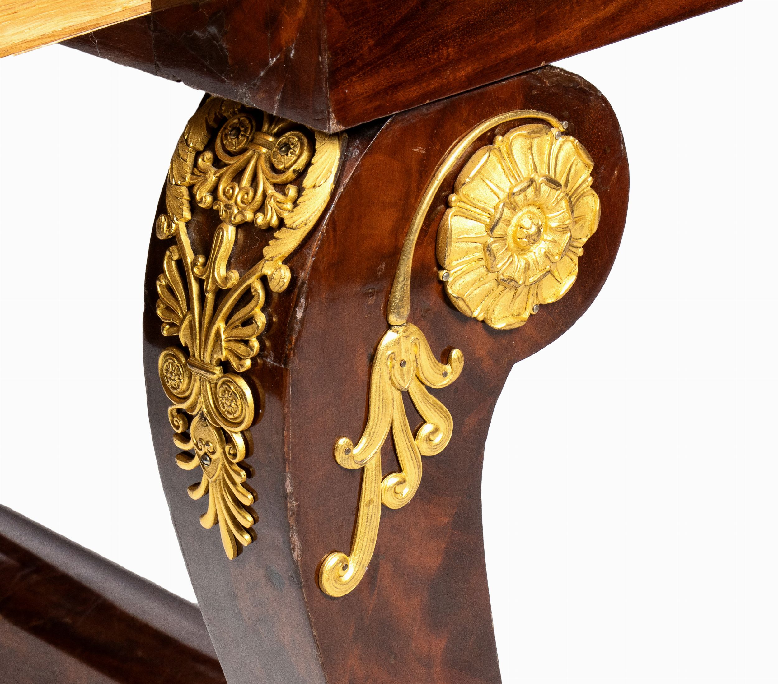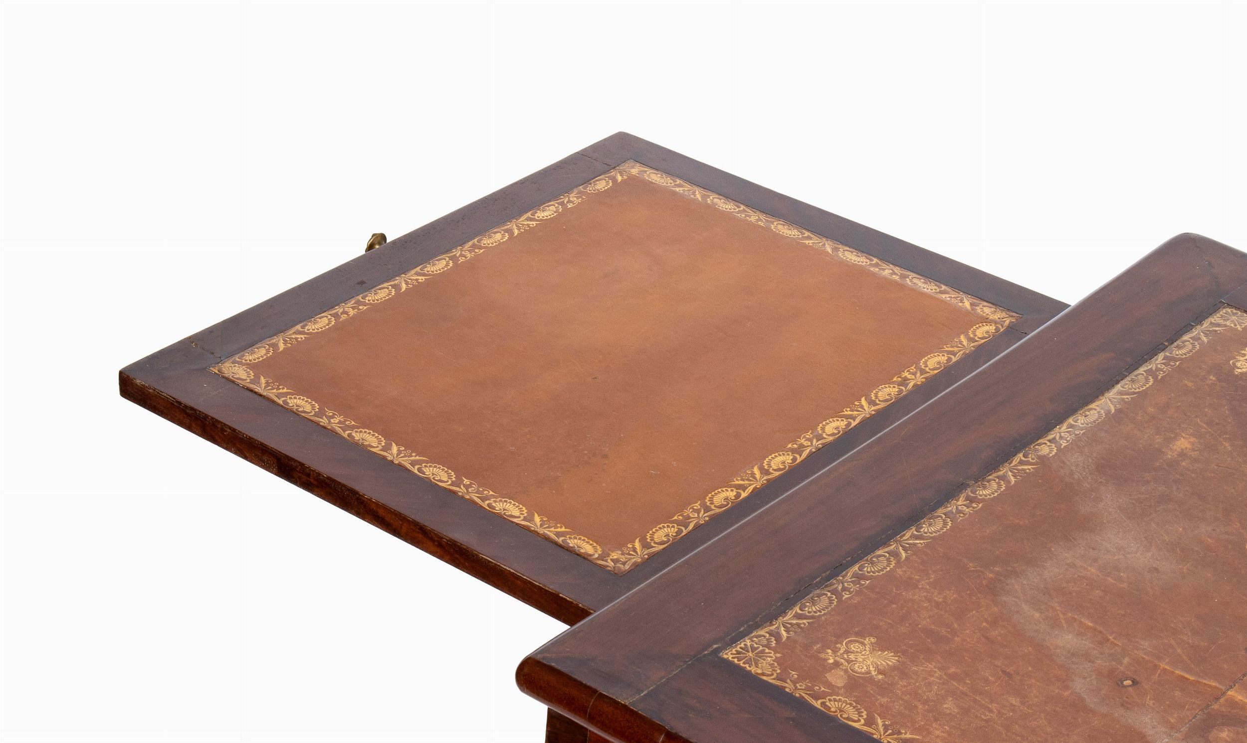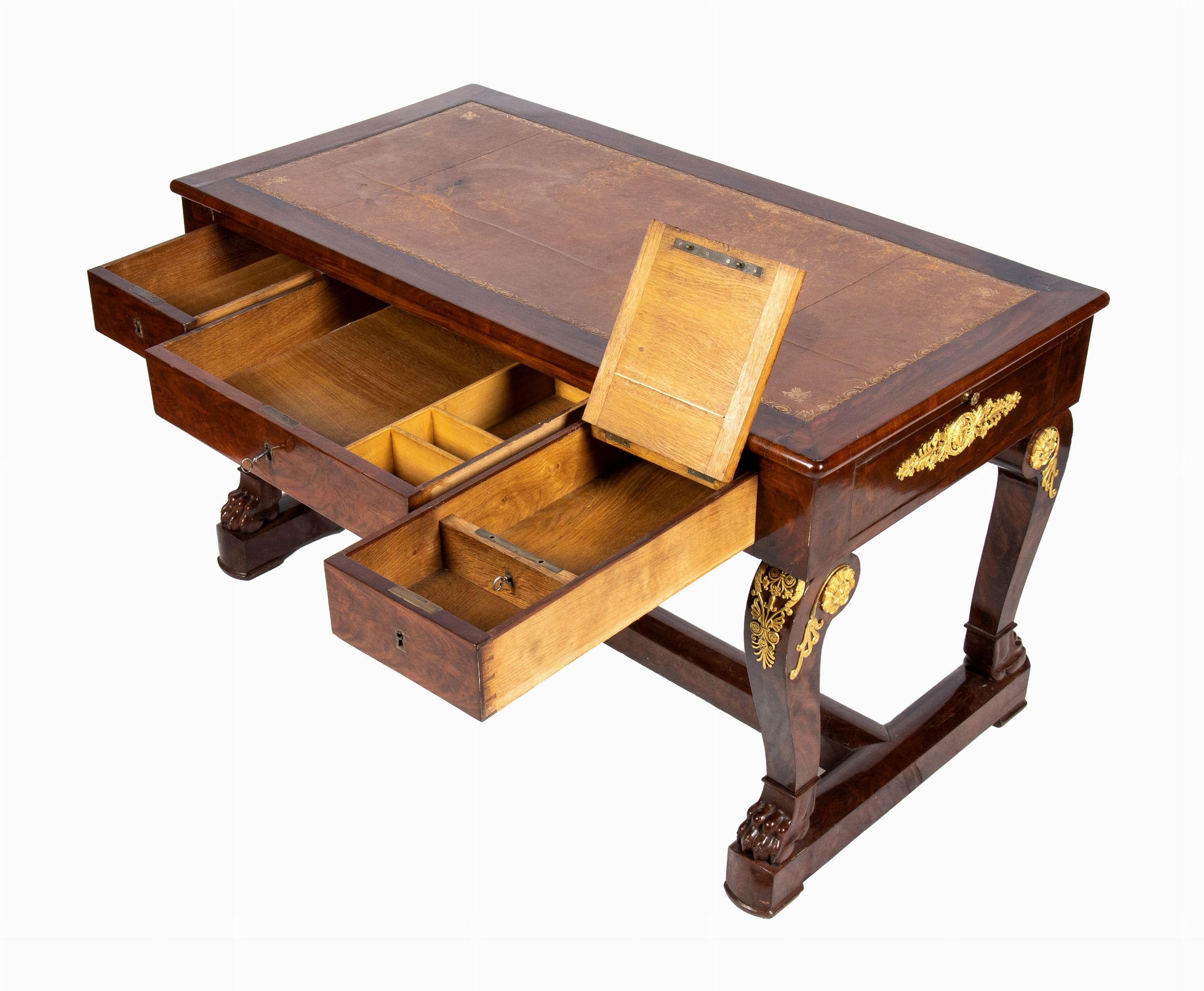 XIX secolo fronte con tre cassetti, con applicazioni in bronzo dorato. Piano in pelle. Stato di conservazione: **** buono.