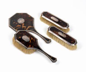 Larghezza x profondità : Specchio 26 x 13 cm; Spazzola 23 x 8 cm; Coppia spazzole piccole 16 x 5 cm Birmingham, 1926-1927 composta da specchio, spazzola grande e due spazzole. Argento 925/1000, serie completa di marchi Birmingham 1926-27, argentieri Solomon Blanckensee & Son Ltd. Stato di conservazione: **** buono.