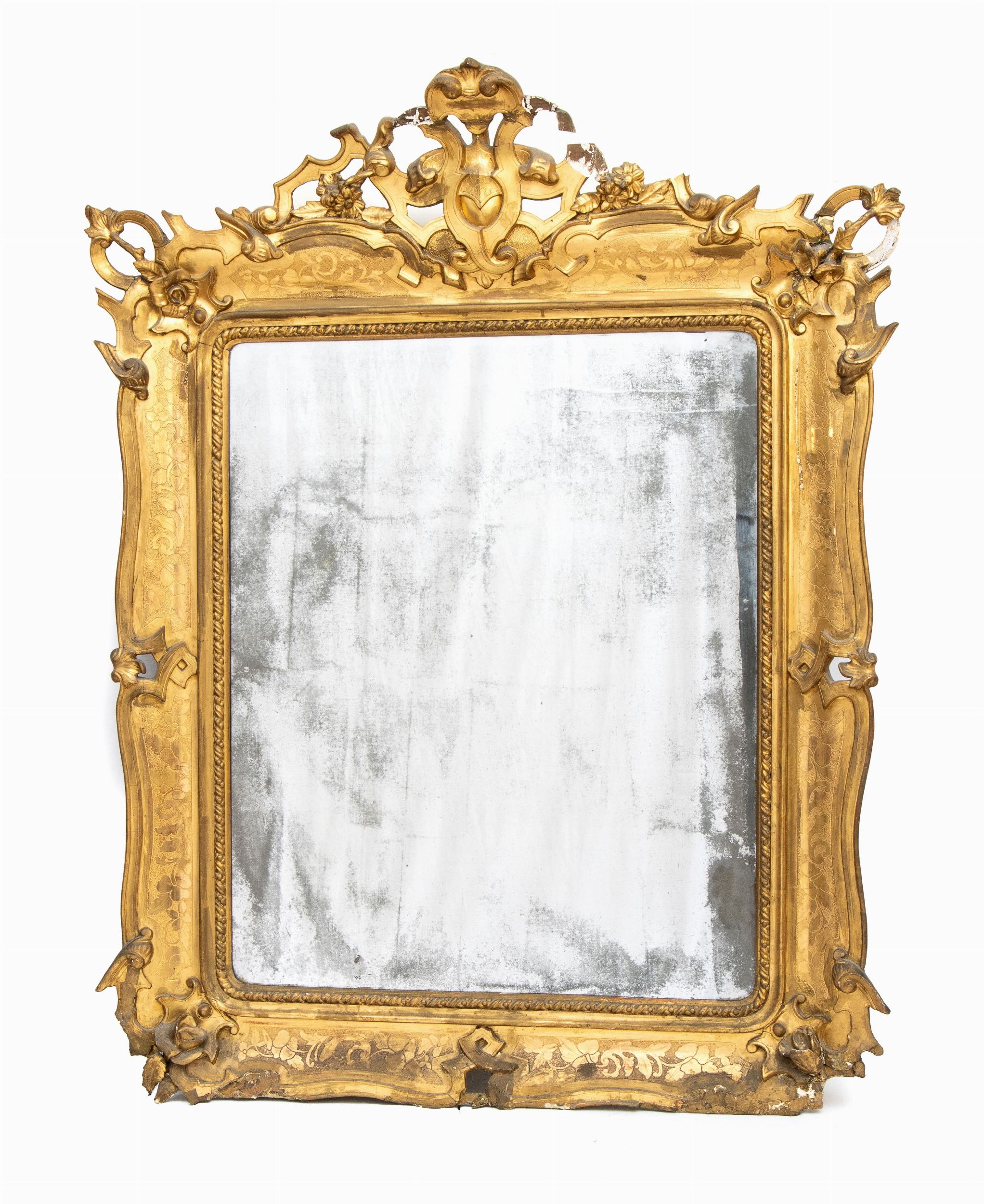 Altezza x larghezza 144 x 113 cm. XIX secolo cornice a guantiera, finemente arricchita da cimase e intagli , leggera serigrafia a foglie su tutto il perimetro della cornice e importante cimasa centrale. Stato di conservazione: **** buono, cimasa parte mancante e piccola mancanza laterale.