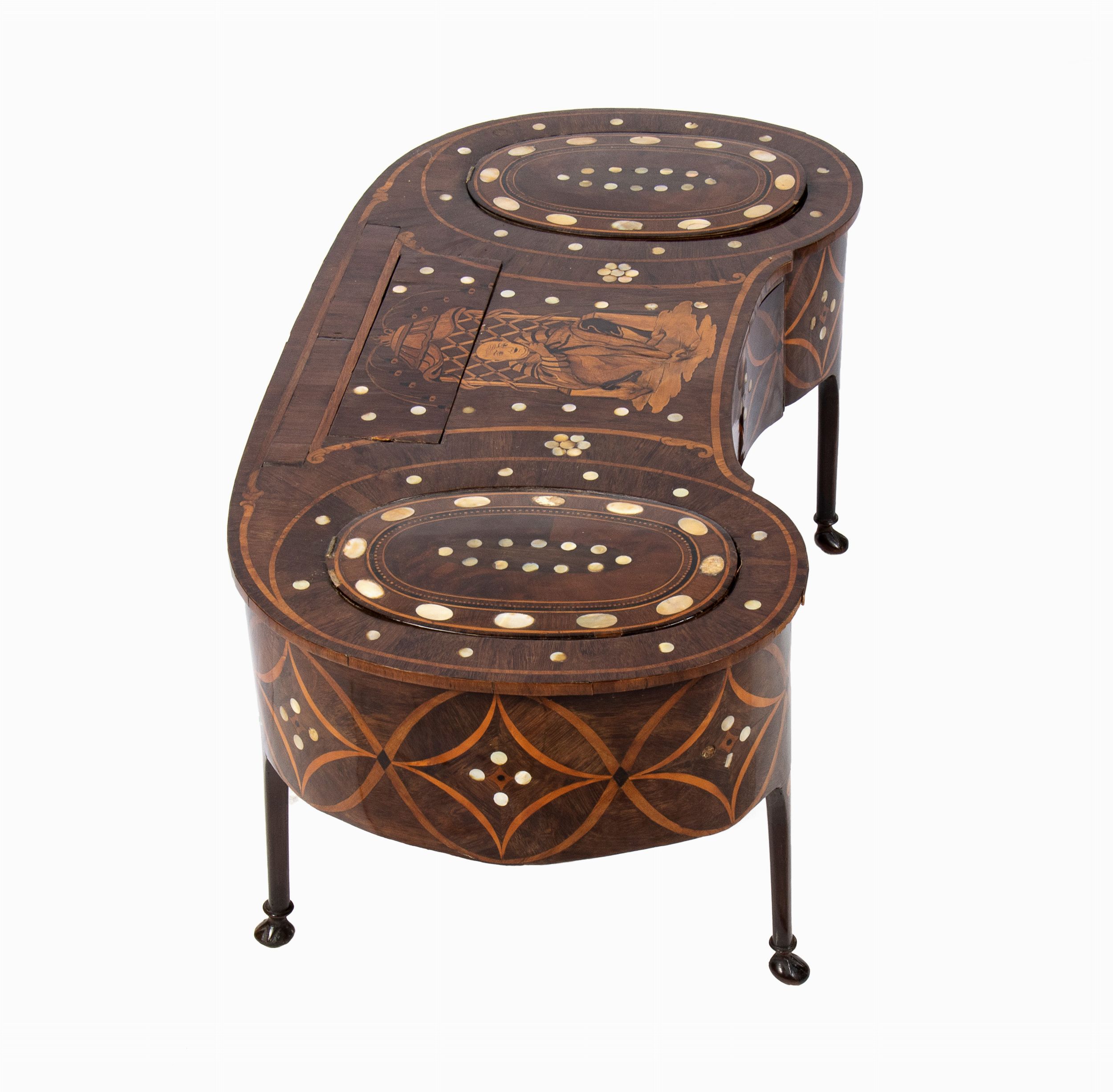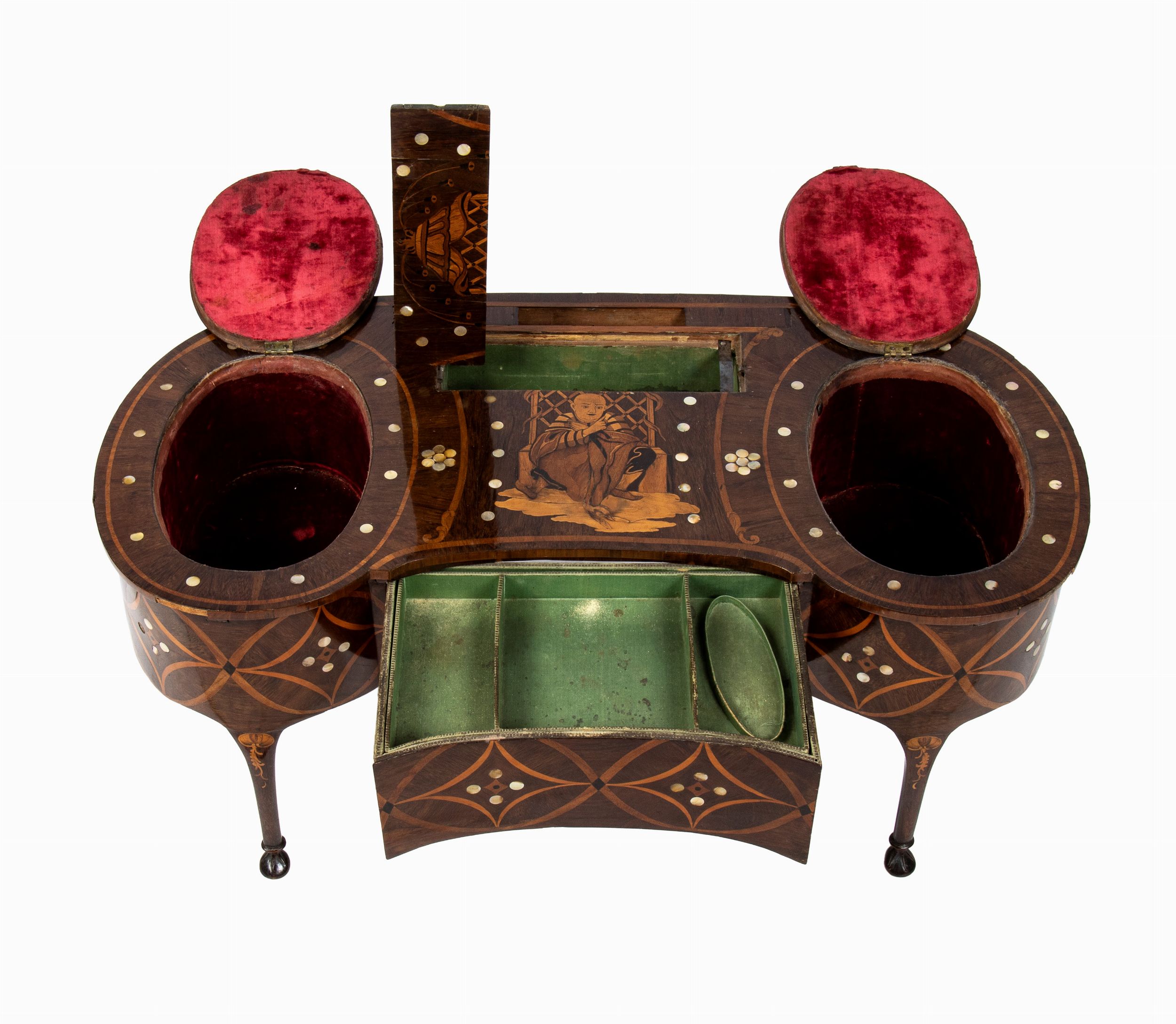 Altezza x Larghezza x Profondità 34 x 80 x 37 cm. XVIII secolo di area piemontese, il tavolino - scrittoio, finemente intarsiato, cela vani e segreti a scomparsa. Al centro del piano è presente un intarsio raffigurante una figura orientale, seguendo la moda dell'epoca. Stato di conservazione: **** buono, necessita di piccoli restauri conservativi.