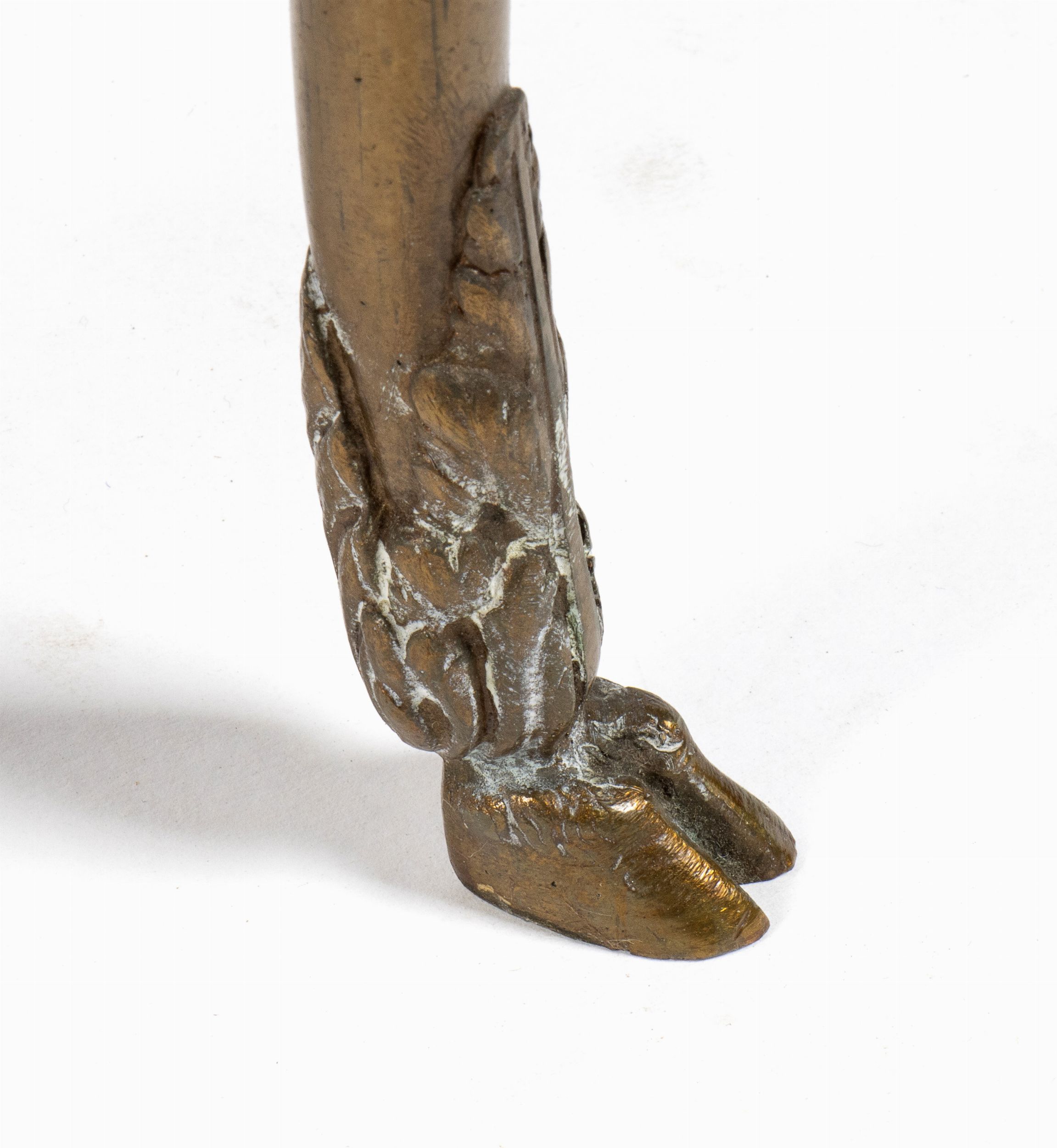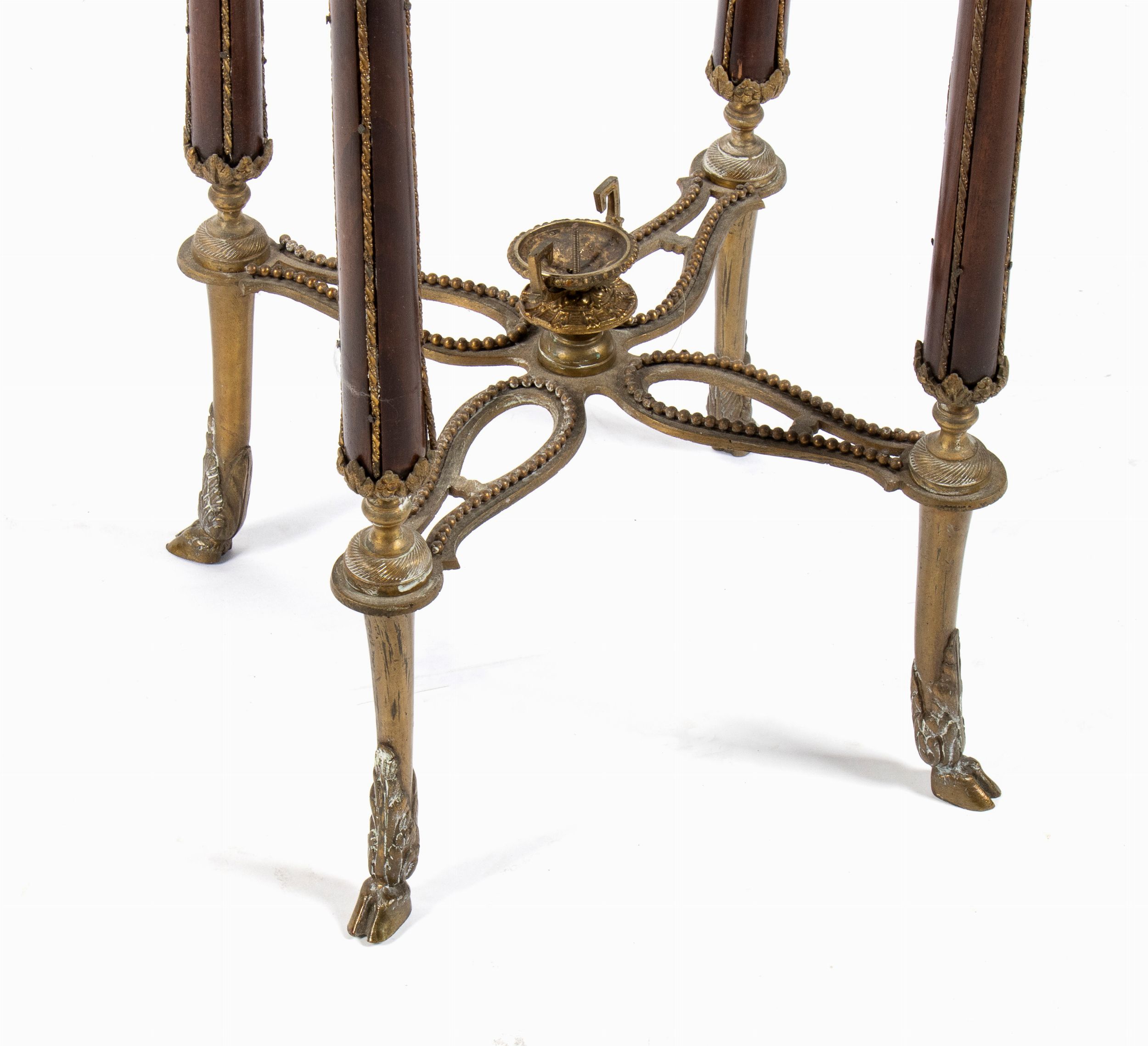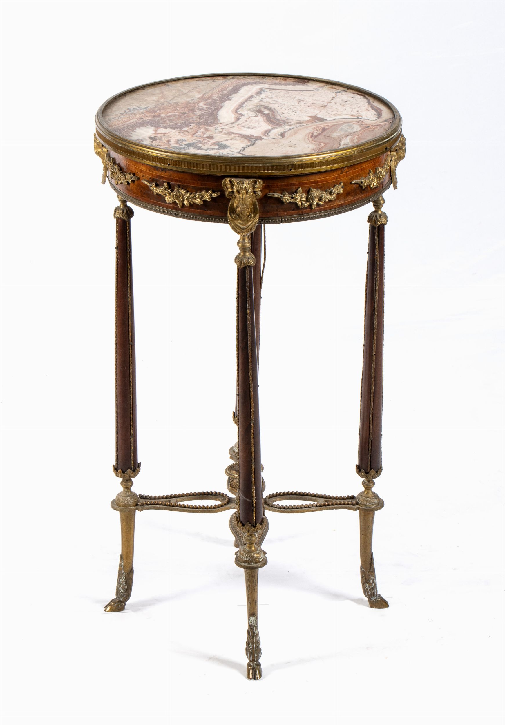 Dimensioni 73 x 40 cm. XVIII secolo in legno di radica di tuja, intarsiato in ebano viola e bosso e con piano in marmo. Sono presenti applicazioni in bronzo raffiguranti arieti, ghirlande e una crociera, sempre in bronzo, con parte finale con gambe caprine. Stato di conservazione: **** buono, mancante di parte in bronzo del piccolo vaso in bronzo.
