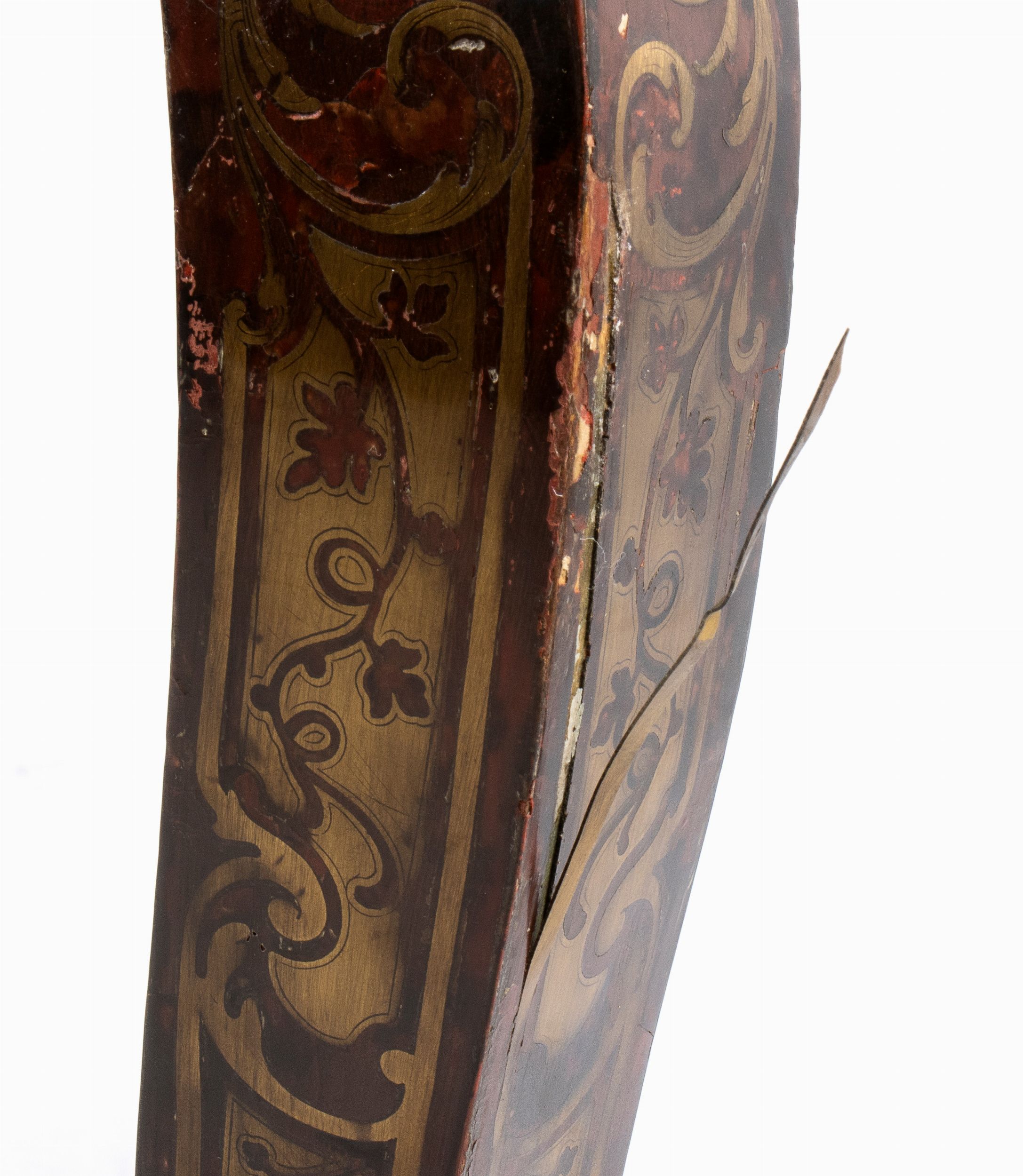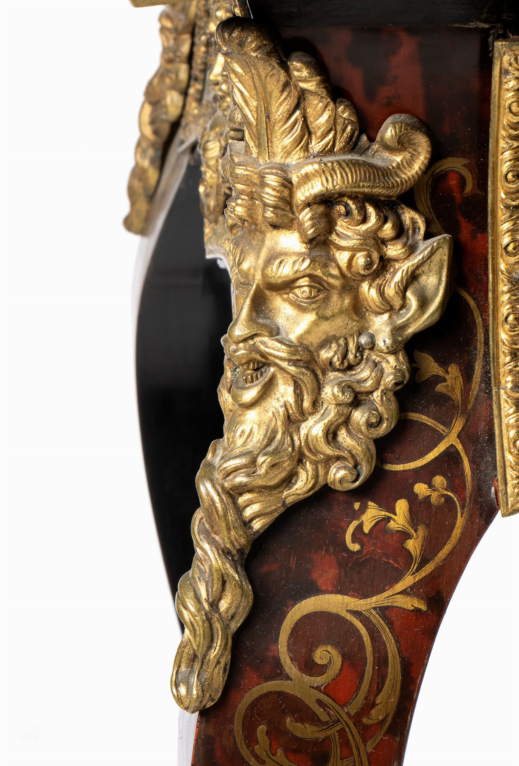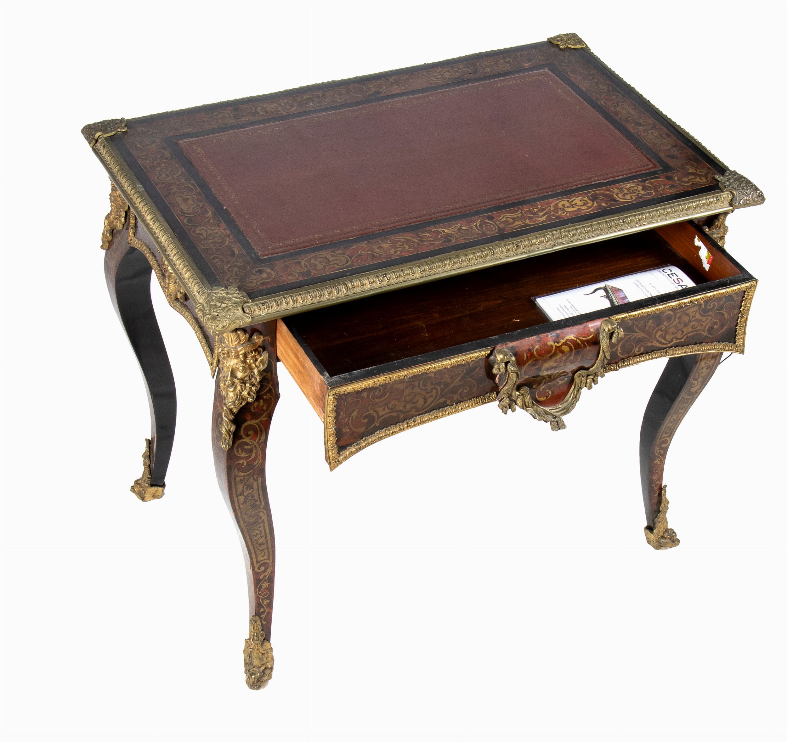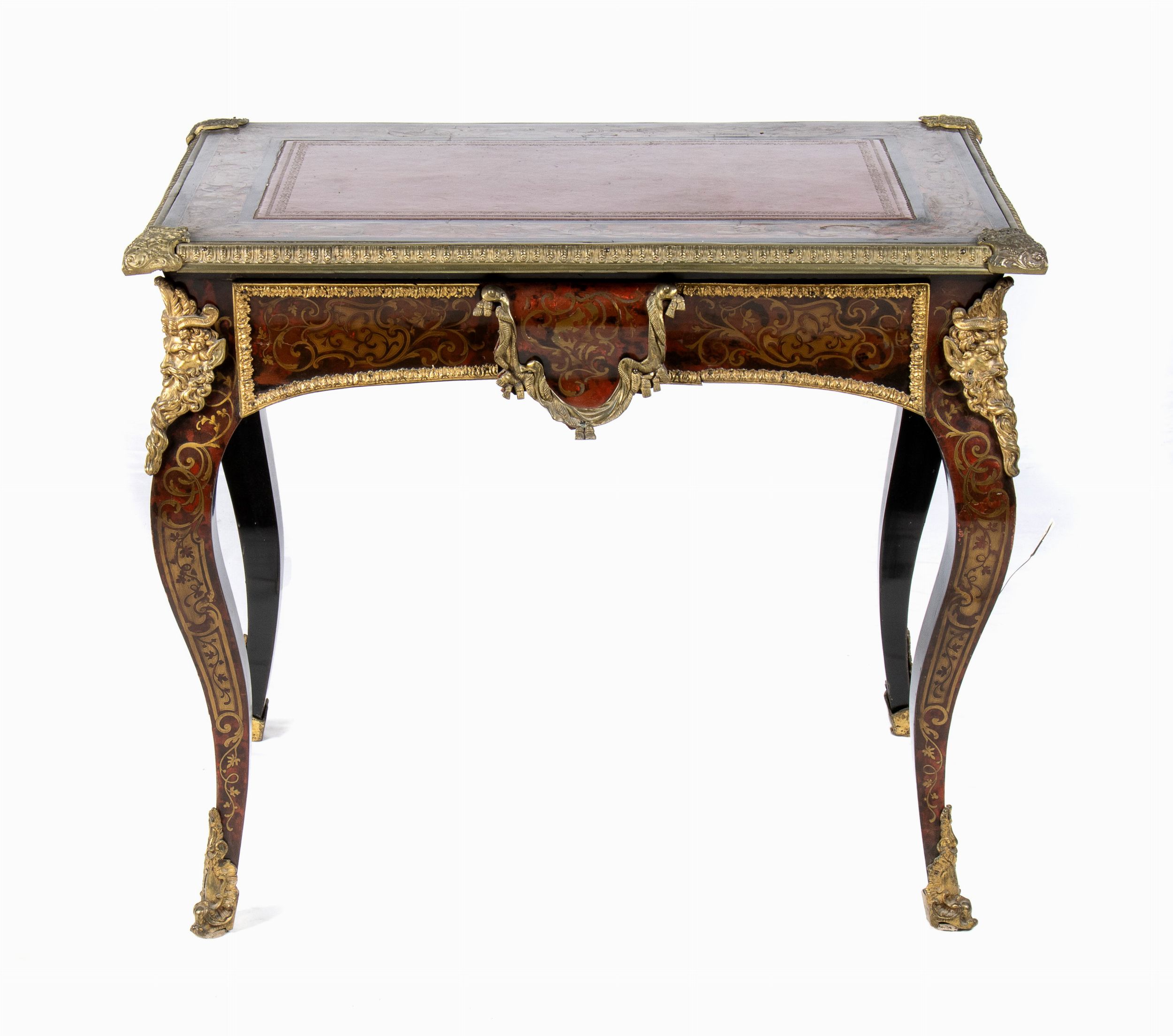 Altezza x larghezza x profondità : 69 x 83 x 56 cm XIX secolo in tartaruga e intarsiato in bronzo, nella classica maniera dell'ebanista Charles Boulle, con dettagli in bronzo raffiguranti satiri e Dionisio, piano in pelle rossa e un unico cassetto centrale mosso sul fronte. Stato di conservazione: **** buono, lievi difetti.