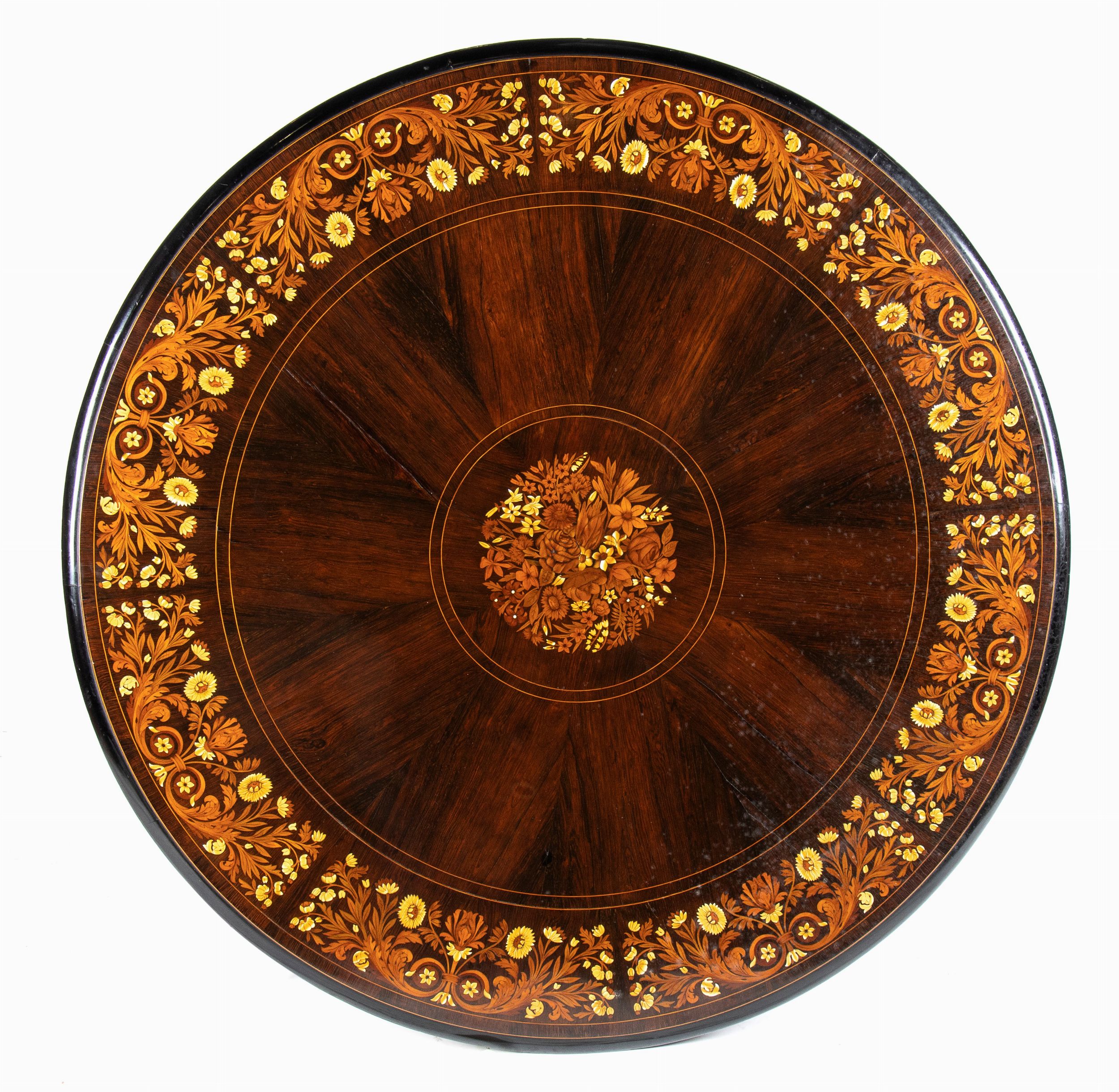 Altezza x diametro: 72 x 130 cm XIX secolo in legno di palissandro, finemente intarsiato in osso e legni di frutto a motivi floreali, sul bordo e nella parte centrale. Il piano è sorretto da una base tripodein legno di noce nel classico stile vittoriano. Stato di conservazione: **** buono, rottura di un piede del basamento .