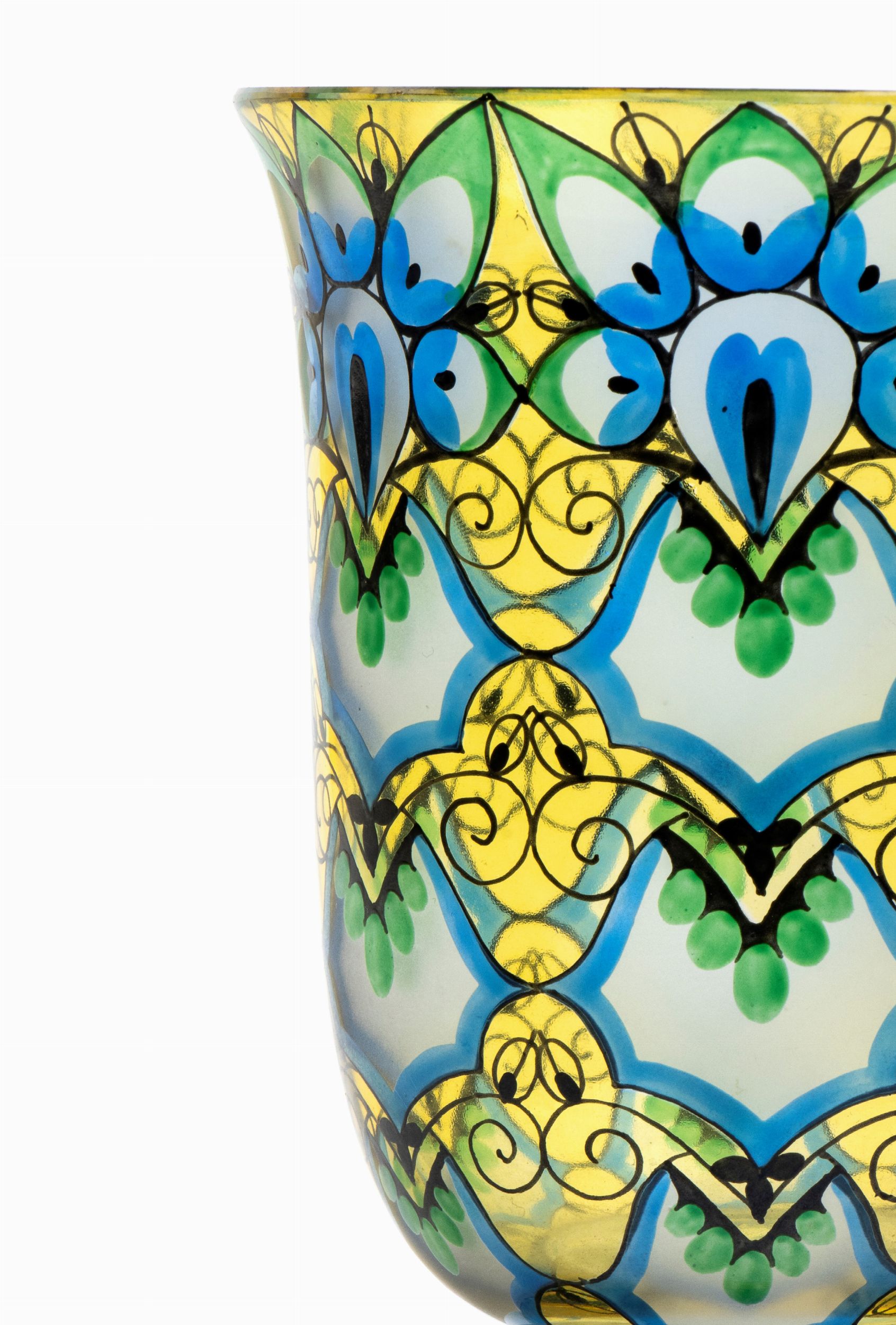 Inizio XX secolo in vetro soffiato di colore giallo a decori geometrici policromi. Stato di conservazione: **** buono, minori segni d'uso commensurati all'uso nel tempo.