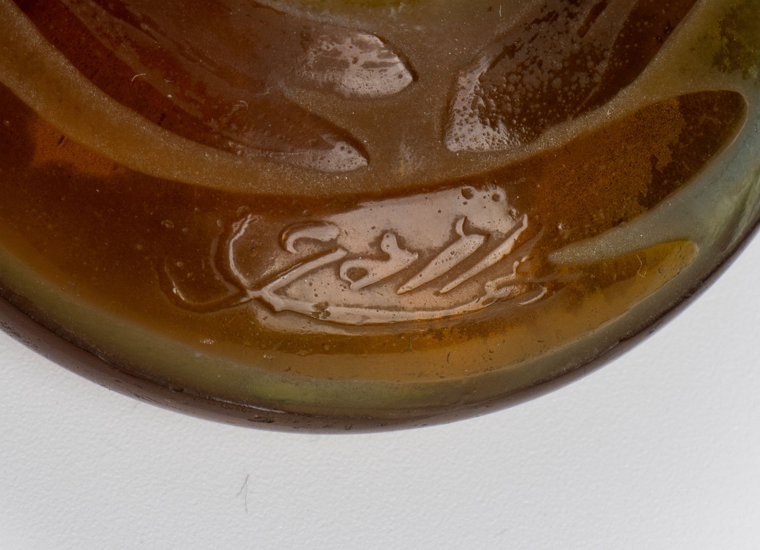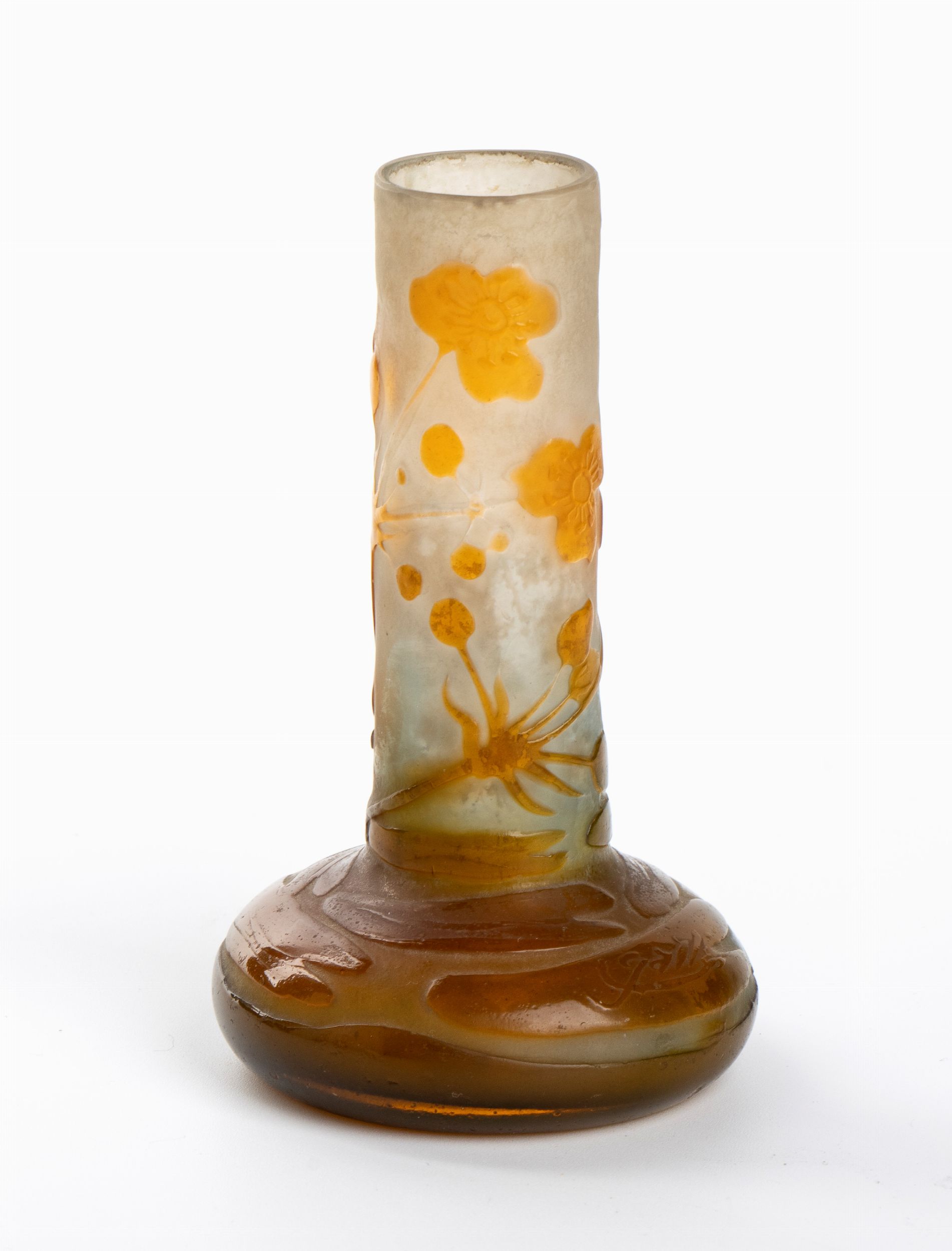 Altezza x diametro: 9,5 x 6 cm. Peso: 95 gr. piccolo vaso soliflore in vetro chiaro doppiato in giallo, inciso all'acido con decoro floreale. Firmato a cammeo Gallè. Stato di conservazione: **** buono, minori segni d'uso commensurati all'uso nel tempo.