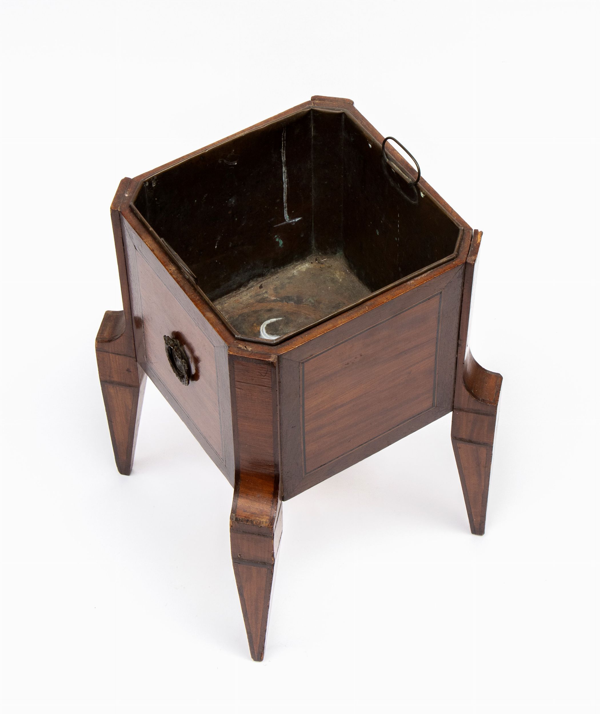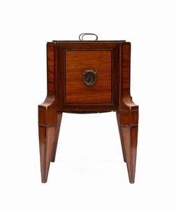 XIX secolo portabottiglie vittoriano in legno di mogano con filettatura in satin wood e contenitore metallico interno. Inghilterra ultimo quarto XIX secolo. Stato di conservazione: **** buono.