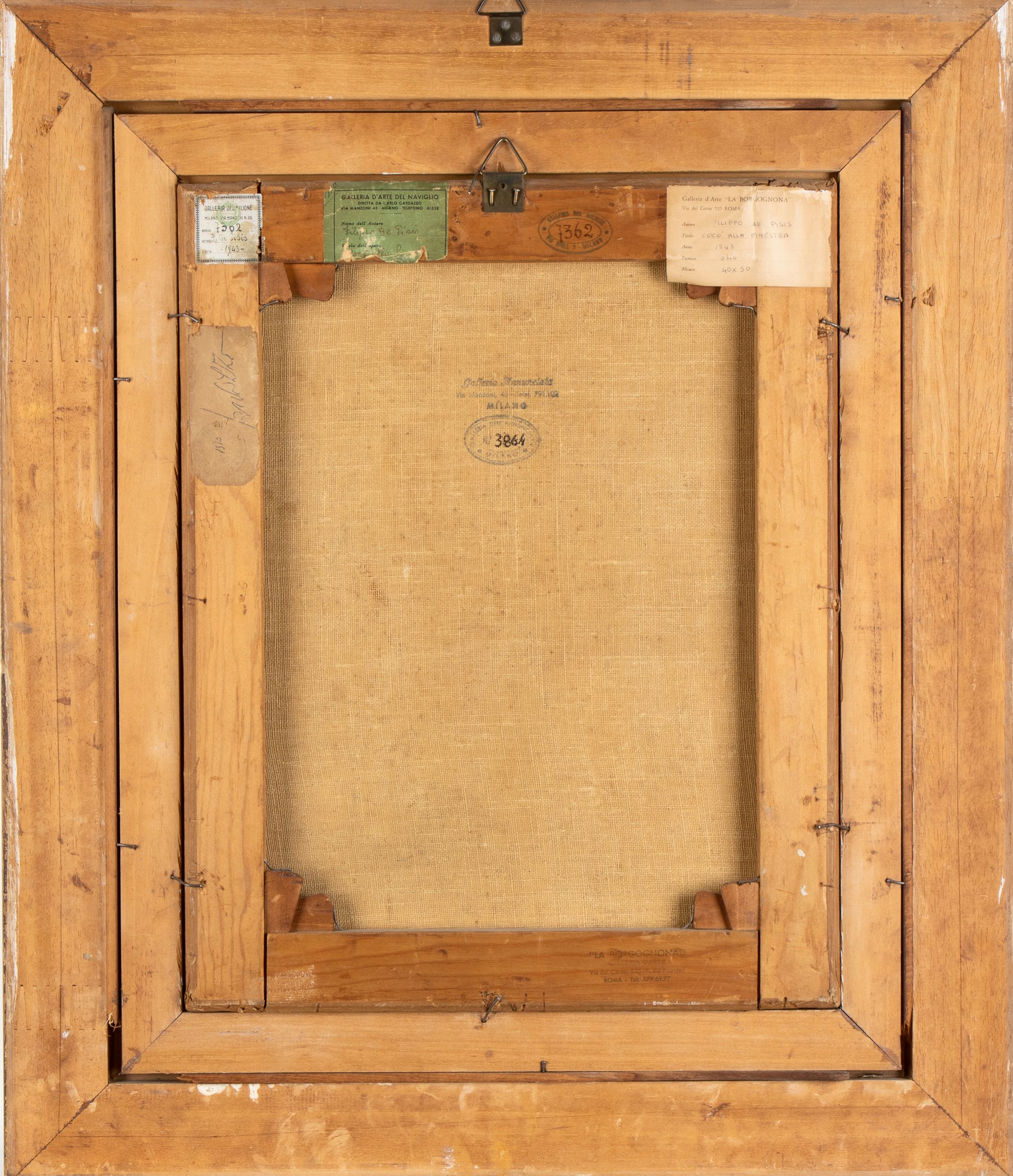 Olio su tela, 50 x 40 cm Anni '40 ca. Il soggetto rappresentato nel dipinto, ovvero il pappagallo Cocò, è ricorrente nella produzione artistica di Filippo De Pisis. L'animale era solito essere rappresentato nei dipinti degli anni 40 circa e non era raro, secondo i racconti dell'epoca, incontrare l'artista passeggiare per Venezia con Cocò sulla spalla. Allo stesso Cocò Filippo De Pisis dedicò poesie. Al retro varie etichette: Galleria del Milione di Milano, Galleria d'arte del Naviglio di Milano e Galleria d'arte La Borgognona di Roma in più timbri della Galleria Annunciata di Milano, della Galleria Borgognona di Roma, della Galleria del Milione di Milano e della Galleria d'arte del Naviglio