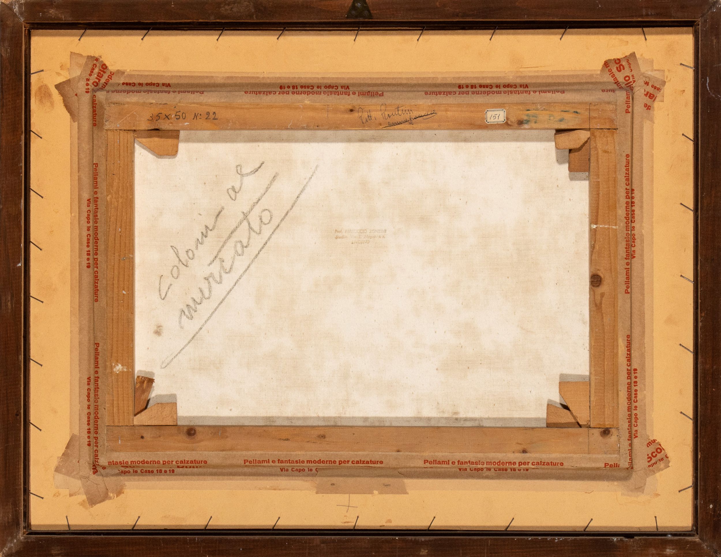 1958 Firmato e dtato in basso a destra: F. Rontini, 58; titolato al retro: Coloni al mercato e timbro del Prof. Ferruccio Rontini, Livorno