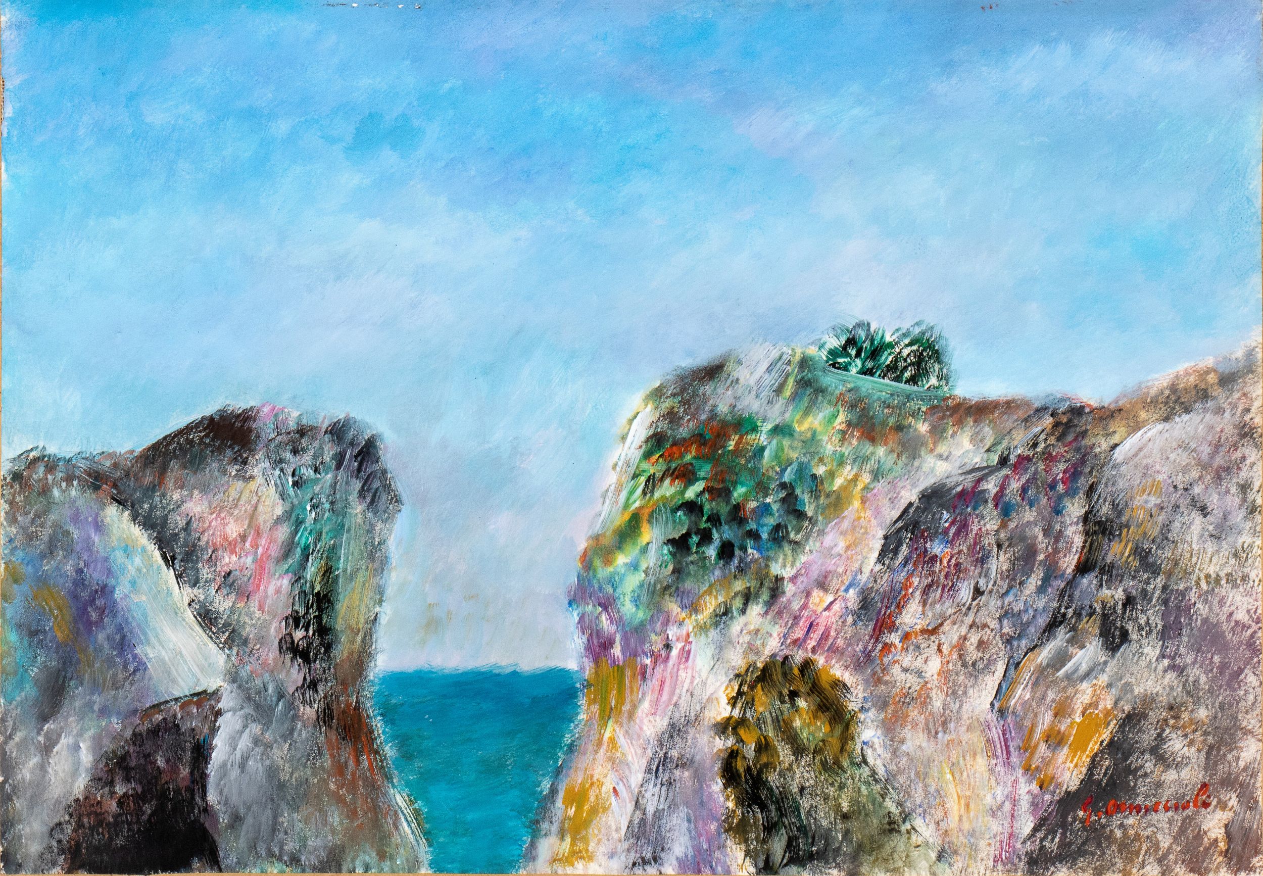 1974 Firmato in basso a destra: G. Omiccioli, al retro firmato, titolato e datato: Giovanni Omiccioli, Roccia e mare, Scilla 74. Timbri delle Gallerie Lisi e Campaiola di Roma