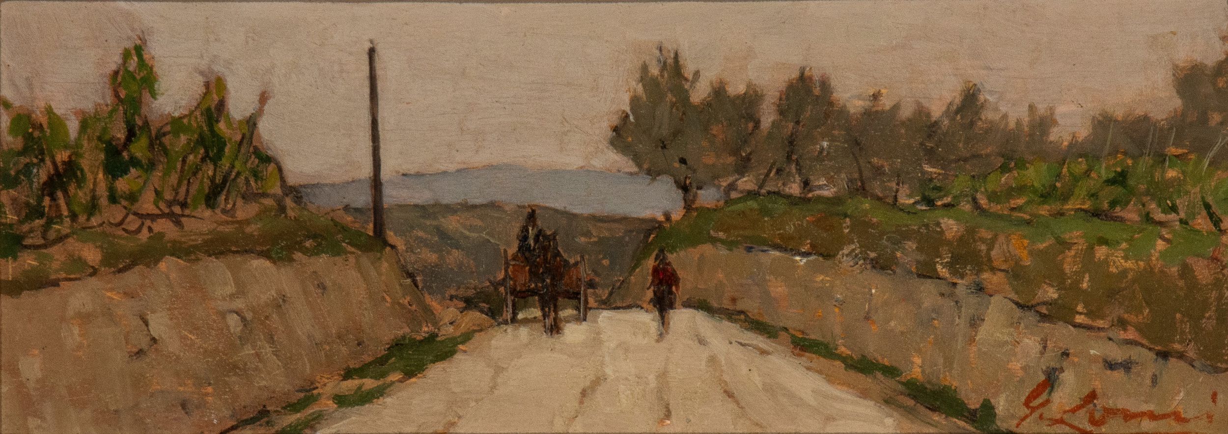 Firmato in basso a destra: G. Lomi; titolato e firmato al retro: Giovanni Lomi, Strada di campagna a San Casciano