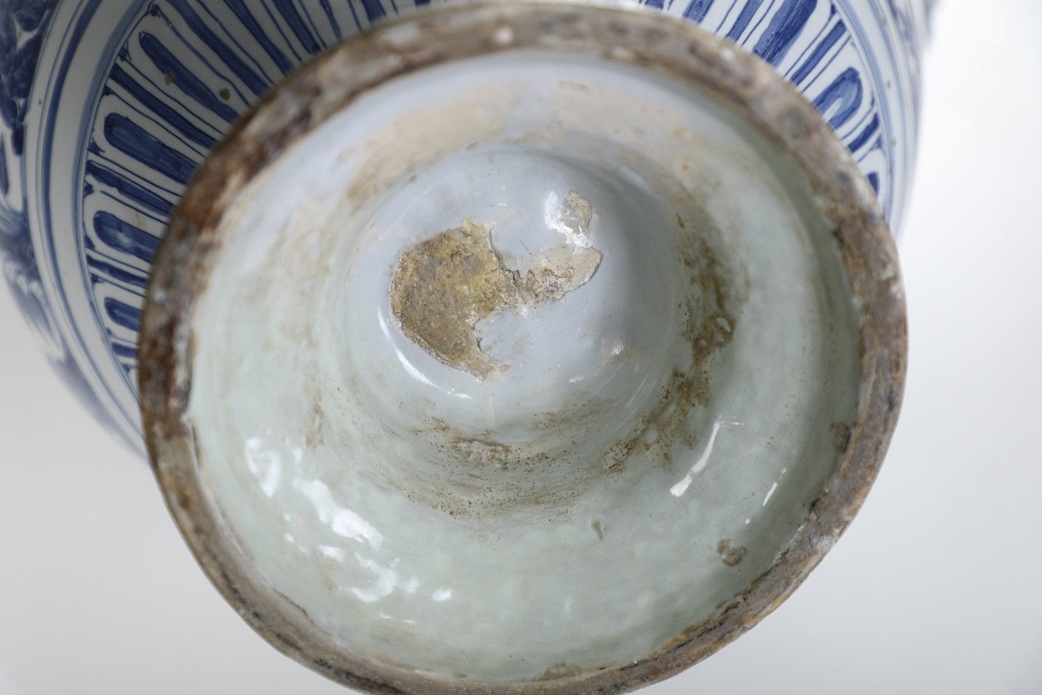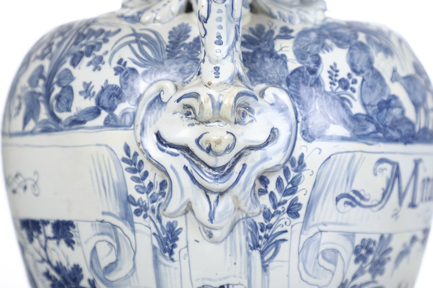 Maiolica. Marca: assente. Altezza cm 41 circa. Conservazione: il vaso per acqua di cicoria presenta parte del piede rotto in 4 frammenti e ricomposto; piccoli restauri al bordo superiore e a qualche piccola caduta di smalto ai mascheroni; il vaso per acqua di luppoli presenta estesi restauri nell'emisfero superiore e a parte del piede. La presenza del simbolo dell’Ordine rende noto che il grande recipiente farmaceutico, privo di marca, era proprietà di un istituto della Compagnia di Gesù. La forma ovoidale del vaso, i caratteri estetici e le dimensioni del collo e del piede sono fra quelli tipici dei contenitori per le acque medicinali, nel caso l’acqua di cicoria. Non comuni sono invece le due anse ricurve e i relativi mascheroni di rinforzo, notevoli per l’aspetto scultoreo definito e possente delle loro forme naturali ibride. Posto l'uso effettivo, l’assenza del rubinetto inserito dichiara la scelta di attingere il contenuto. La sontuosa decorazione, monocroma blu su fondo “berettino”, oltre lo stemma e il fregio di elementi geometrici, comprende il soggetto istoriato sulla superficie anteriore. L’episodio sembra riferirsi alle missioni dei Gesuiti nell’estremo oriente, lo suggerisce la cornice ambientale, concepita in uno stile prossimo al “calligrafico naturalistico” ligure, ornato esteso all’intera superficie vasale. La scritta che si legge sulla parte posteriore dell’unico cartiglio epigrafico spiega però l’avvenimento: il religioso in ginocchio “Quae Virgo loquitur ipse scribit”, alla lettera “le cose che la Vergine dice egli scrive”. Dunque sant’Ignazio compone, dettandoli la Madonna, gli Esercizi Spirituali, e il fatto avviene a Mansura, in Catalogna, l’anno 1522. Il vaso può considerarsi prodotto in Piemonte alla metà circa del XVII secolo Il vaso è simile al precedente in ogni suo aspetto, formale, decorativo, cromatico, e come l’altro privo di marca. Mutano il medicinale contenuto, acqua di luppoli, e la figurazione istoriata sulla superficie anteriore: due religiosi gesuiti sono a colloquio nel vasto e soleggiato paesaggio esotico, mentre li sovrasta compiendo evoluzioni uno stormo di volatili. Tuttavia l’aspetto del sito potrebbe distinguersi dalla sede geografica reale dell’episodio. Anche la scritta sulla parte posteriore del cartiglio è diversa: “Mirabilis Deus in Sanctis suis”, alla lettera “Mirabile il Signore nei suoi santi”, versetto finale del salmo 67. Luogo di produzione il Piemonte, intorno alla metà del XVII secolo