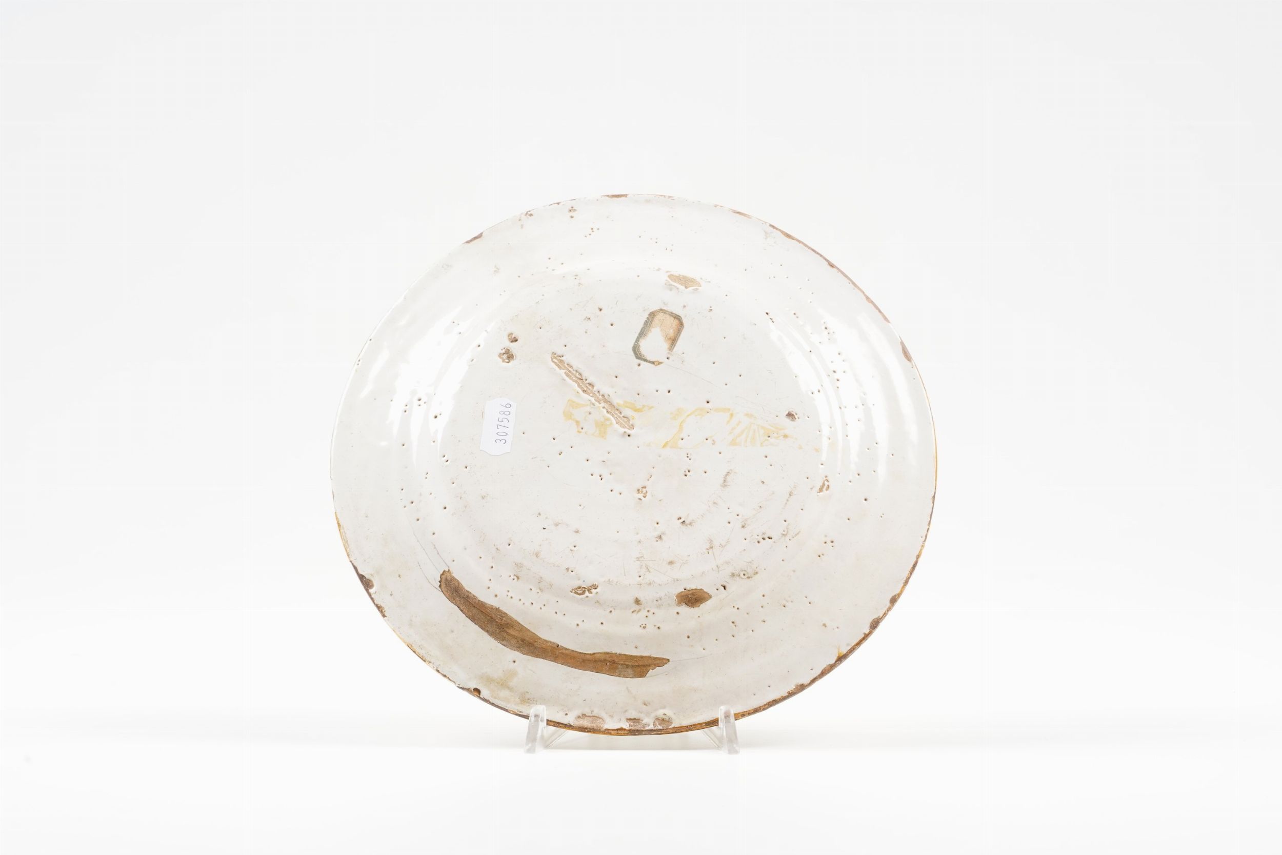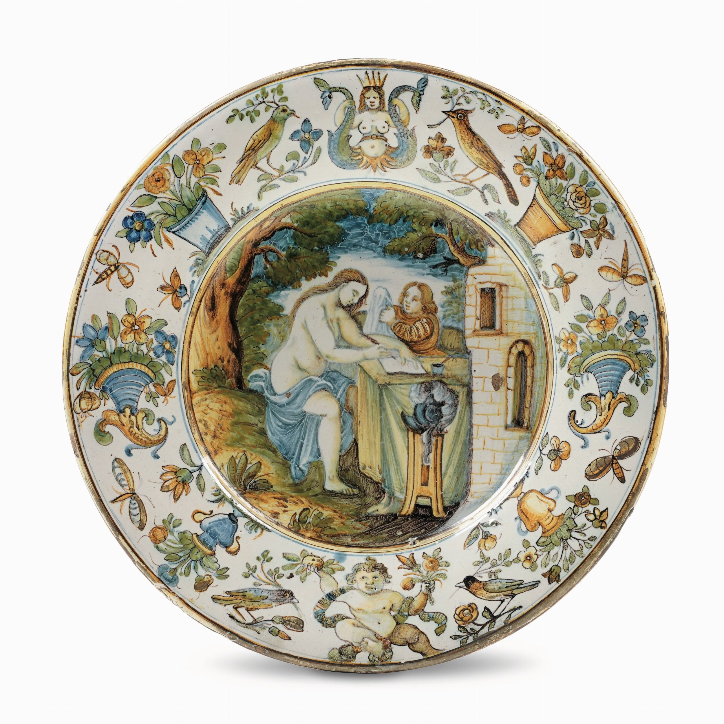 Maiolica. Diametro cm 24. Conservazione: ottima; cadute di smalto al bordo. Il nostro piatto è stato eseguito da un ignoto maestro castellano presso la bottega di Geronimo Pompei (1635-1691). Dipinto nel cavetto con una scena istoriata, forse allegorica, presenta sulla tesa vari tipi di ornati complementari quali vasi e cornucopie con fiori, uccellini, insetti in volo. In alto troviamo una sirena bicaudata - una donna nuda a mezzo busto che tiene in ciascuna mano una coda a squame e porta sulla testa una corona appuntita - in basso un fanciullo ignudo con frutti e fiori in mano. Per una maiolica di questa tipologia vedi ad esempio la tazza da barba pubblicata da F.G.M. Battistella-V. de Pompeis, Le Maioliche di Castelli. Dal Rinascimento al Neoclassicismo, Pescara 2005, p. 124, n. 123