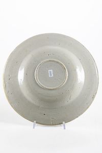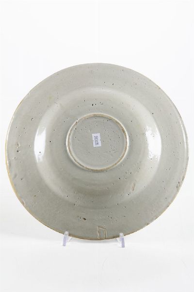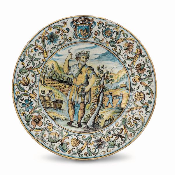 Maiolica policroma a gran fuoco Diametro: cm 29. Conservazione: ottima; insignificanti sbeccature al bordo. Il cavetto del piatto è campito dall’Allegoria dell’Autunno raffigurata da un vendemmiatore in primo piano accanto ad un arbusto di vite con grappoli d’uva. Nell’ampio paesaggio, in secondo piano, due contadini trasportano l’uva e uno lavora accanto ai tini e alle botti. La tesa a racemi con foglie e fiori ospita in alto uno stemma araldico racchiuso in uno scudo dominato da un elmo piumato
