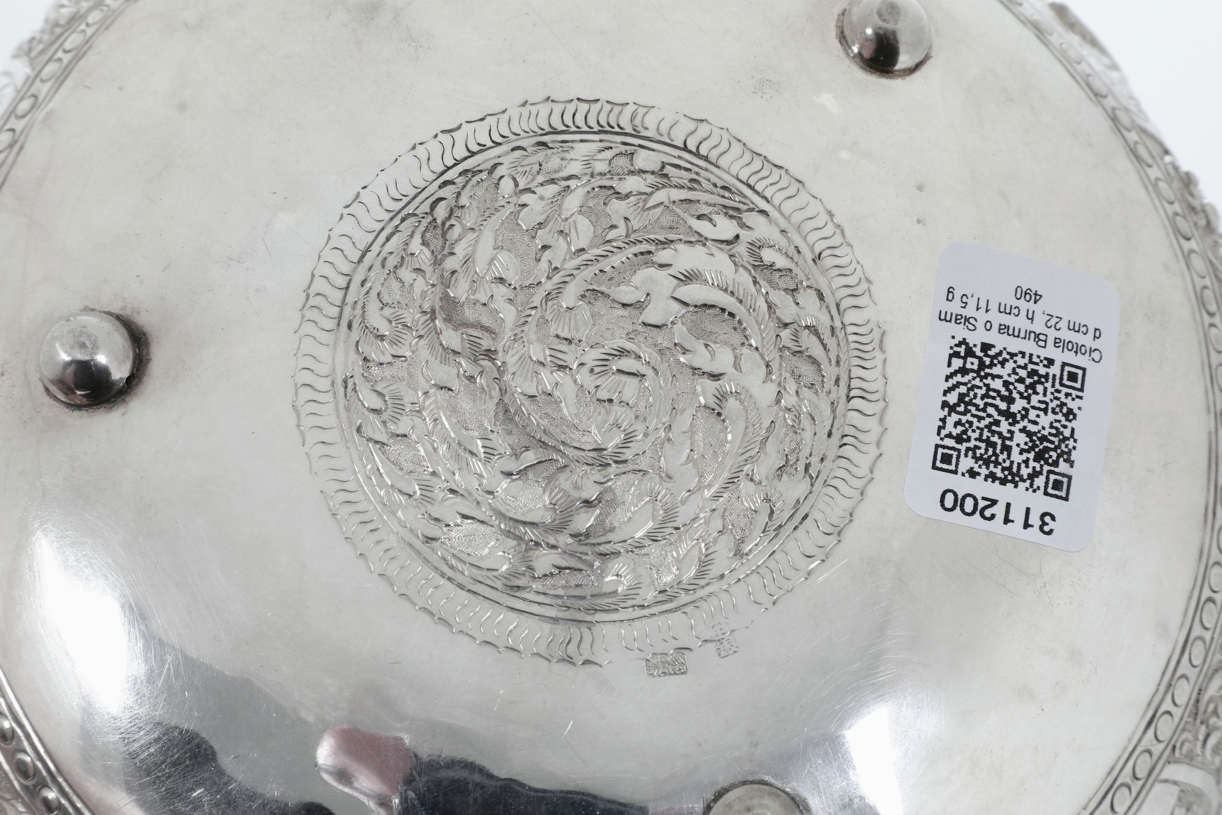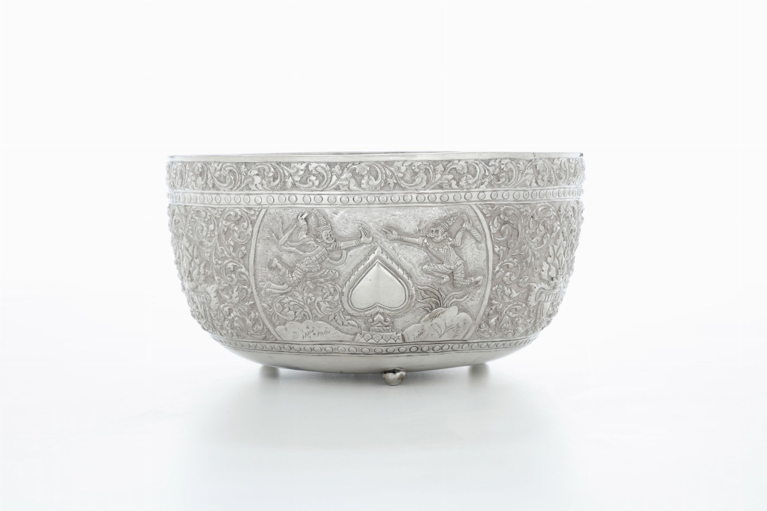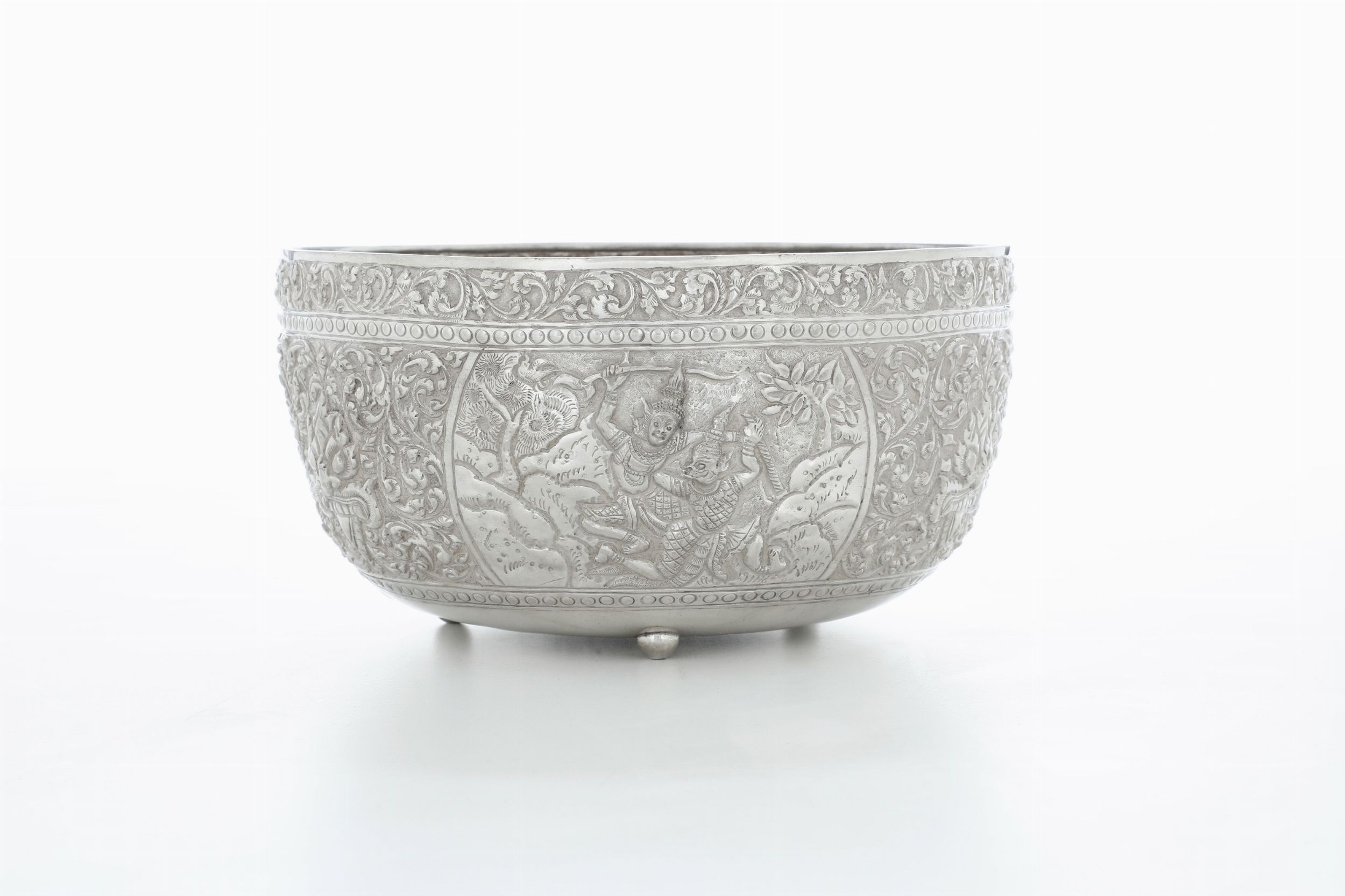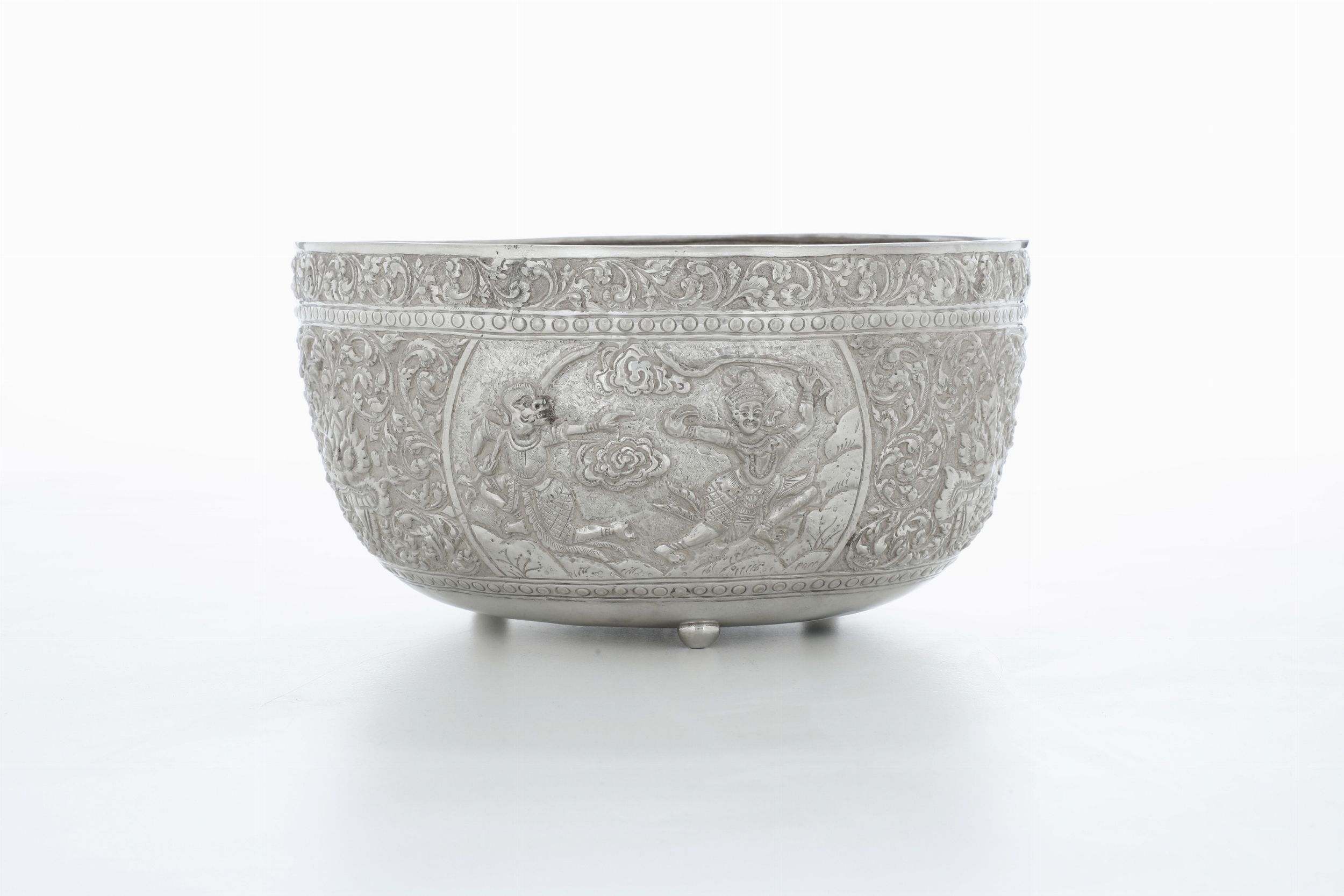 Ciotola cesellata a mano con raffigurazioni dal poema epico Ramakien. Siam (Thailandia), [..]