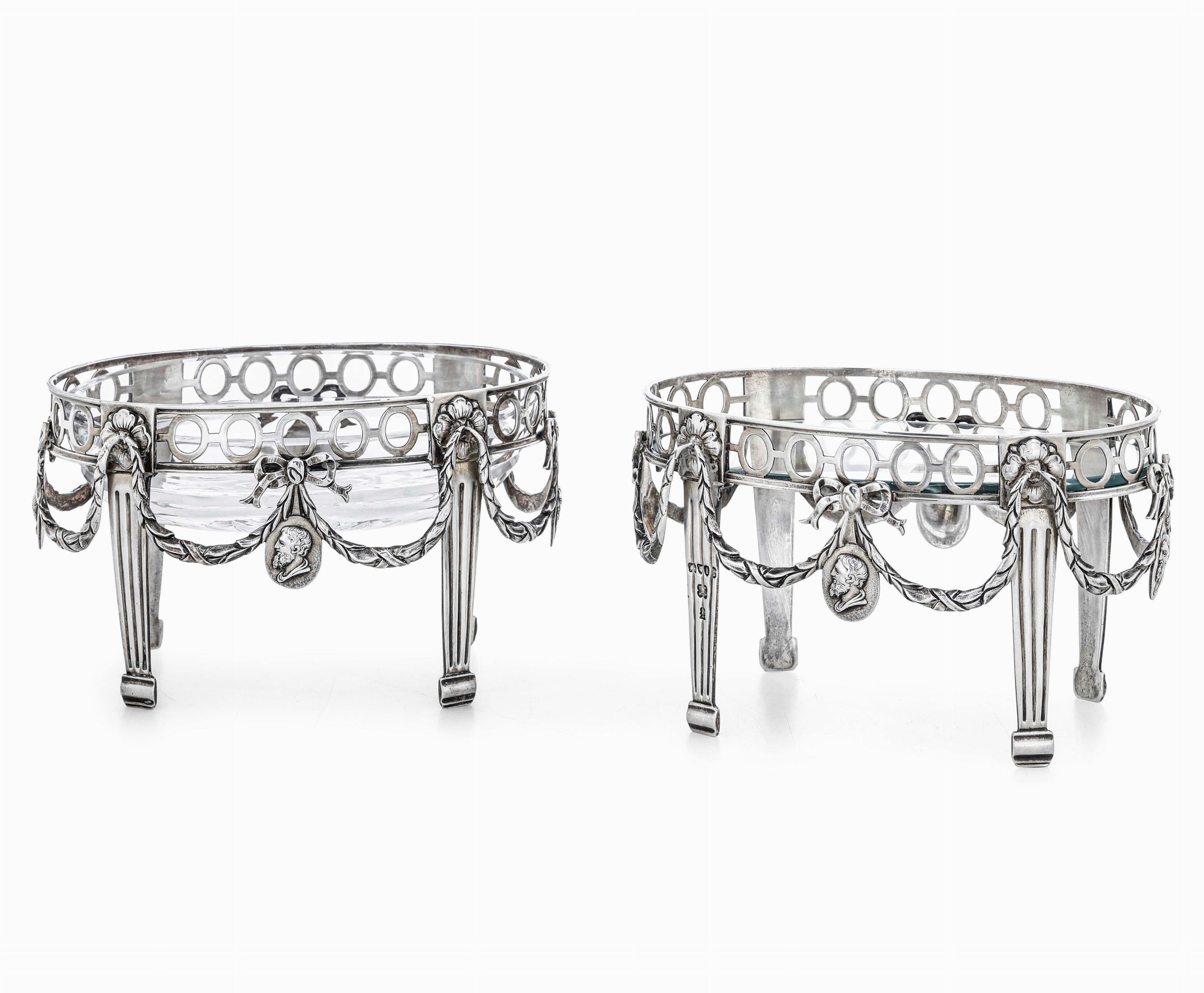 Coppia di alzate. Argento fuso, traforato, cesellato e vetro (non coevo). Londra [..]