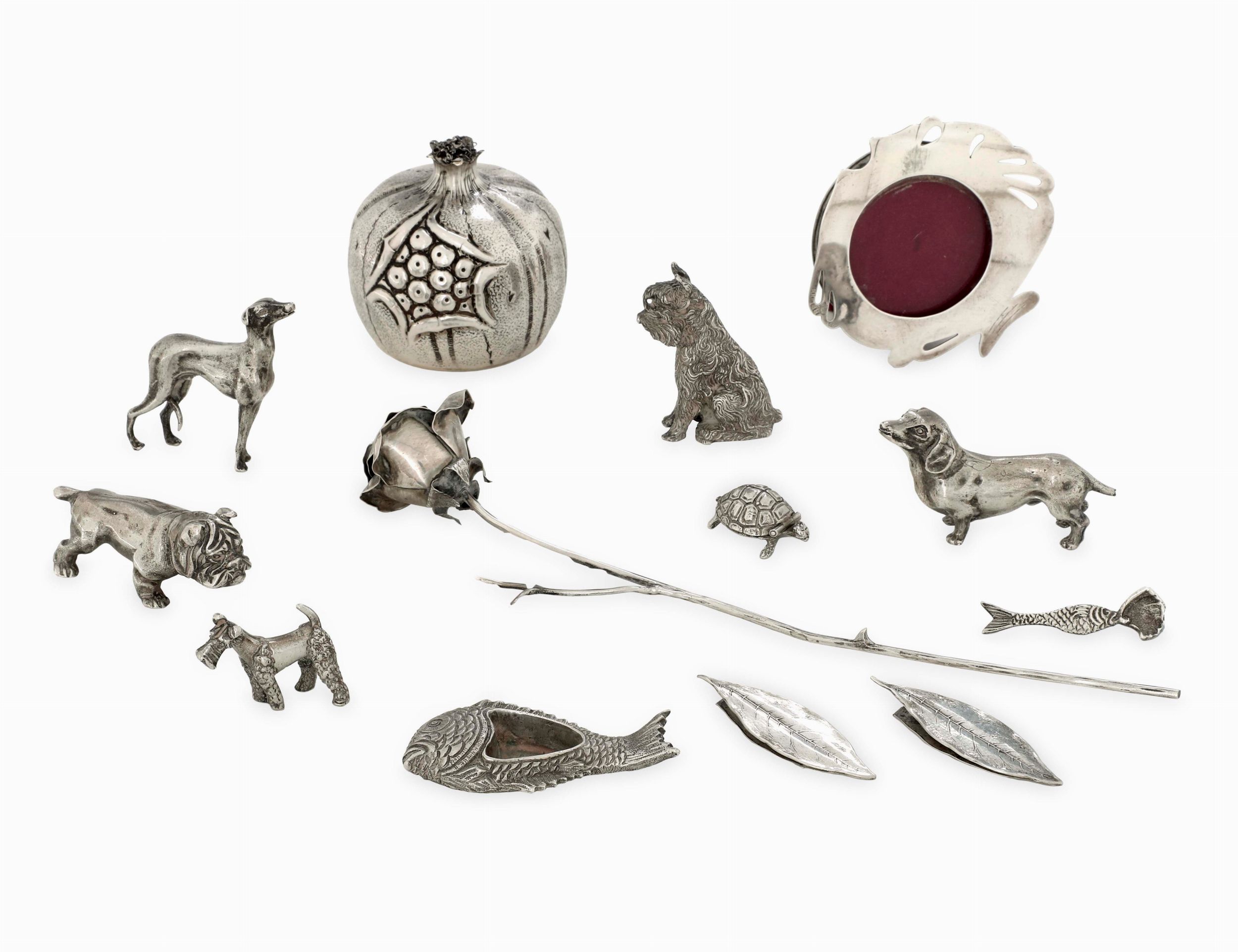 Gruppo di tredici oggetti a soggetto zoomorfo e fitomorfo. Argenteria artistica [..]