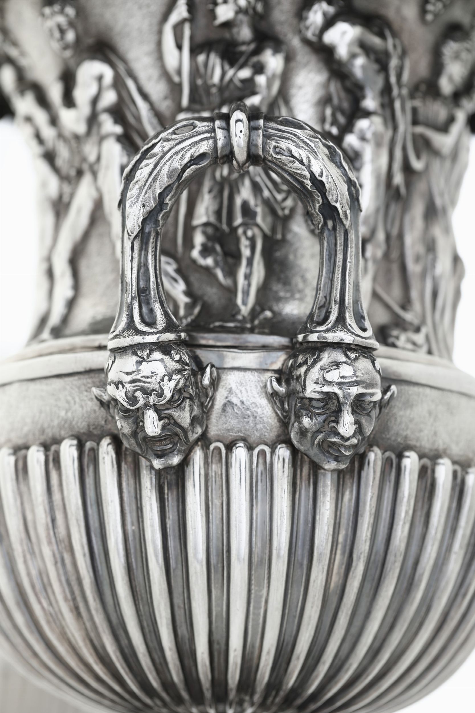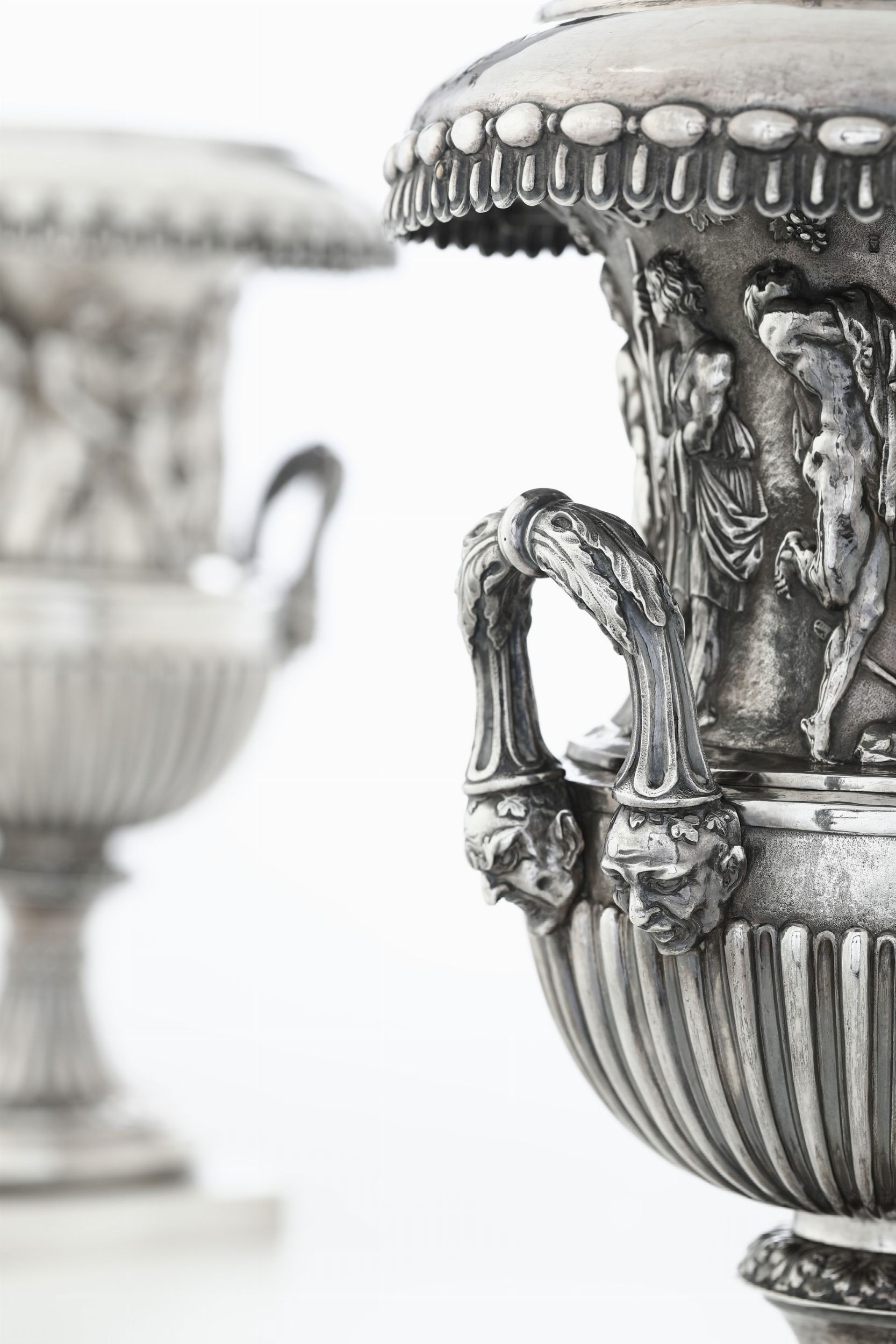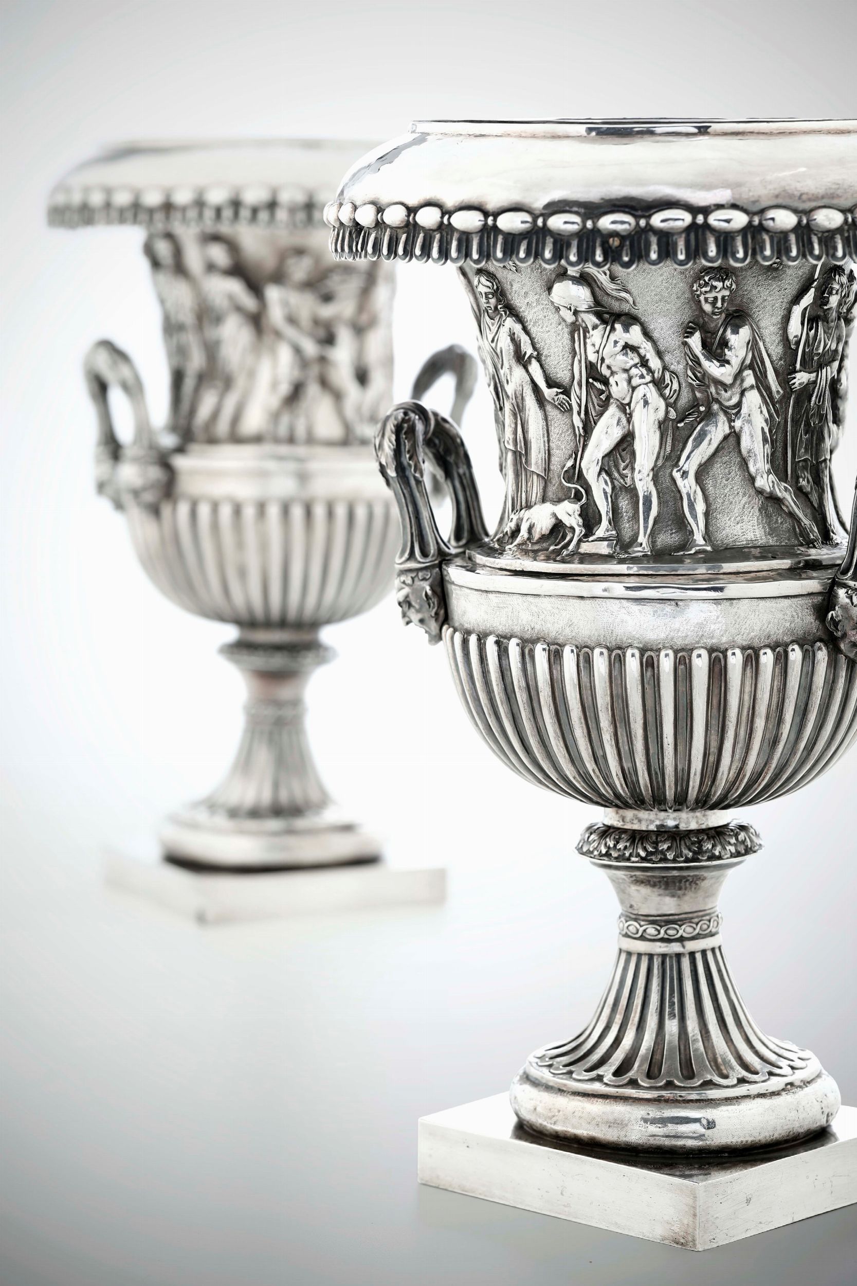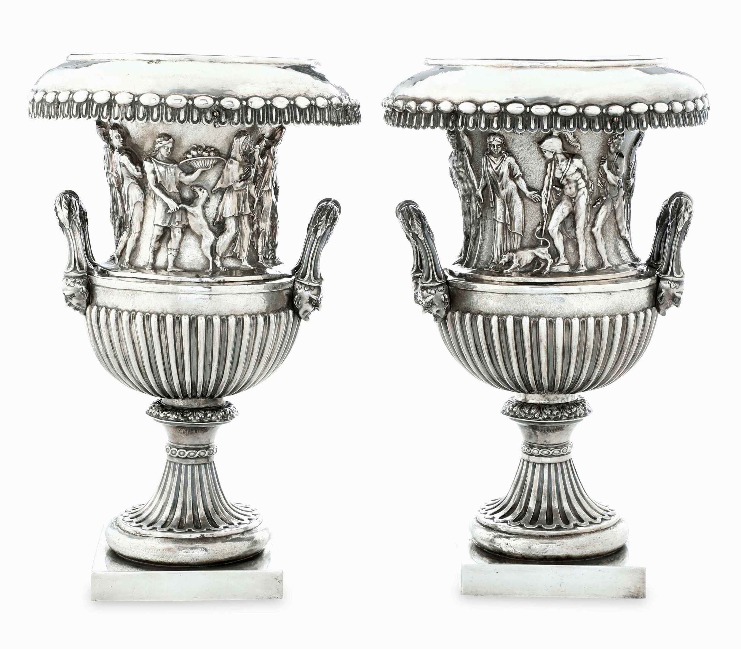 gr 5800Alt. 42 cm Eccezionale coppia di vasi 'a cratere' di gusto classico, rara ed importante testimonianza di oggetti profani ad uso civile ispirati alla classicità antica, appartenenti alla produzione veneziana della prima metà del XVIII secolo magnificamente eseguiti a fusione, sbalzo e cesello con motivi decorativi rastremati, baccellati, dentellati e ad ovulo. Rafforzano questa evocazione stilistica le due fasce orizzontali con raffigurazione allegoriche di personaggi maschili e femminili che si susseguono sotto un pergolato di vite tra danze, libagioni e scene di festa in un iconografia chiaramente ispirata al mondo greco-romano. Eseguite con grande raffinatezza anche le anse laterali fogliate e rastremate che poggiano su teste di satiro aggettanti. I due vasi nel tempo sono stati oggetto di lavori atti ad adattare il contenitore interno con viti e supporti per renderli più stabili compresa la creazione della base a plinto quadrata sottostante. Antichi interventi che testimoniano l'importanza da sempre riconosciuta a questi due splendidi manufatti. Le opere sono corredate da una scheda critica del Prof. Piero Pazzi