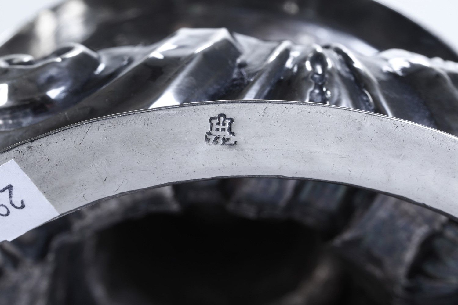 gr 740Largh. 15,5 - Alt. 21 Cm Base 'a panettone' sbalzata con motivi barocchi a volute e conchiglie stilizzate. Parte superiore con piatto circolare concavo e fusto a balaustro. CFR: 'ARGENTI GENOVESI' Gianna Roccatagliata, Ed. De ferrari Genova 2002 pag 92 'L'ARGENTERIA GENOVESE DEL SETTECENTO' F. Broggero e F. Simonetti, Ed. Umberto Allemandi & C Torino 2007 pag 165 tav 5