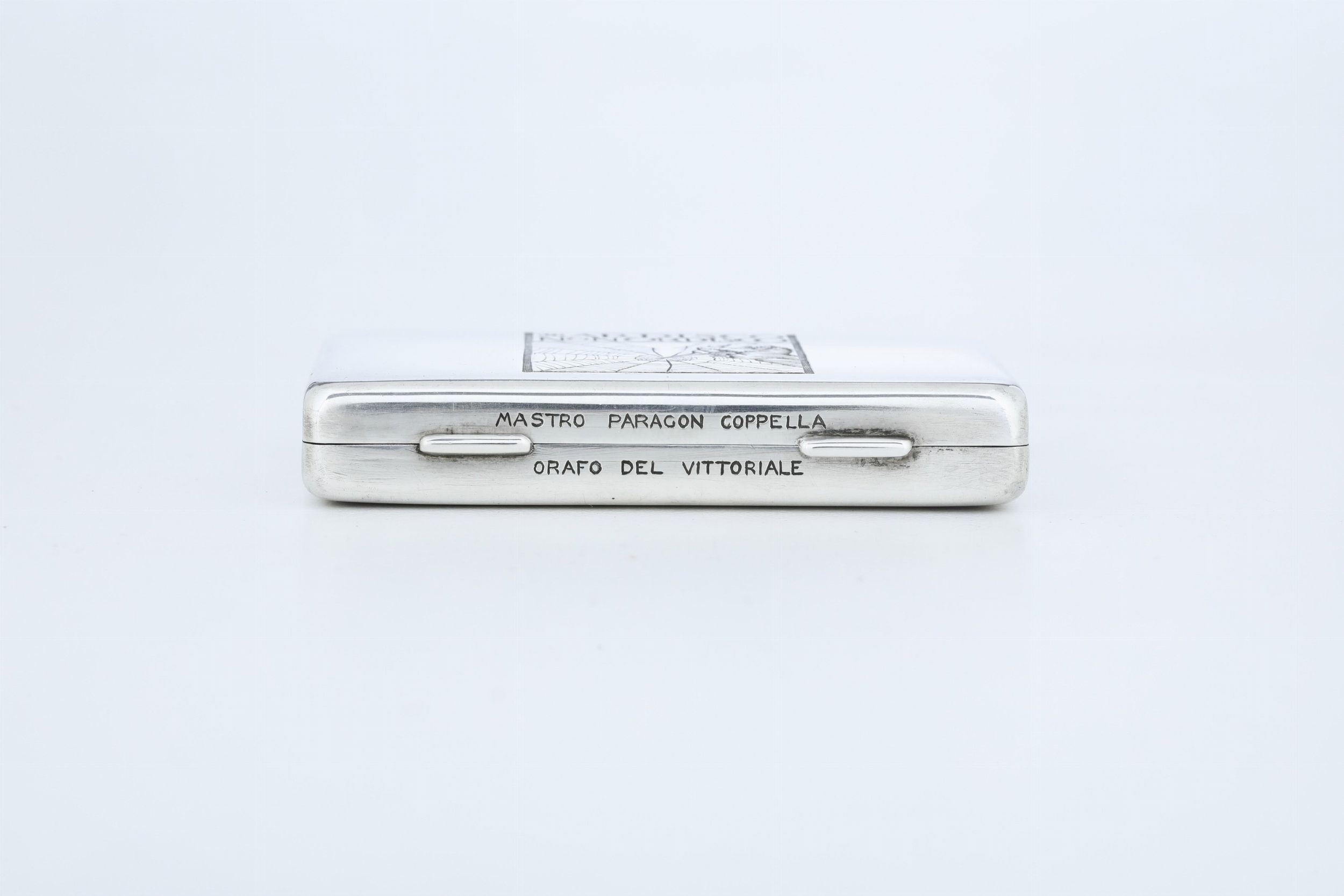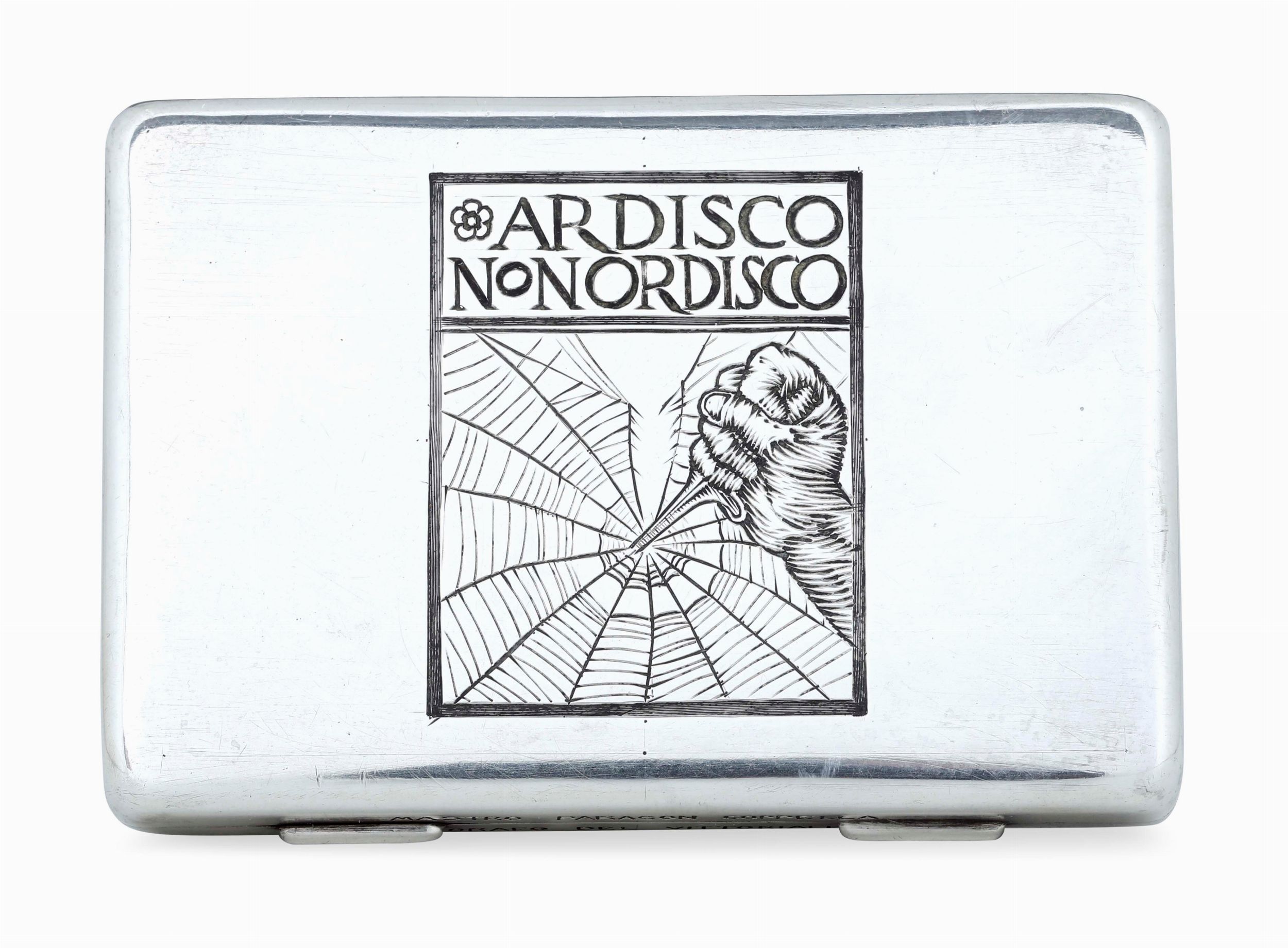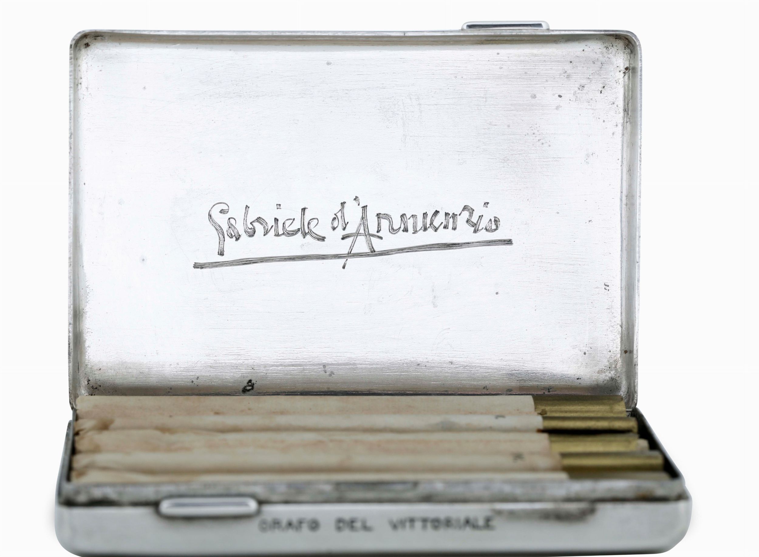 Sulla fascia frontale incisa la dicitura 'MASTRO PARAGON COPPELLA-ORAFO DEL VITTORIALE' e sotto il coperchio incisa la firma autografa di Gabriele d'Annunzio. L'origine del motto di battaglia 'ARDISCO NON ORDISCO' inciso sul coperchio e tradotto in immagine per il Vate dal pittore e incisore Adolfo de Carolis (1874-1928), è legato al discorso tenuto da d'Annunzio nel maggio del 1919 al teatro Augusteo di Roma contro il presidente statunitense T.W.Wilson che, negli accordi di pace seguiti alla prima guerra mondiale, voleva negare la città di Fiume all'Italia e che precedette di pochi mesi la presa della città da parte dei legionari guidati da d'Annunzio e nacque per smentire inequivocabilmente la sua partecipazione al complotto ordito da Mussolini, si dice con la protezione del Duca d'Aosta Emanuele Filiberto anch'egli sostenitore delle pretese italiane su Fiume, contro il governo legittimo in carica prima della marcia su Roma dell'Ottobre 1922 e segna uno dei significativi momenti del distacco del Vate dal pensiero e dall'azione del Duce e del fascismo. All'interno della scatola sono conservate alcune sigarette Abdulla N.ro 11, le preferite dal poeta come, testimoniato in uno stralcio dall'intenso carteggio tra lo stesso e Mario Buccellati tratto da una missiva datata 11 dicembre 1926. 'Mio caro Mario Tutte queste opere d'orafo sono eccellenti. Nella scatola con l'impresa incisa della mia 'Squadriglia' ho già messo le mie sigarette Abdulla N.ro 11. Ora ti prego di rinnovare le scatole d'argento con l'impresa Ardisco non Ordisco incidendo la firma autografa nella faccia interna del coperchio' Vedi Gabriele d'Annunzio e Mario Buccellati. 'Vorrei un gioiello strano' Carteggio 1922-1937 a cura di Francesca Giraldo. Silvana Editoriale 2016 AP n' 34451 pag. 83
