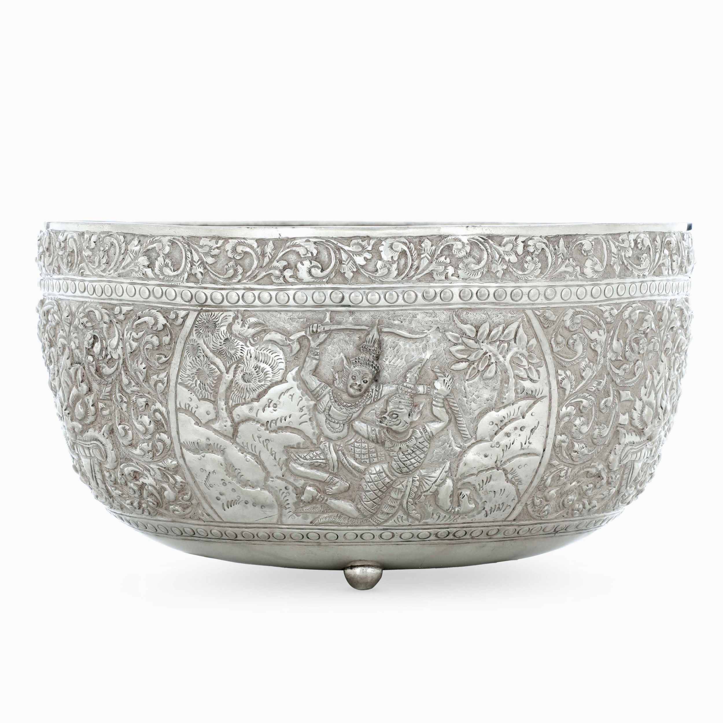 Ciotola cesellata a mano con raffigurazioni dal poema epico Ramakien. Siam (Thailandia), [..]