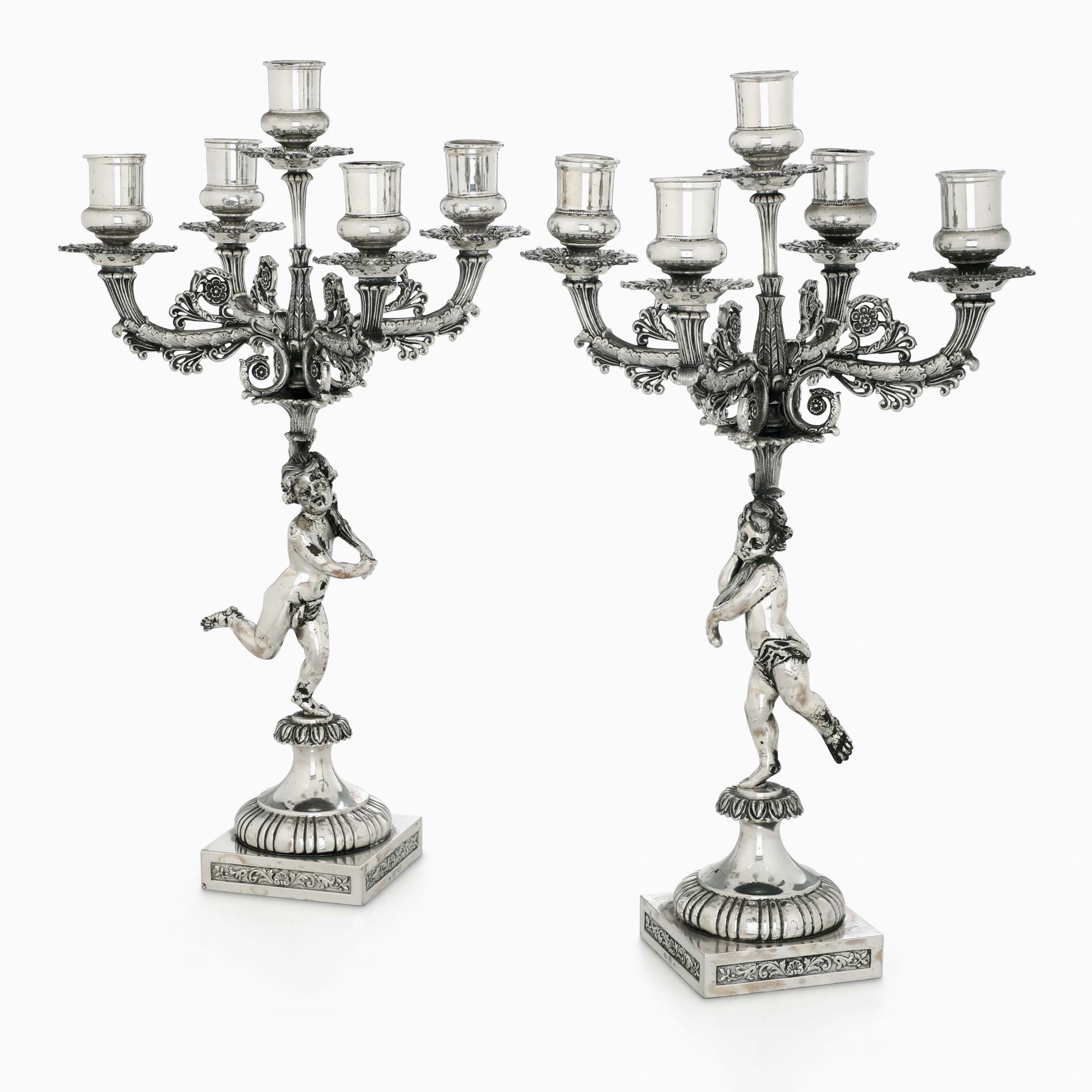 Coppia di candelabri a cinque fiamme. Argenteria artistica milanese del XX secolo. [..]