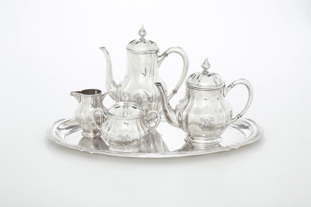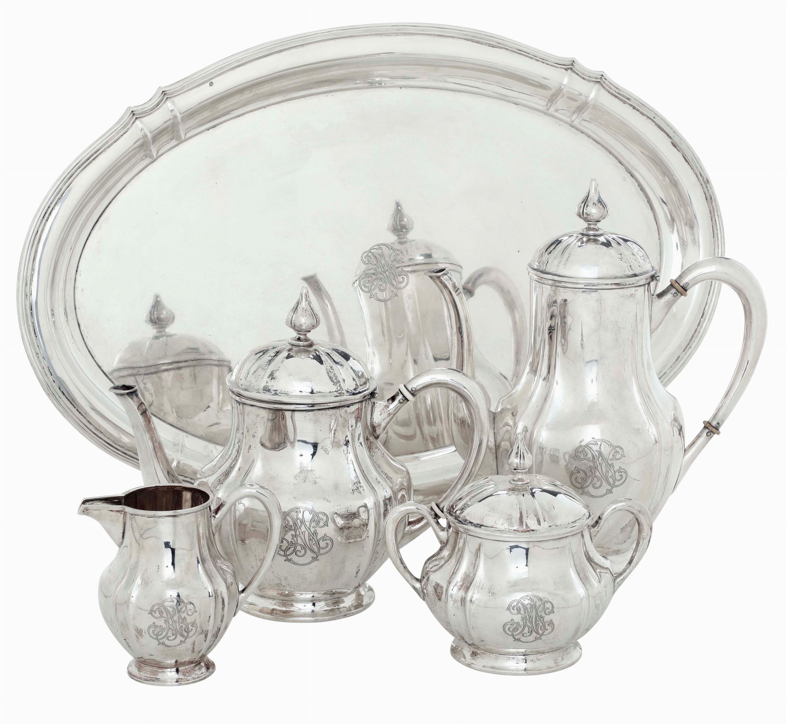 Servizio da tè e caffè con vassoio. Argenteria tedesca, inizi del XX secolo